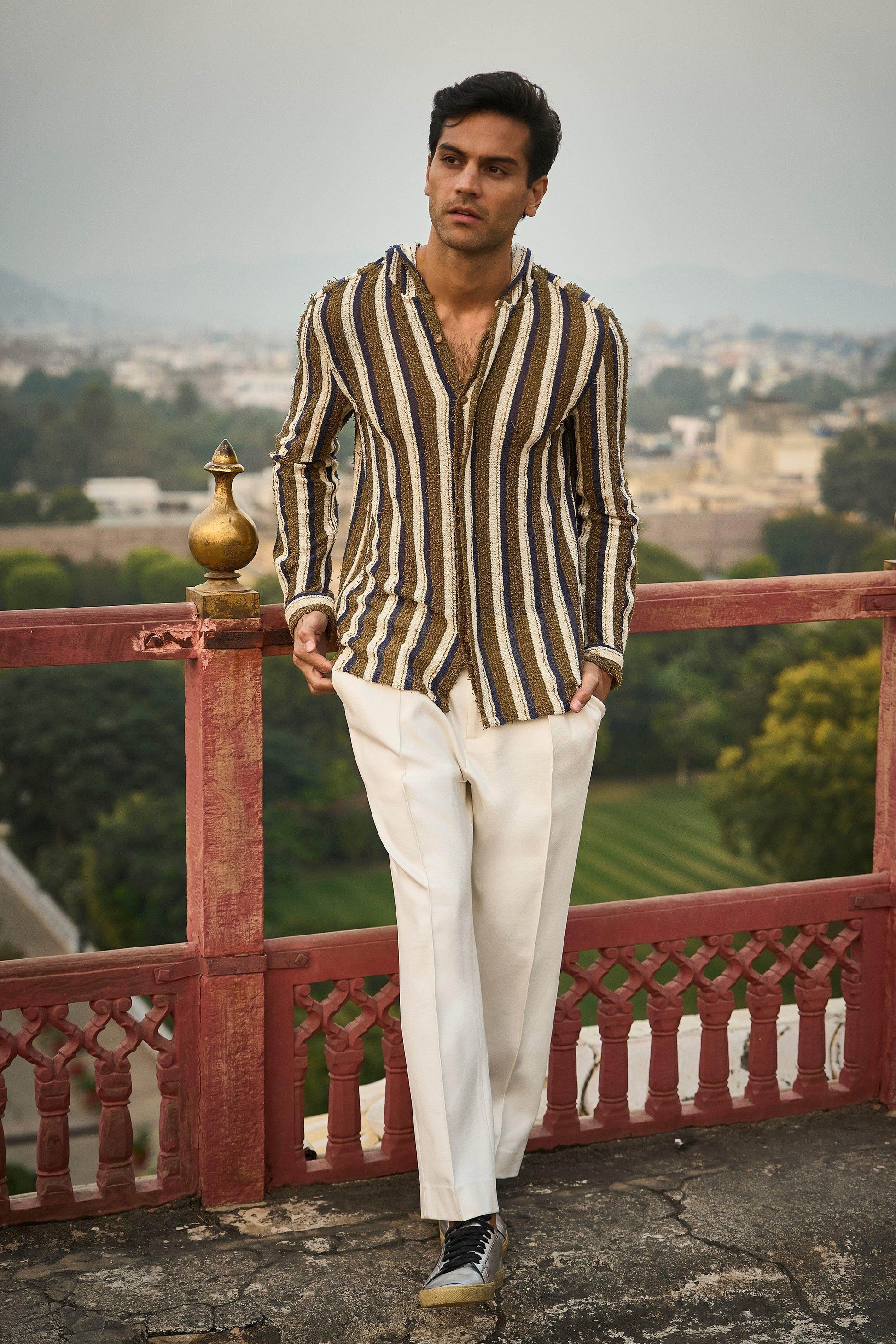 Straight cut off-white knitted pant. Pintuck detailing down the front. Semi elasticated at the waist with a gold snap button and zip closure. Belt loops at the waist, pockets in the side and back.