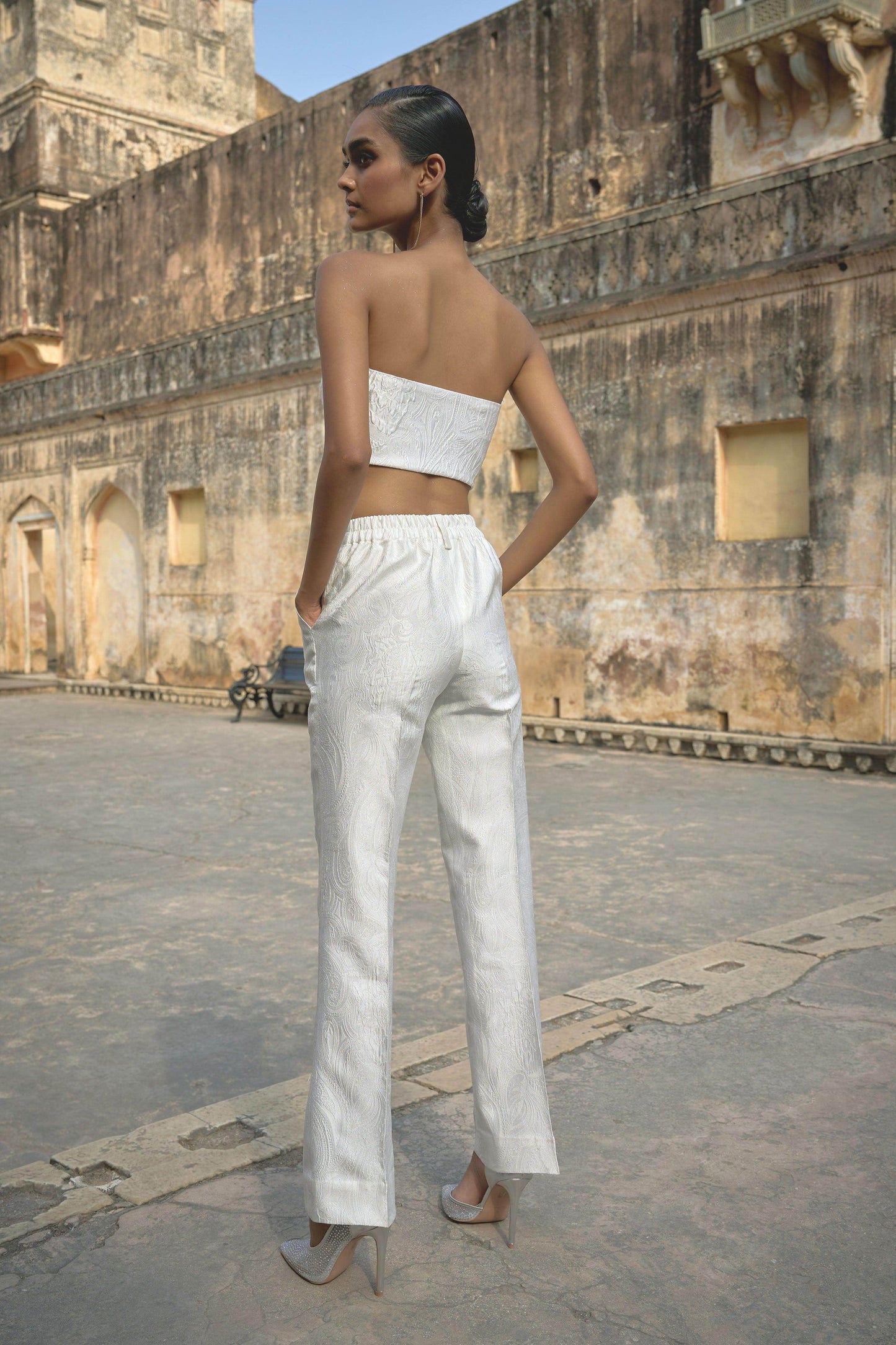 Tone on tone ivory jacquard. Straight pant with pockets in the sides. Semi elasticated with belt loops at the waist. Hook/eye and zipper closure in the front.