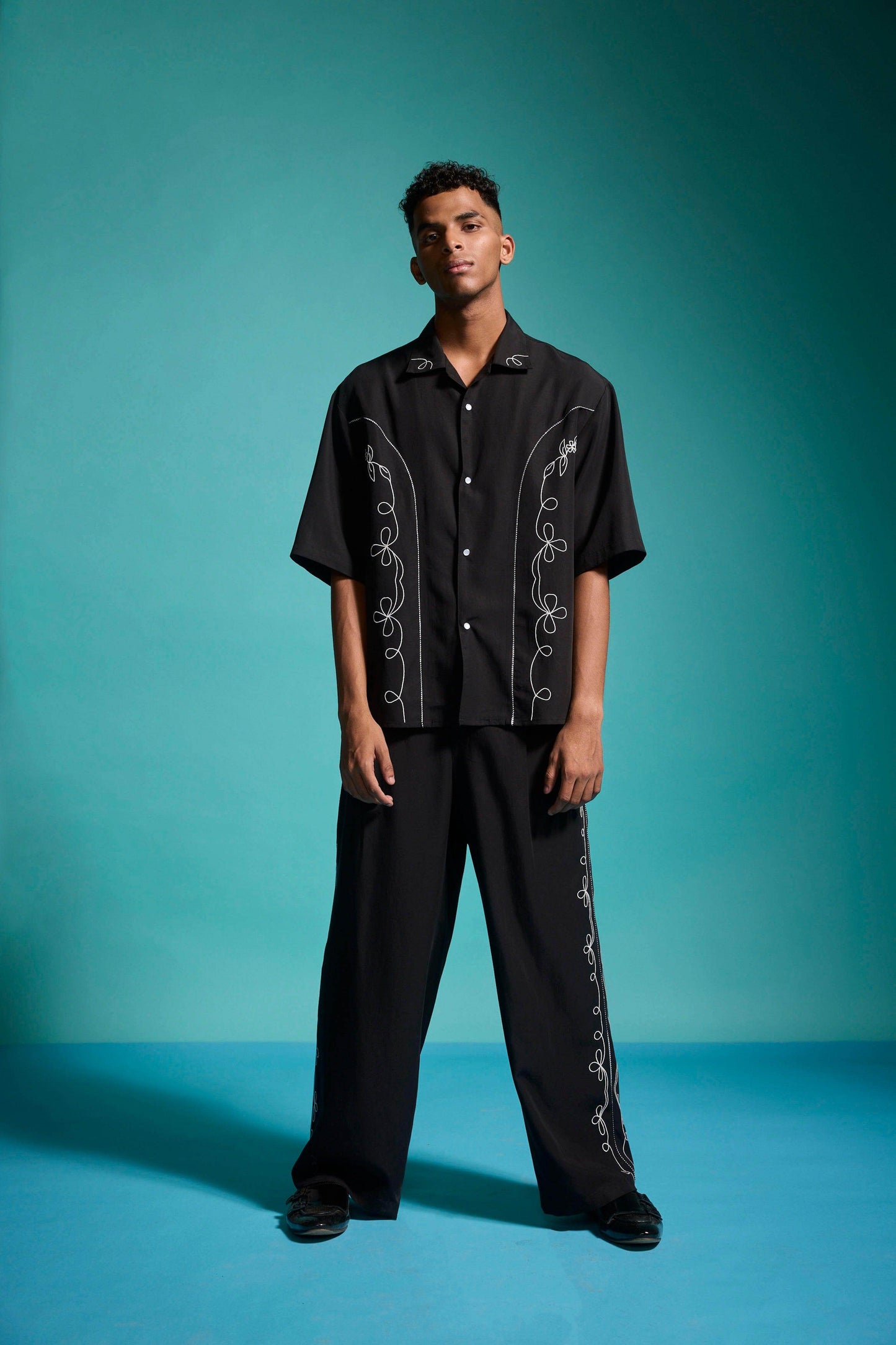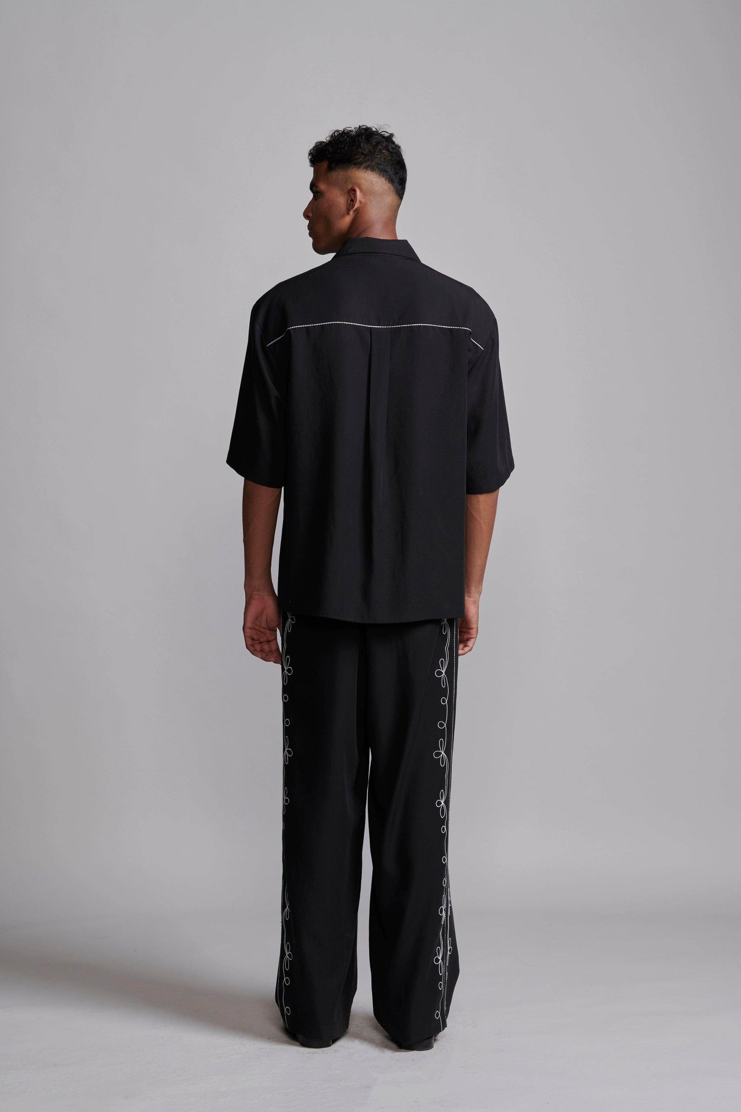 Black relaxed-fit shirt in sustainable, breathable Tencel. Contrast white embroidery down the front framed with black-and-white piping along the princess seams. Half sleeves with a notch collar. Snap button placket. Box pleat with piping at the back yoke. Side seam slits.