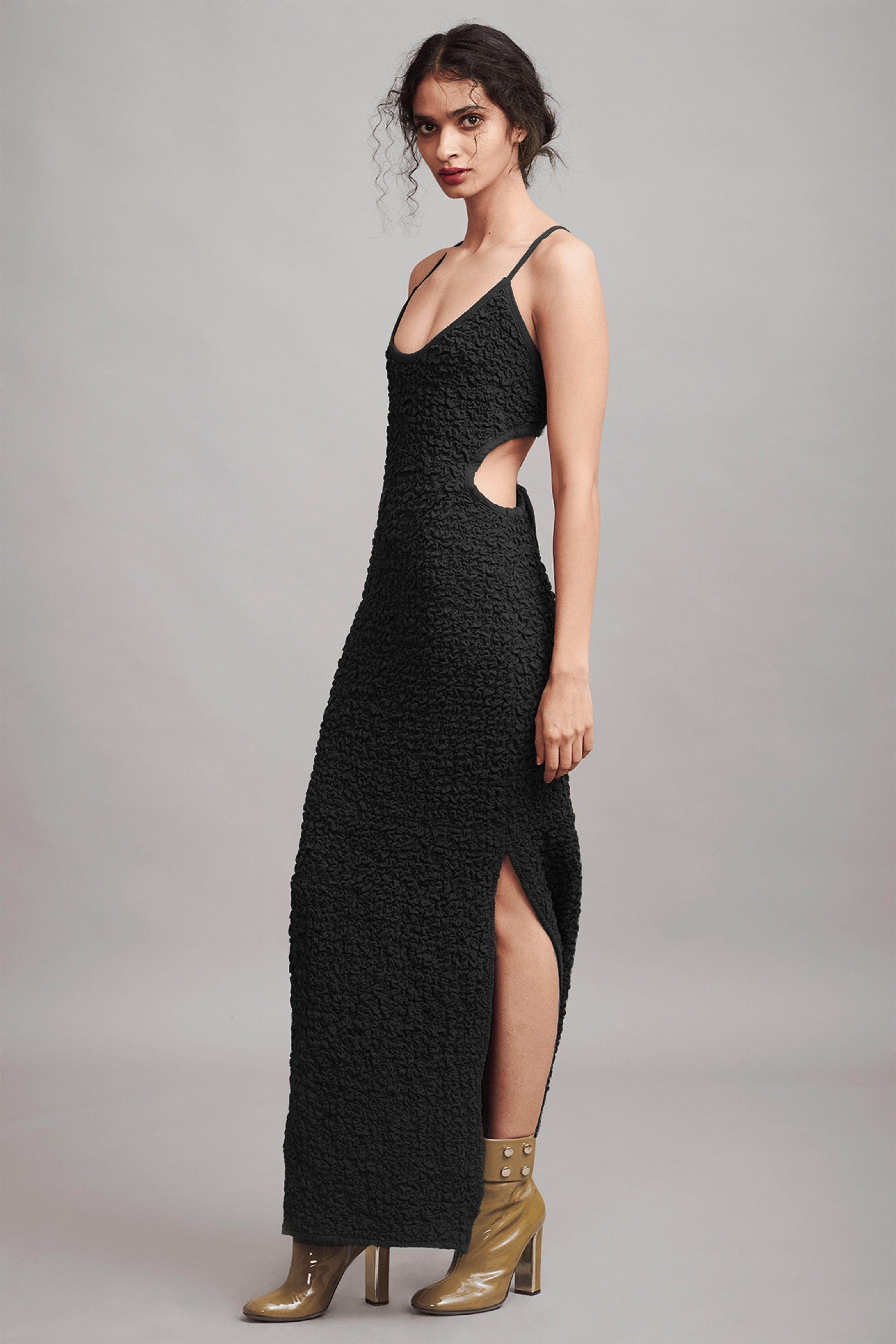 Softly smocked maxi dress with waist cut-out detail. Self-tie exposed back. Scoop neck, side vents at the bottom. Bodycon silhouette.