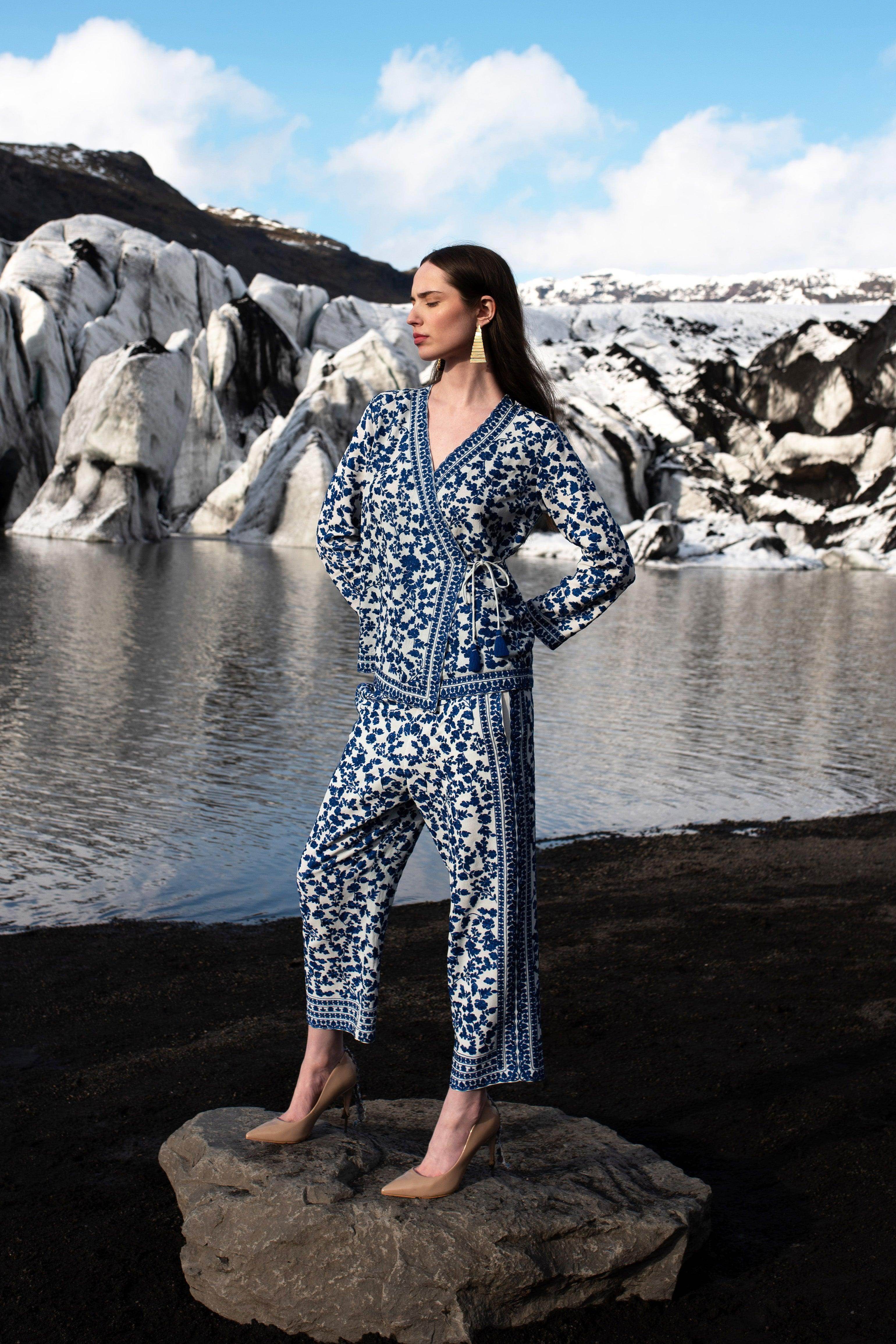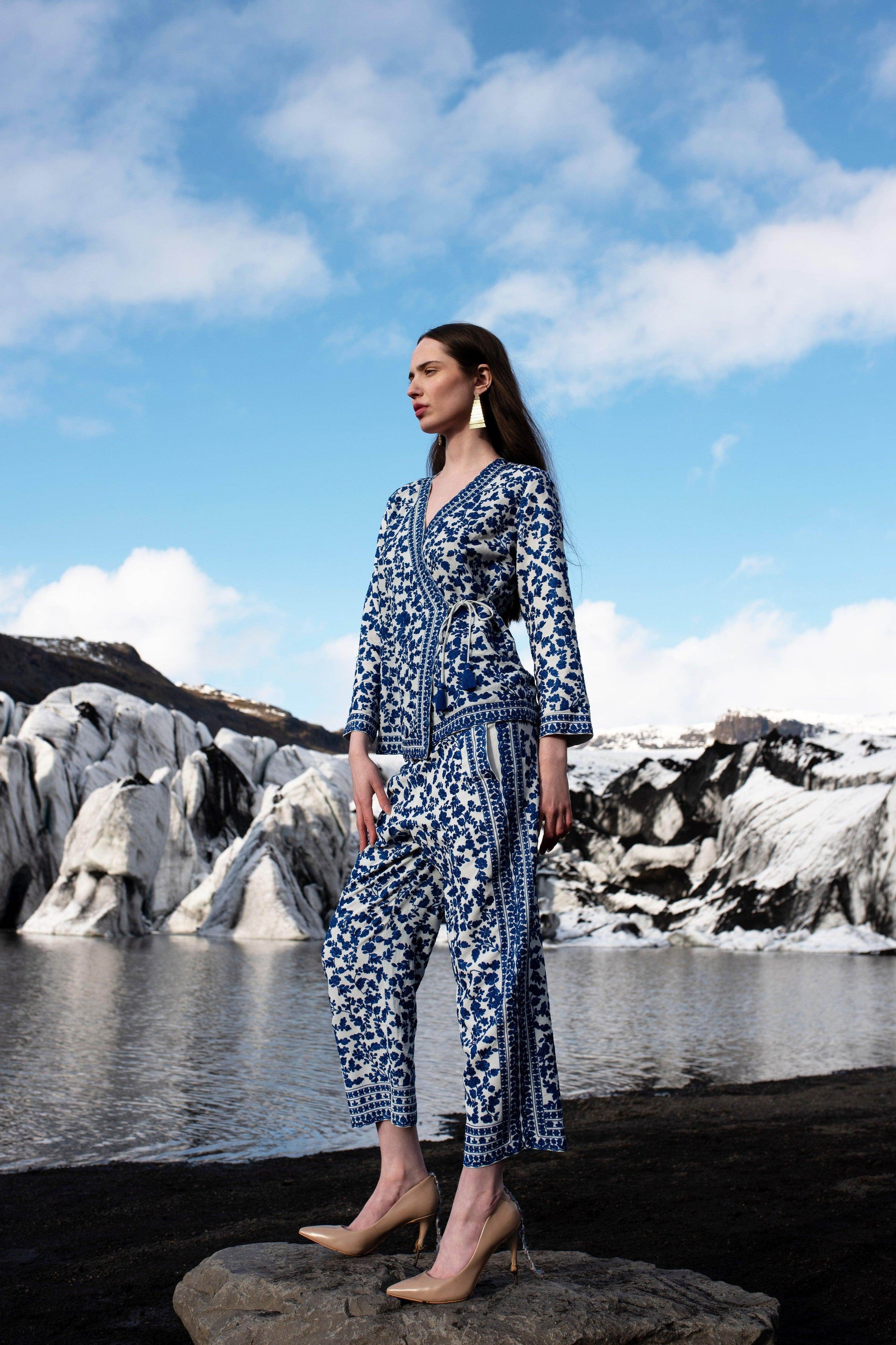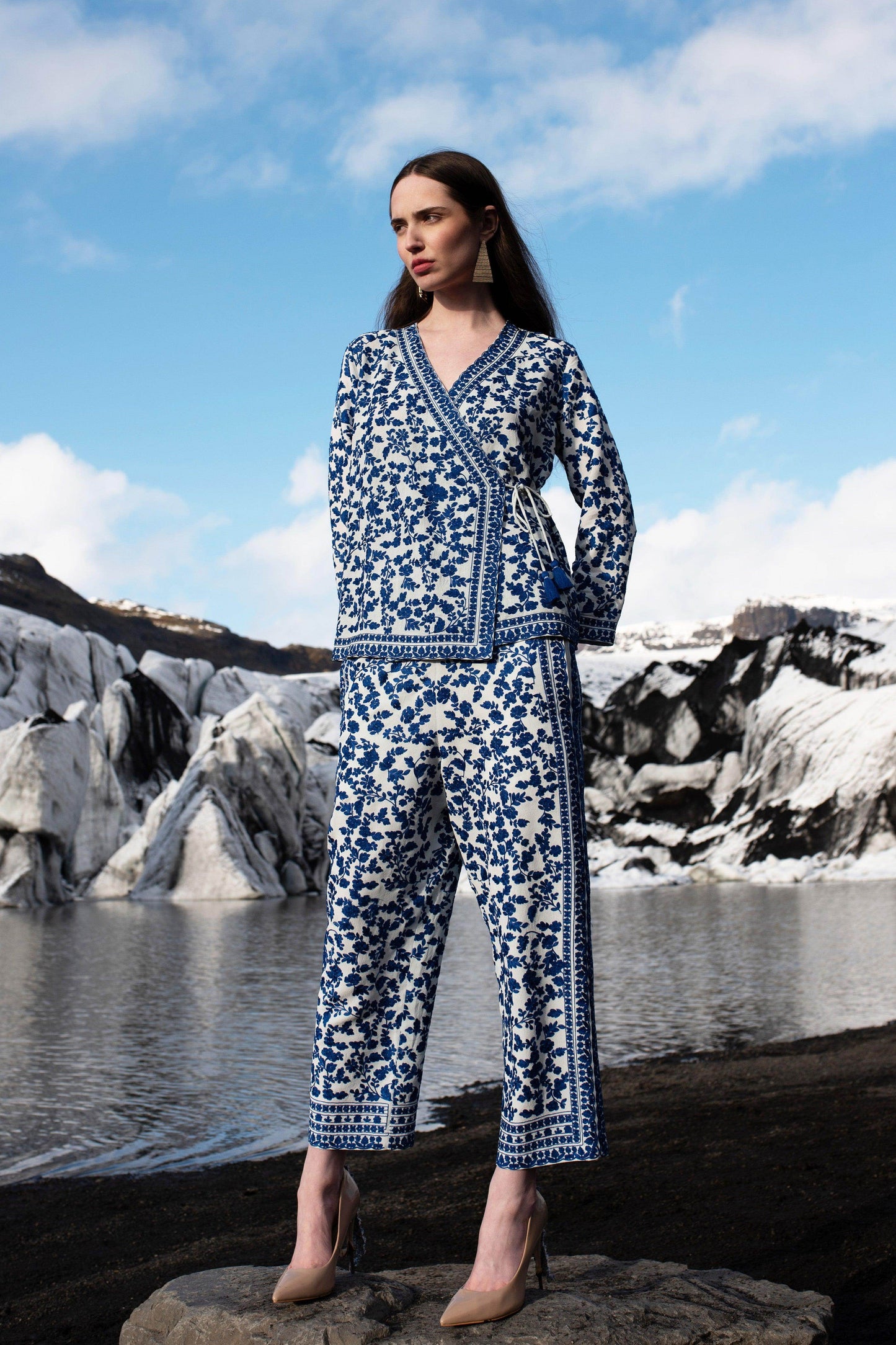 Striking royal blue Ari stitch inspired embroidery on a soft powder blue base. Floral resham allover embroidery framed with dramatic placed borders on the front and bottom hem of the top. Front overlapping relaxed fit top with a dori and tassel side tie detail. Textured all season summer viscose.