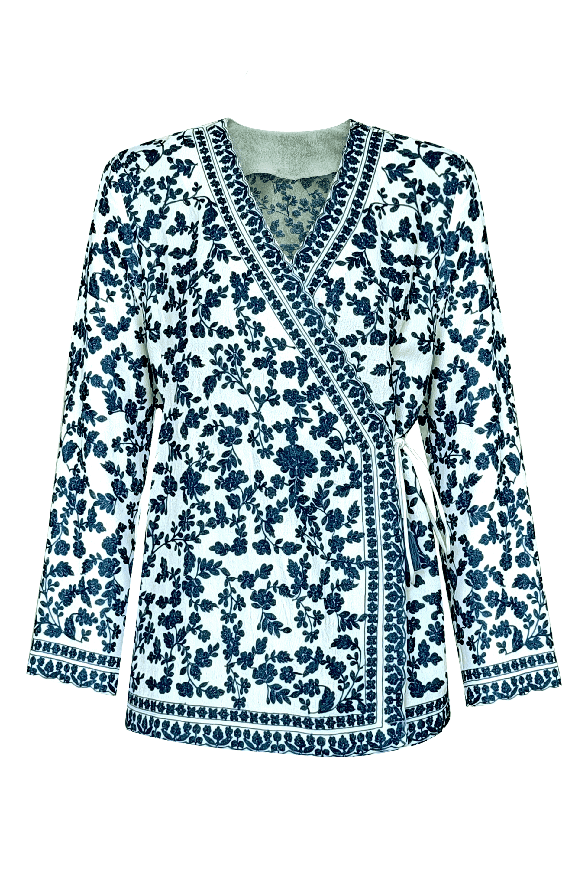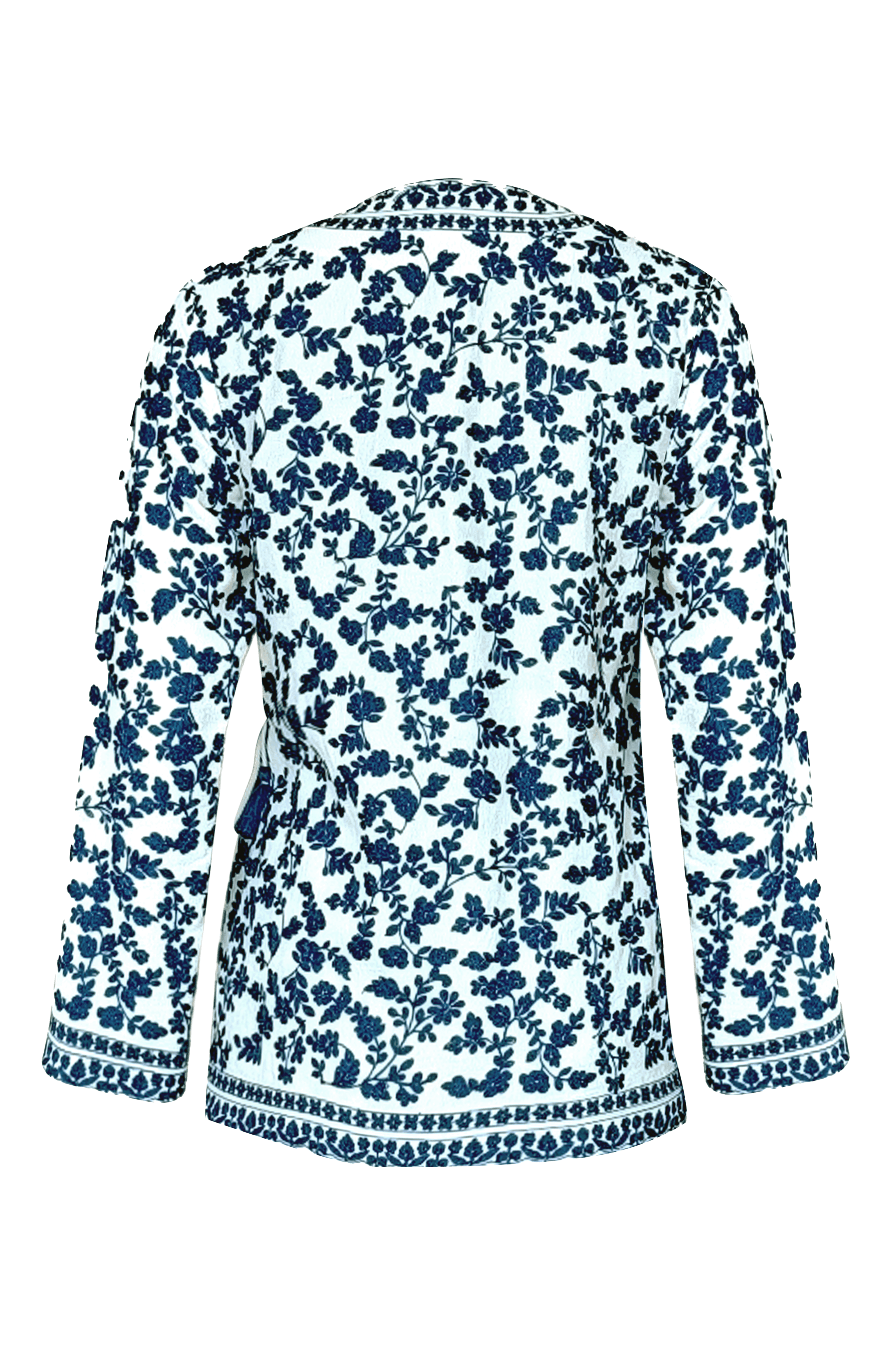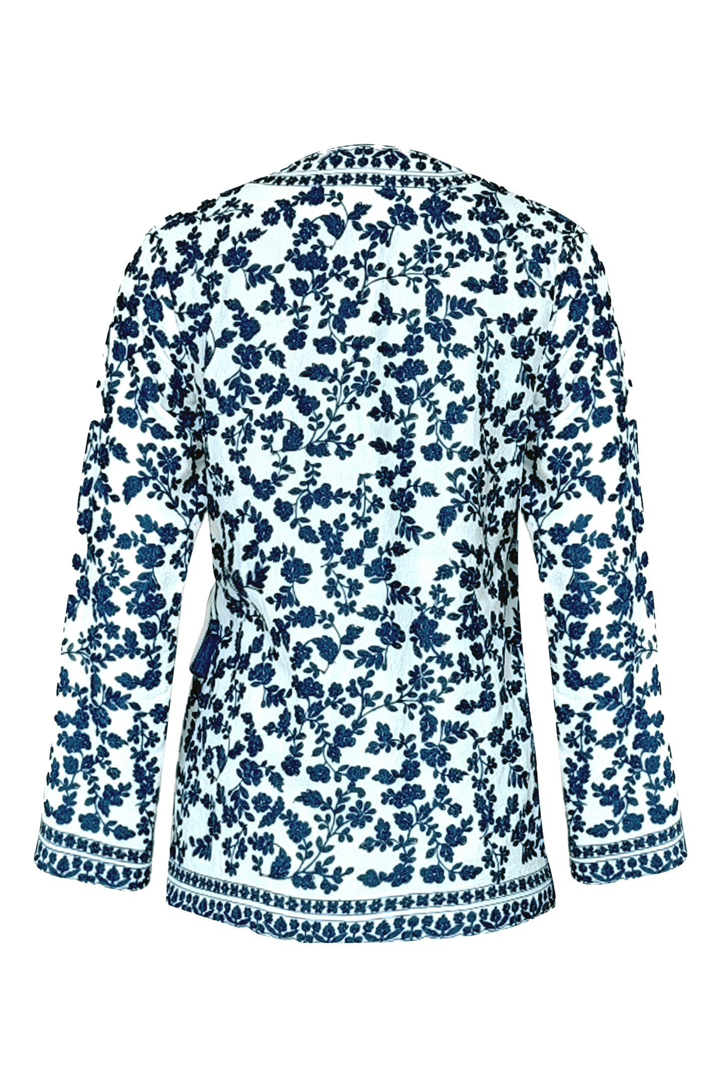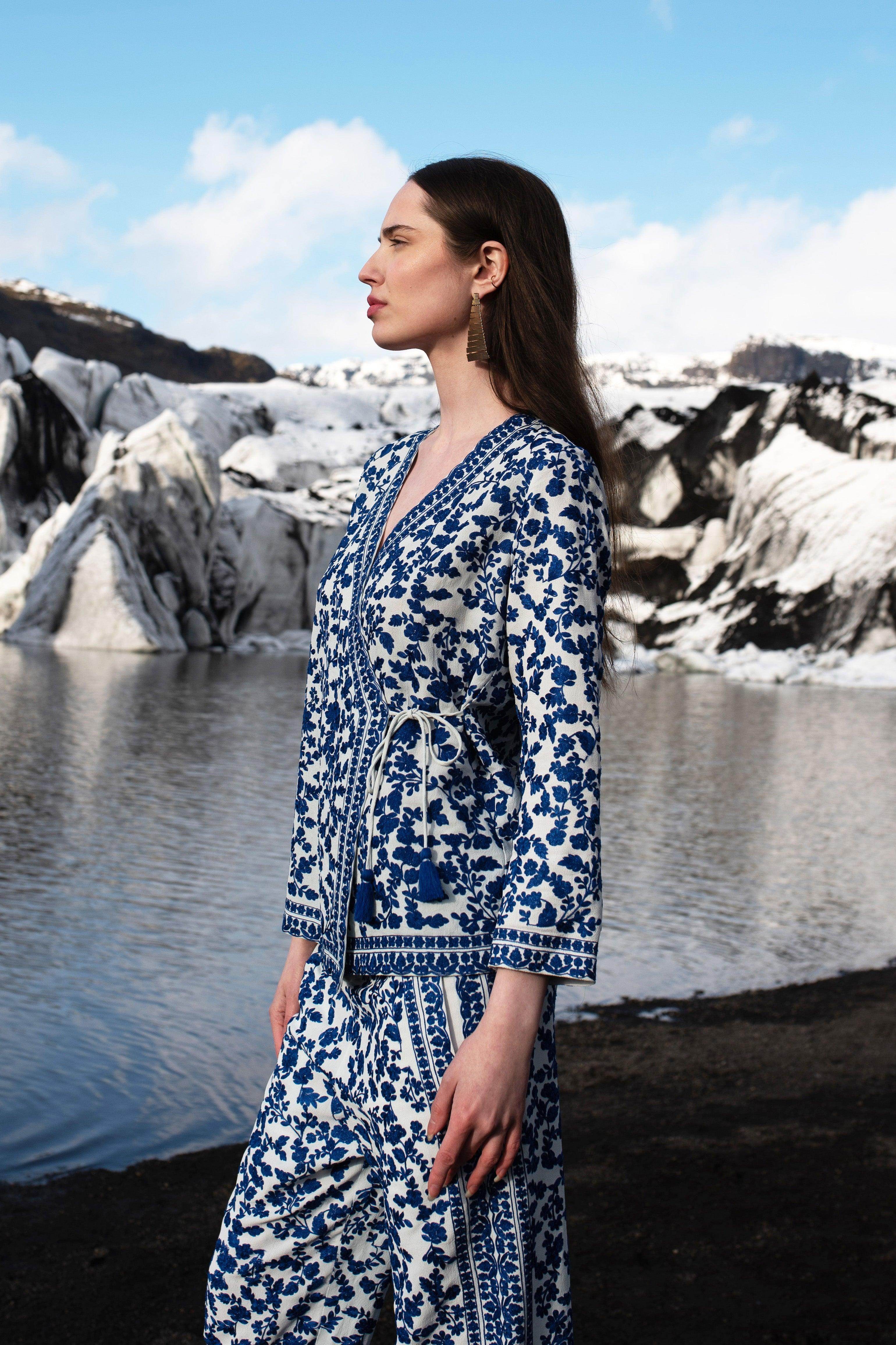 Striking royal blue Ari stitch inspired embroidery on a soft powder blue base. Floral resham allover embroidery framed with dramatic placed borders on the front and bottom hem of the top. Front overlapping relaxed fit top with a dori and tassel side tie detail. Textured all season summer viscose.