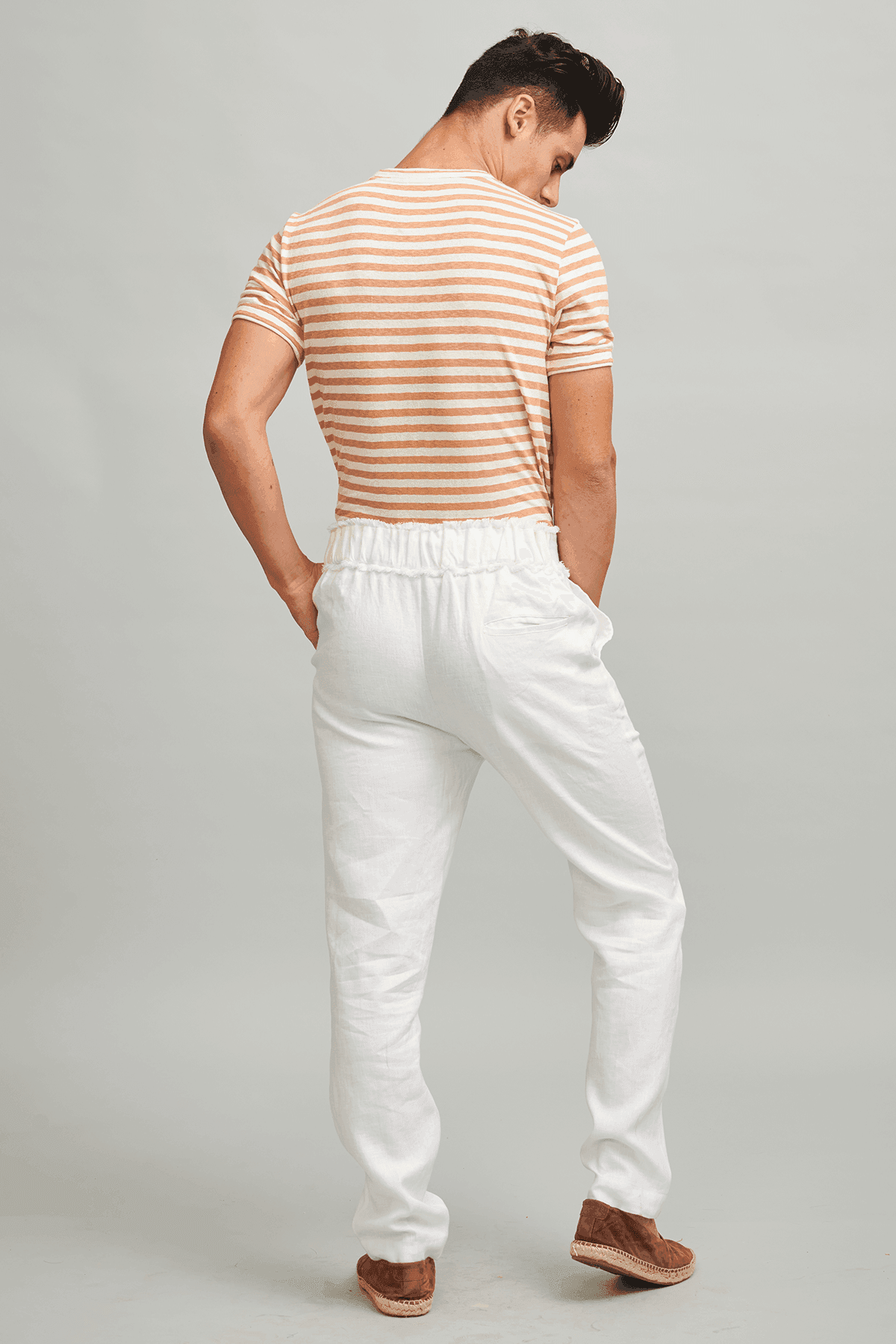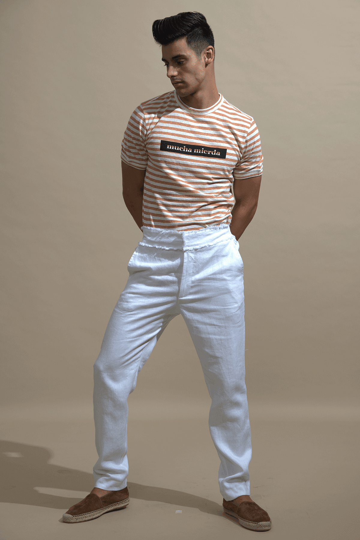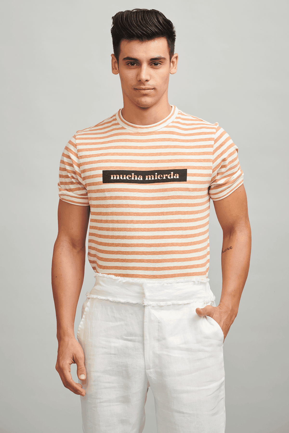 Basic stripe short sleeve tee with contrast 'mucha mierda' (Spanish: a lot of shit) print on the front. Tonal rib detail at neck and sleeve. Boxy, cropped shape with a raw hem. Orange and white slub stripe.