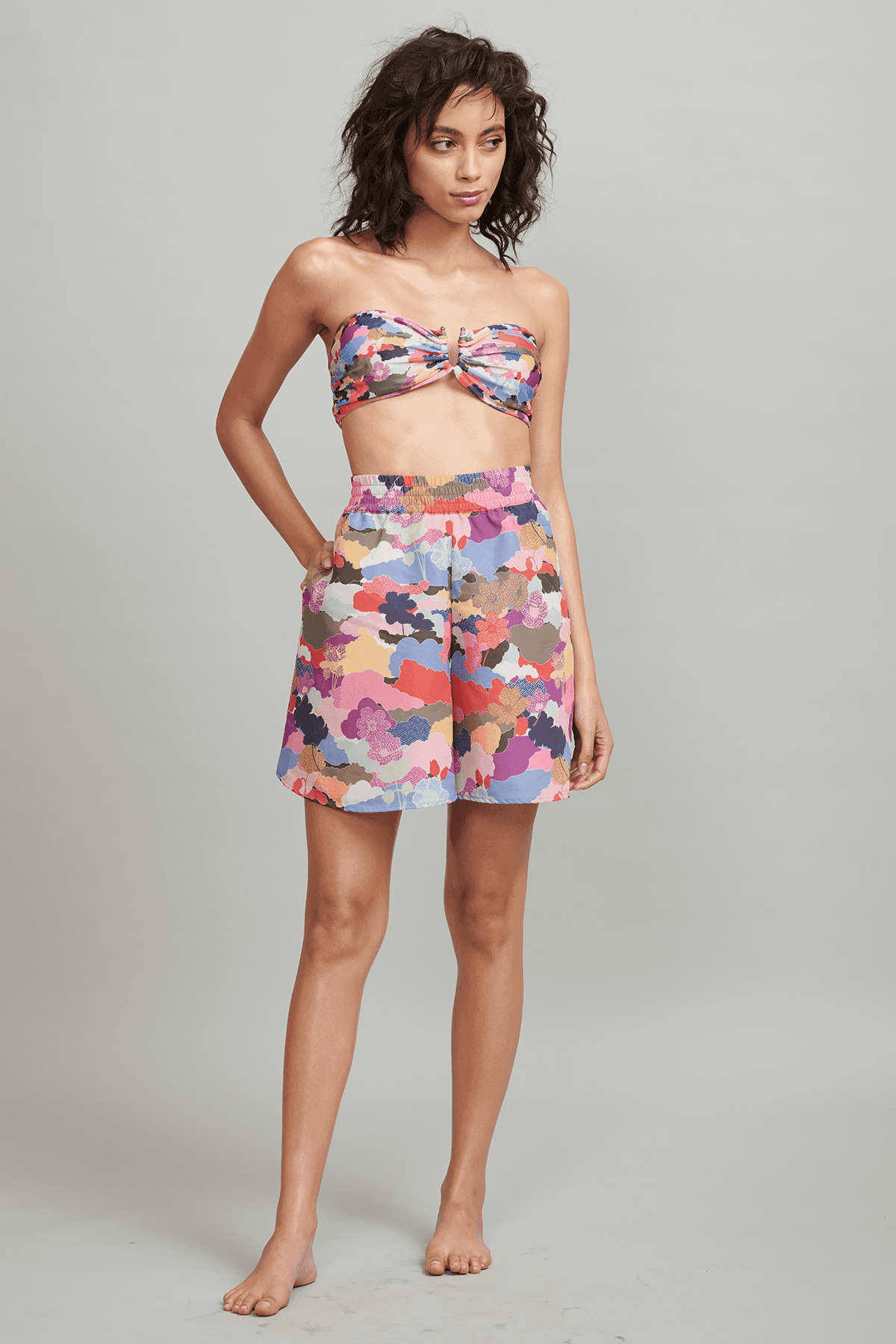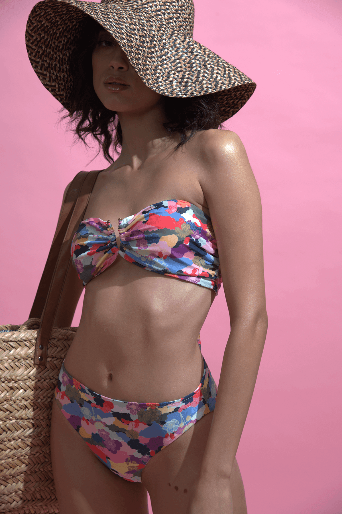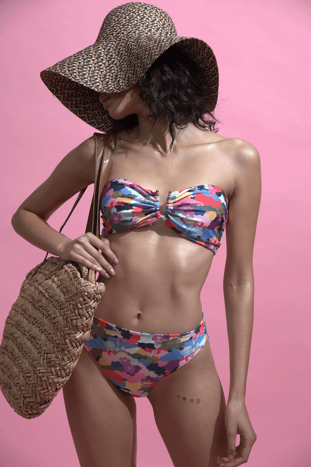 Bright multicolor print inspired by a busy landscape. U-shaped metal hardware. Made of high-performance, sustainable techno-fabric; 100% recycled polyester from pre and post-consumer materials. Resistant to chlorine, suntan creams, and oils.