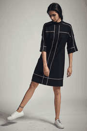High-neck shift dress with drop shoulder. Features contrast-stitch geometric lines. Comfort fit.