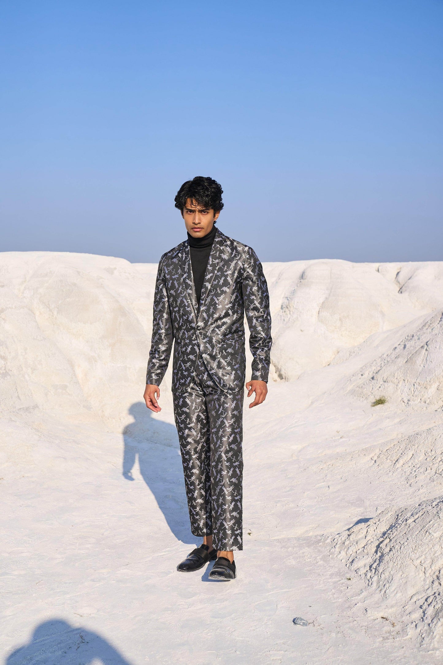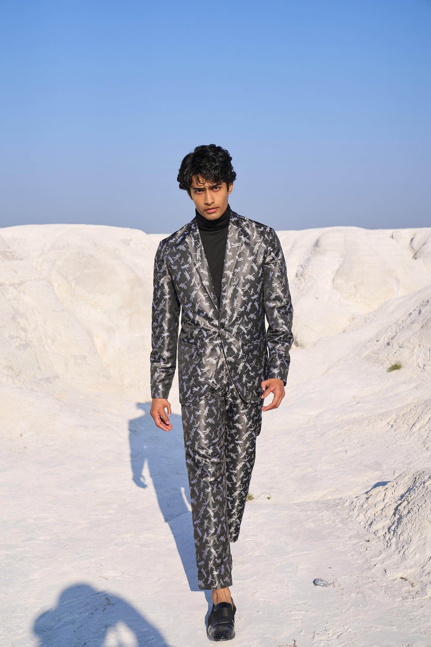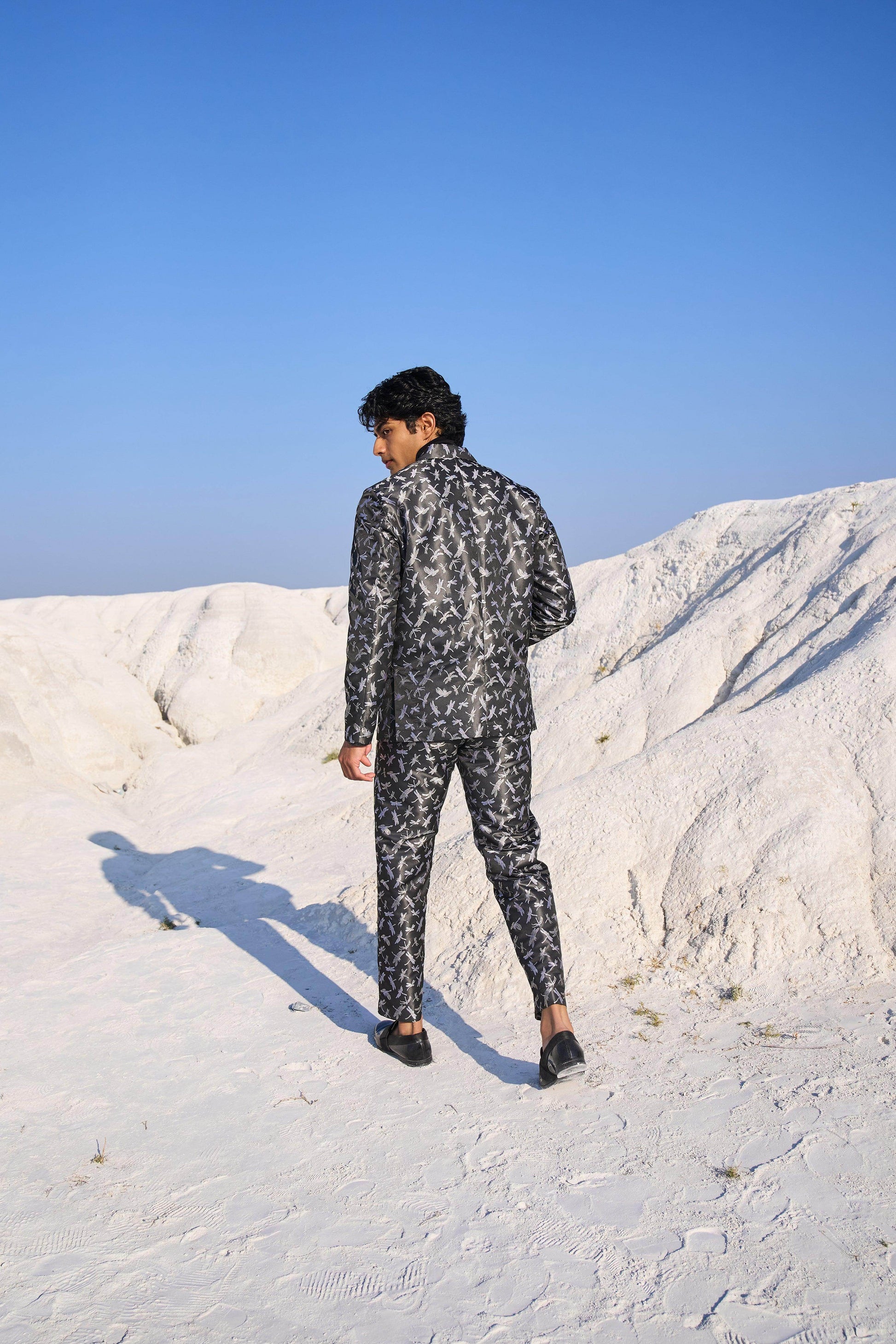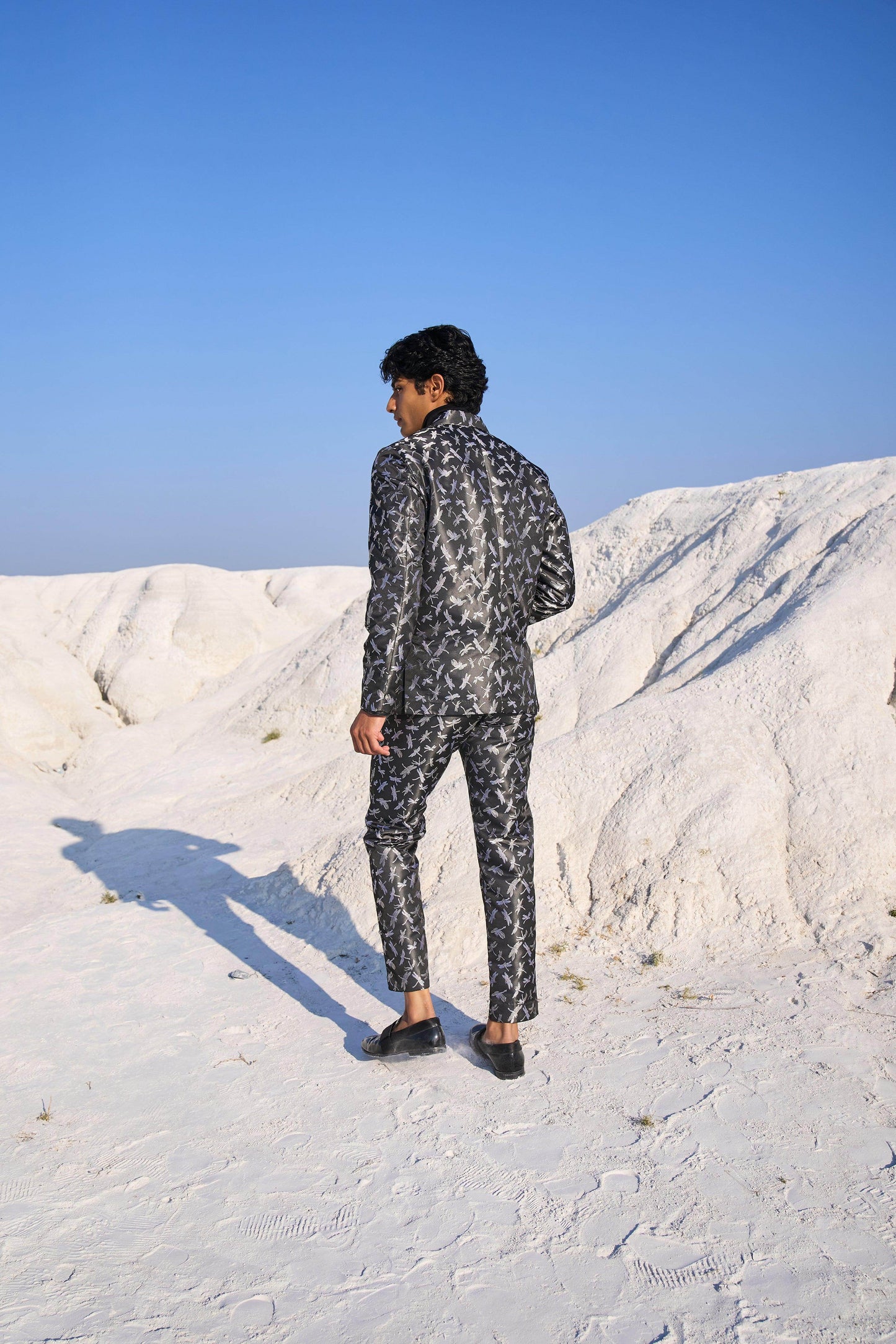 Dragon fly patterned black blazer jacket in soft brocade style jacquard. Single button closure and pockets at the front.