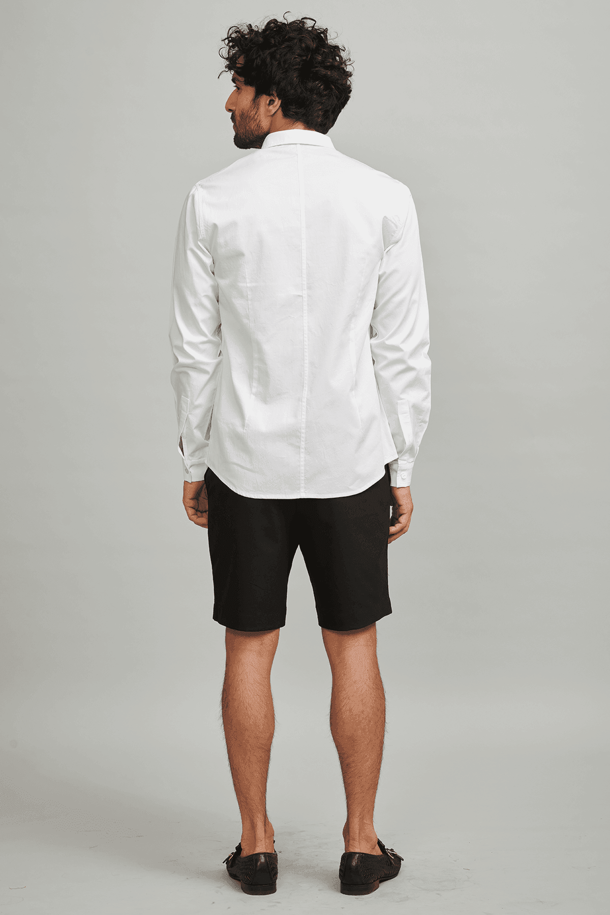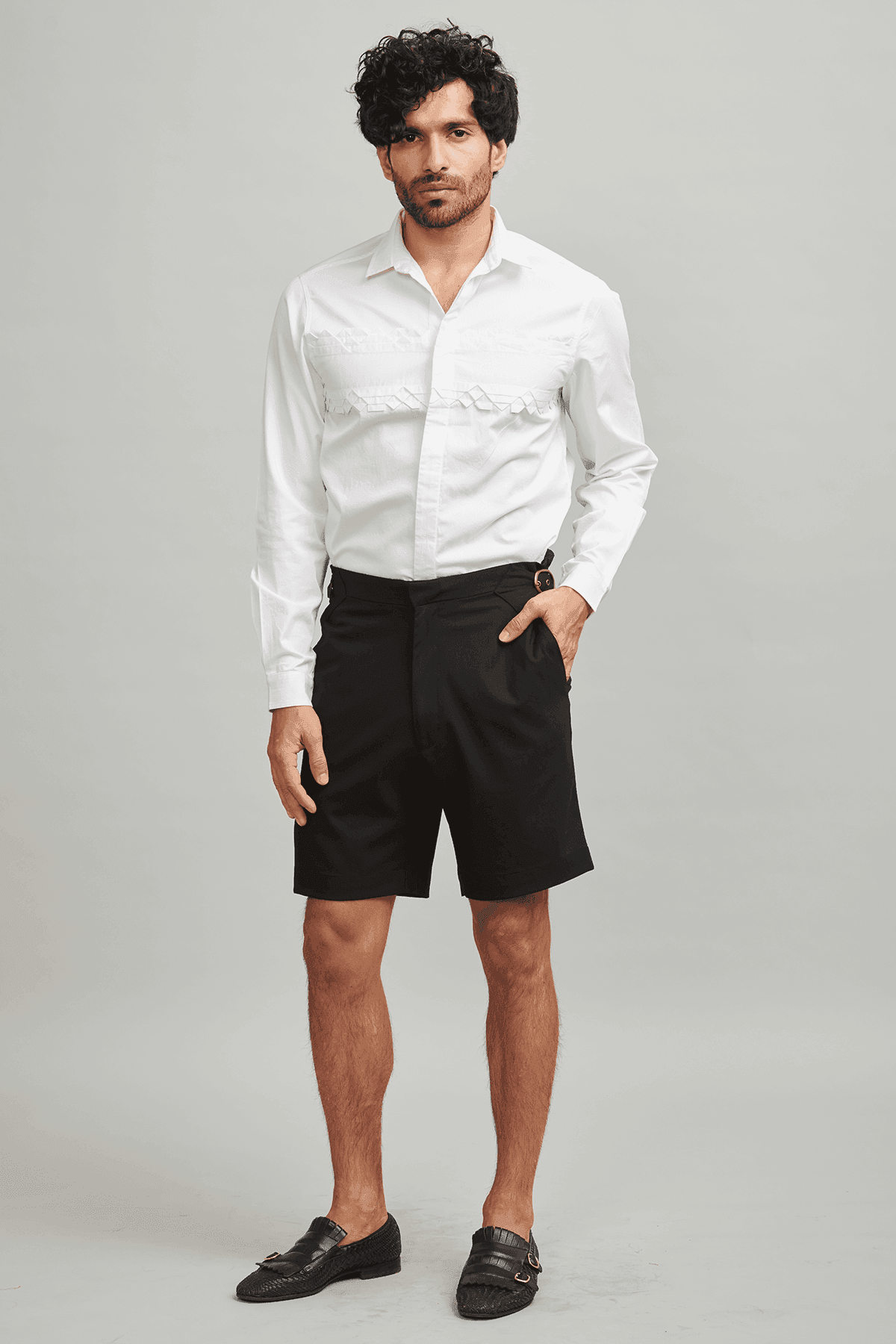 White poplin full sleeve shirt with patterned knife pleating detail across the front.