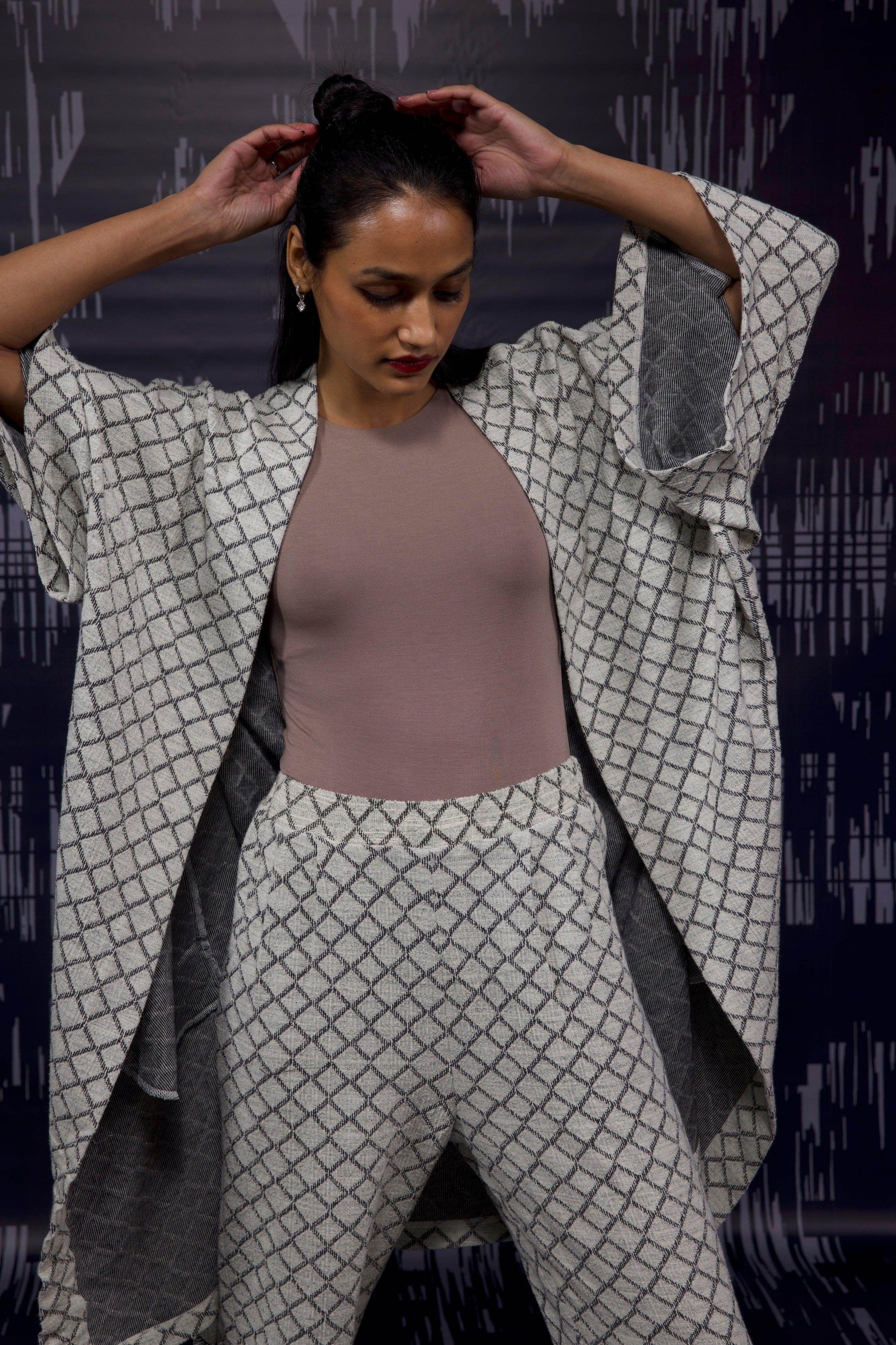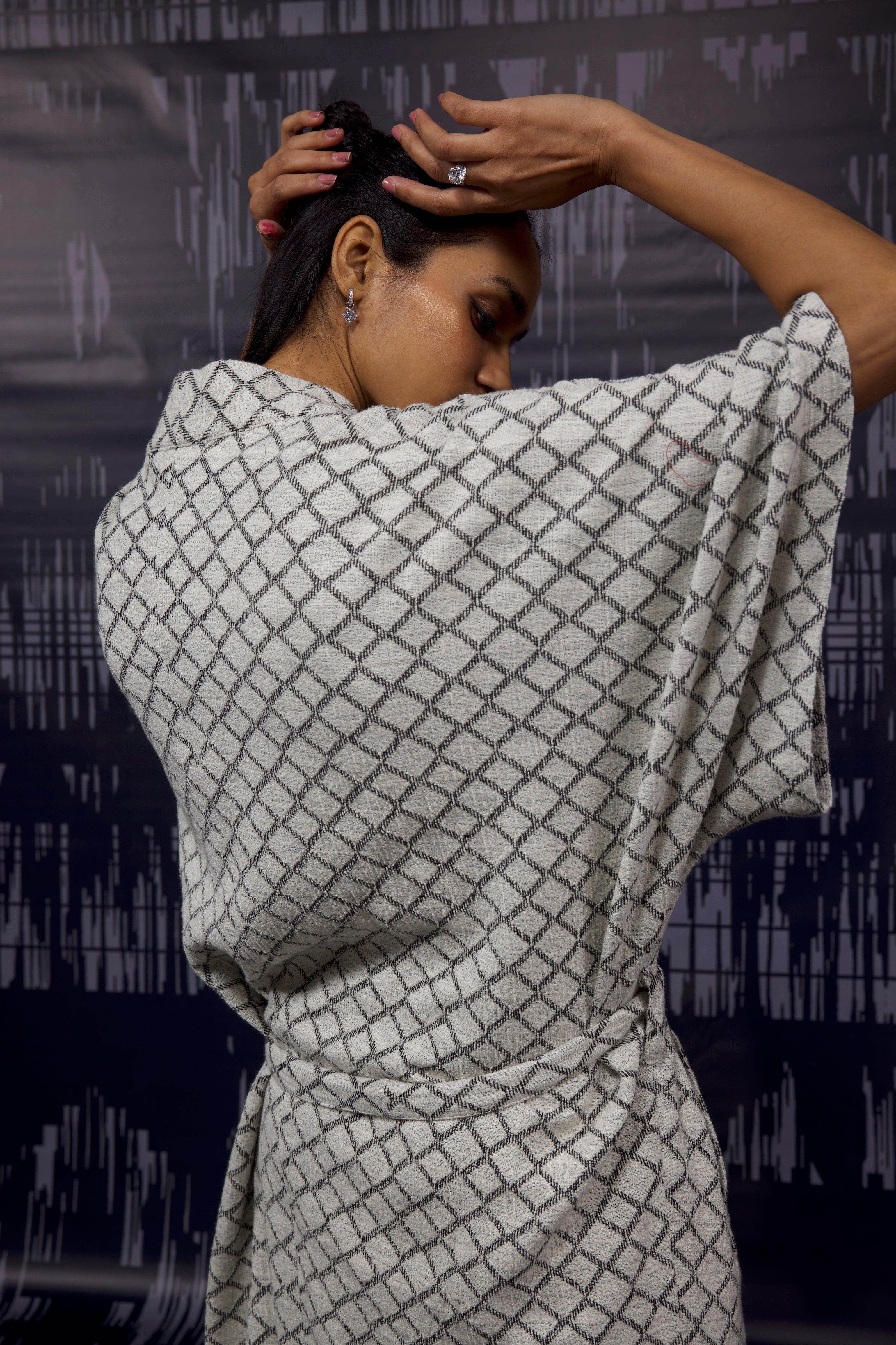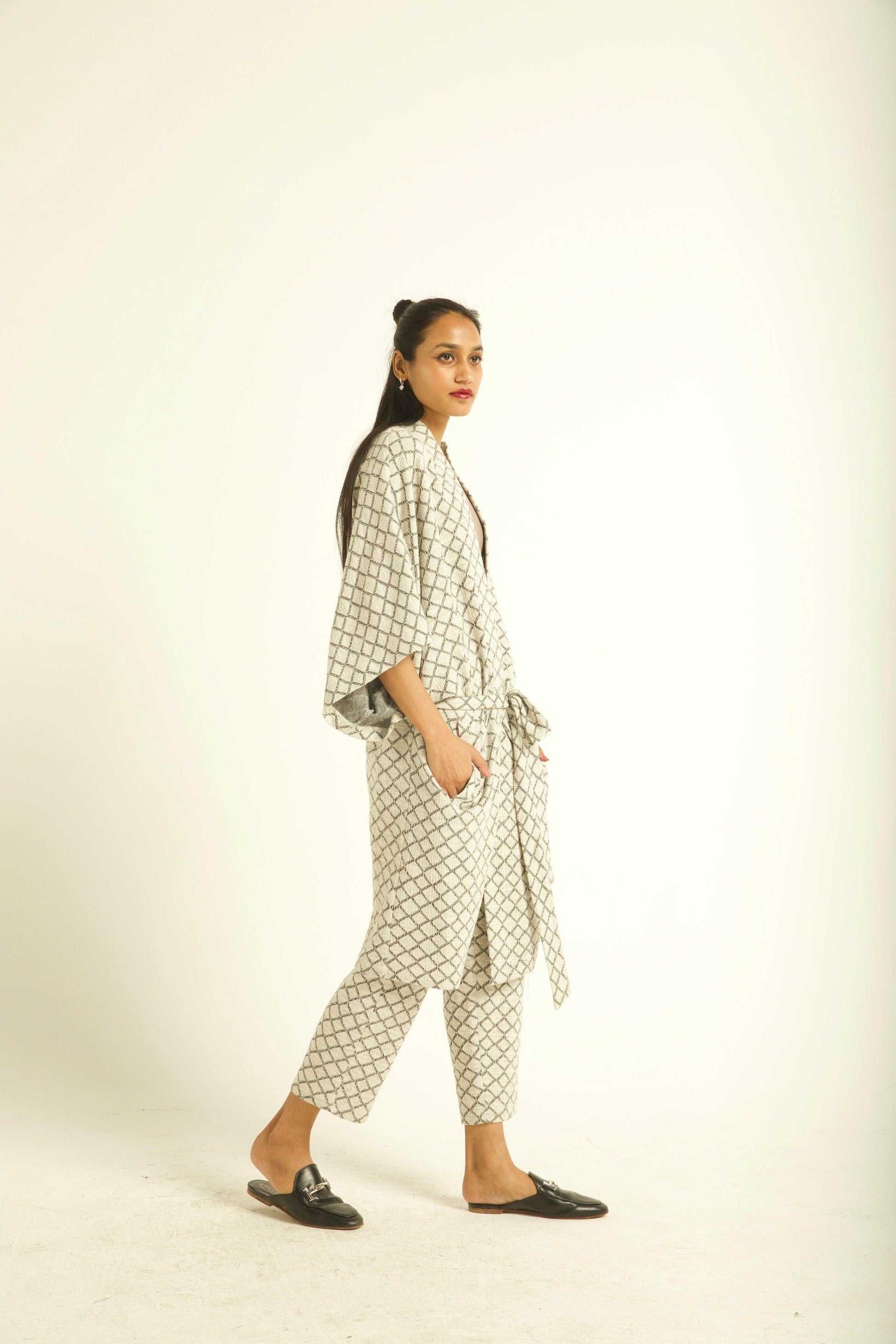 Front open diamond check jacquard robe. Dolman, kimono-inspired sleeves, self-tie waistbelt and front pockets. Matching straight fit elasticated pants. Side pockets.