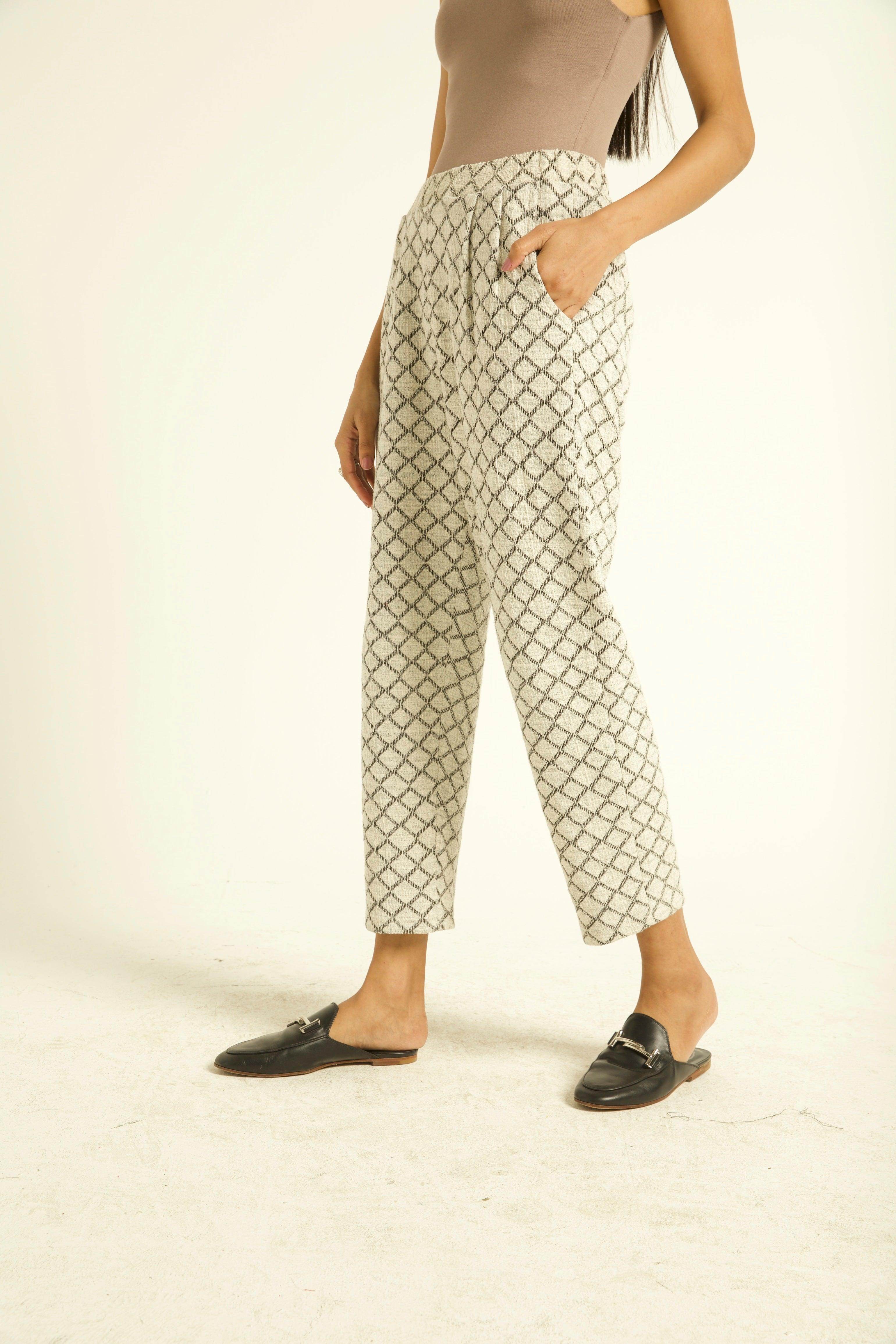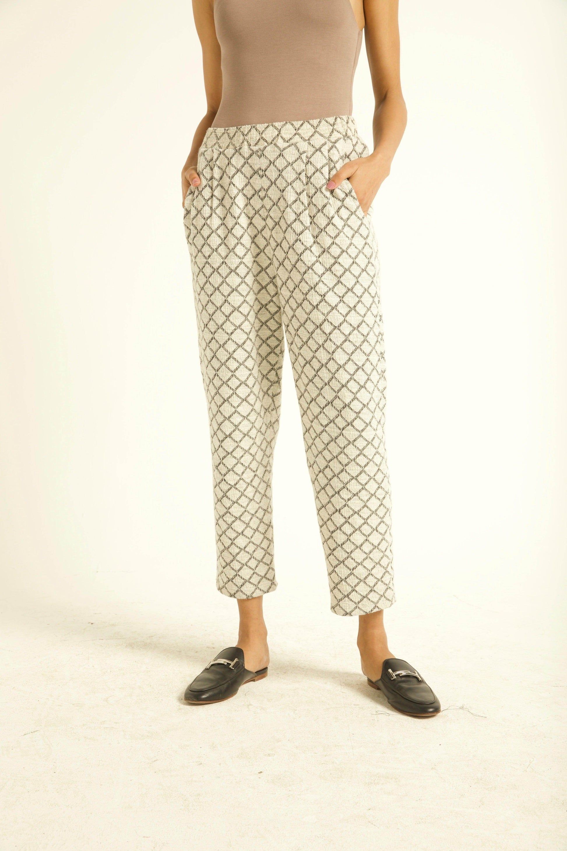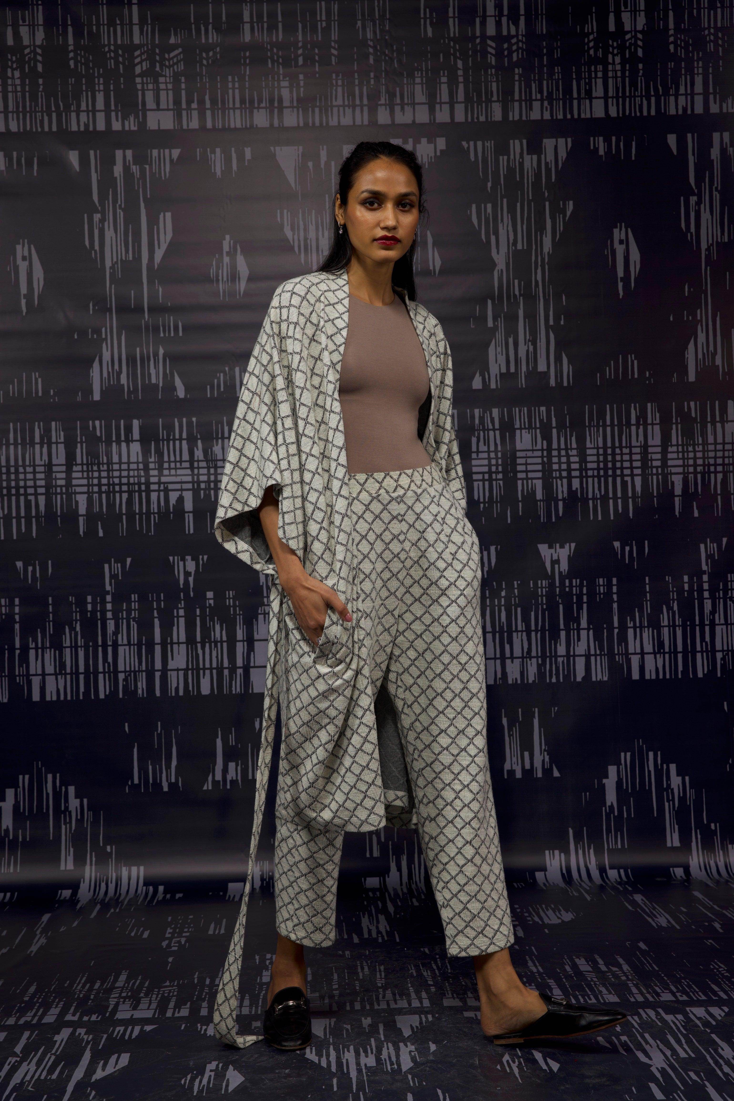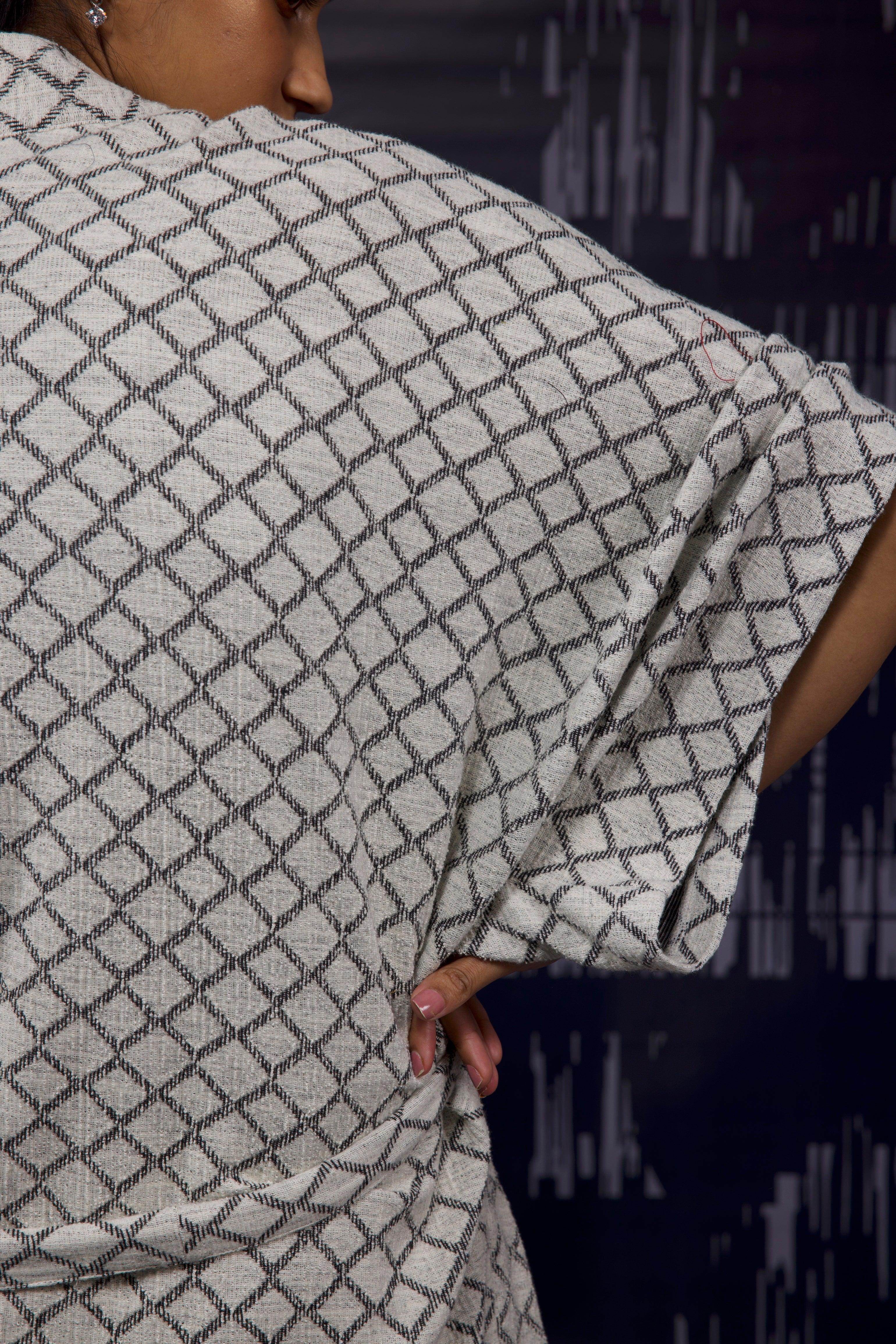 Front open diamond check jacquard robe. Dolman, kimono-inspired sleeves, self-tie waistbelt and front pockets. Matching straight fit elasticated pants. Side pockets.