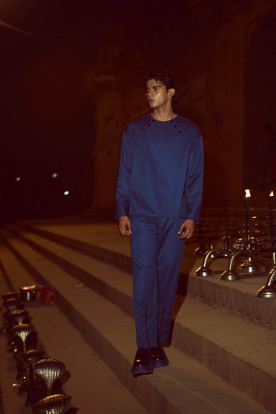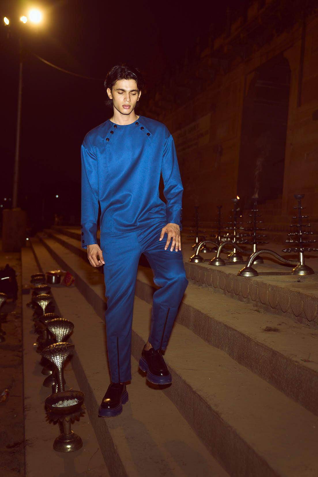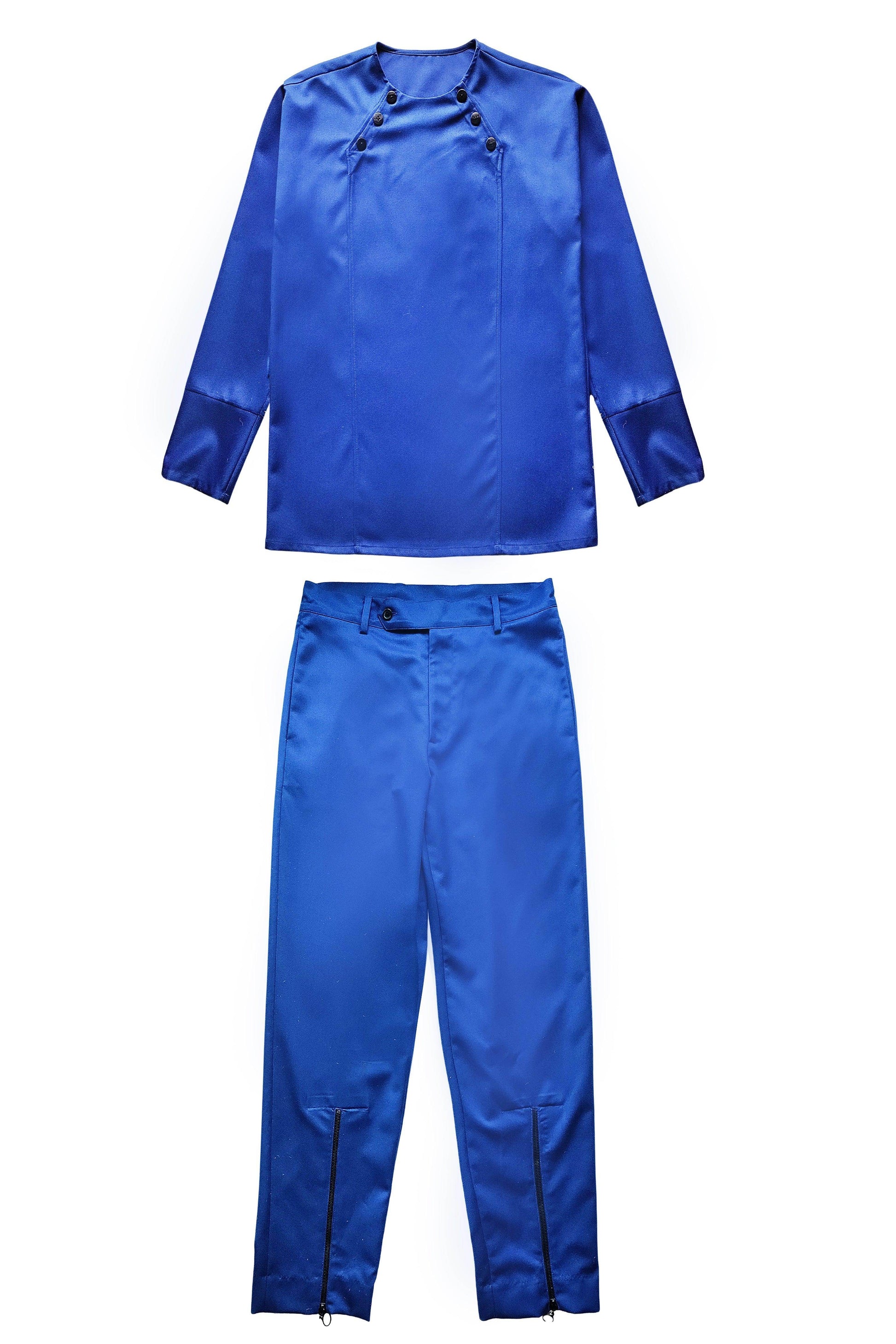 Blue pant set in all weather suiting material. Round neck with diagonally placed button placket on both sides of the neckline. Buttons can be worn all closed, partially open, or entirely open. Mock front attach panel. Long sleeves with three show buttons at the cuffs. Regular fit. Paired with matching zip at the cuffs. Wear it 2 ways, zipped up for a straight fit, or unzipped for wide-leg. Pockets on the side and back. Hook and zip closure at the front. Belt loops.