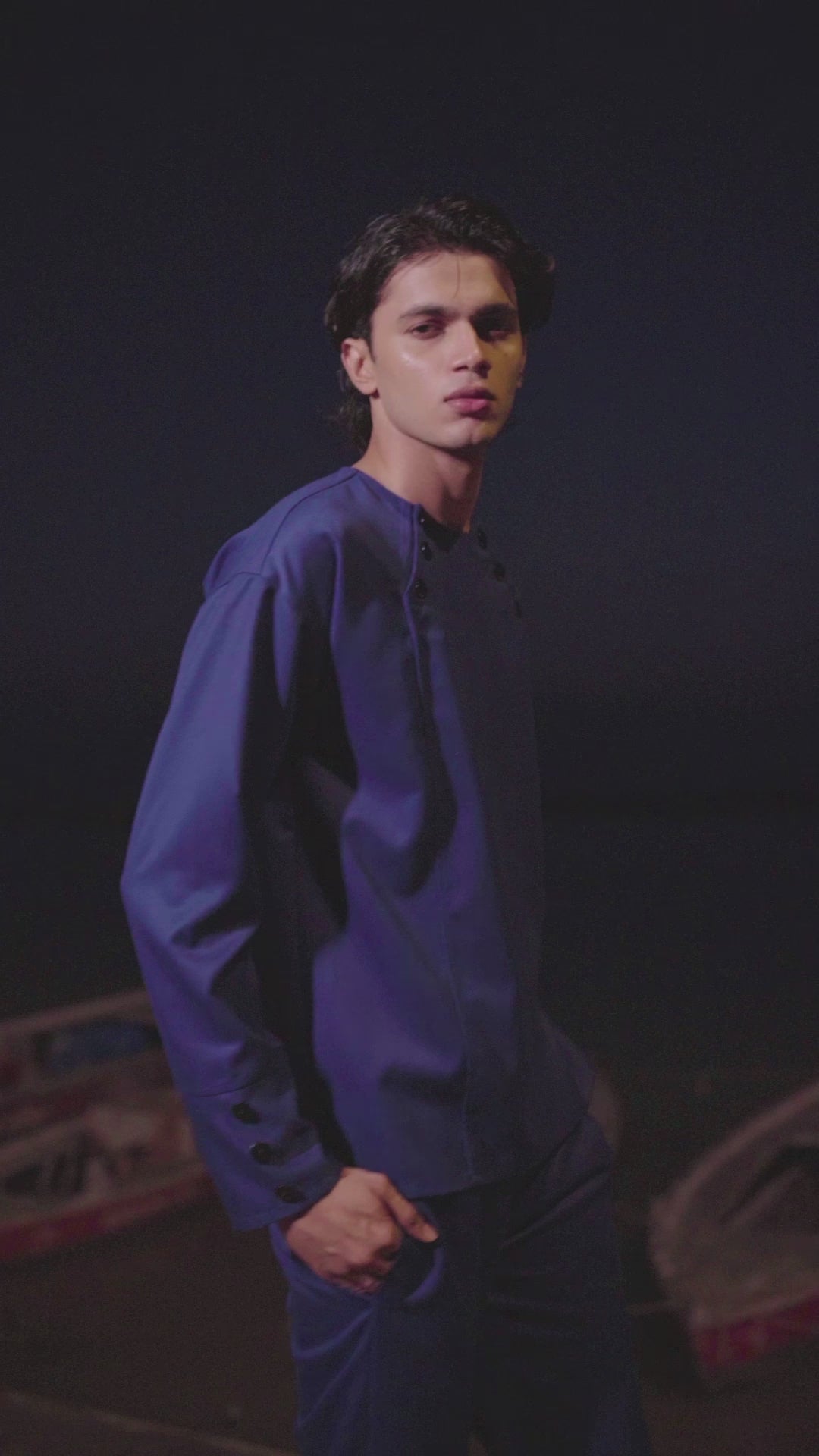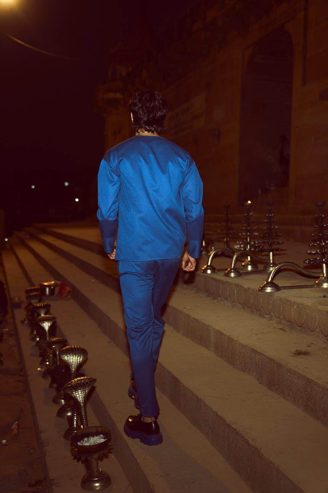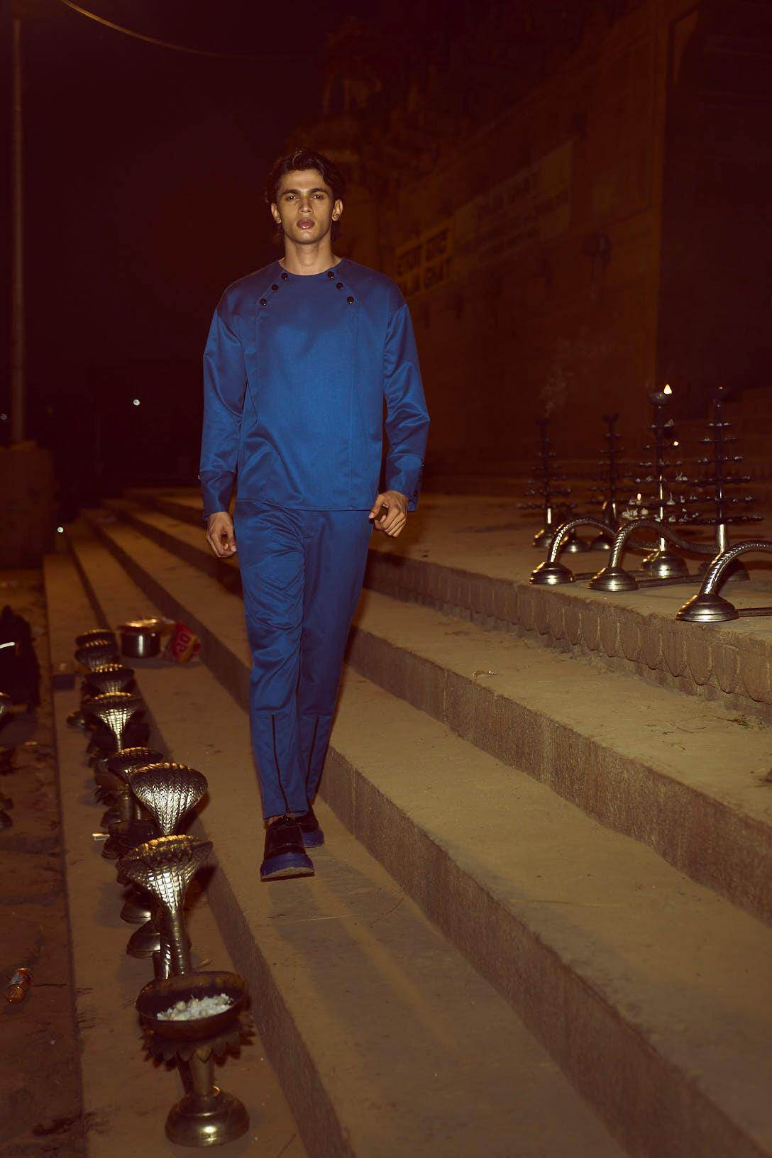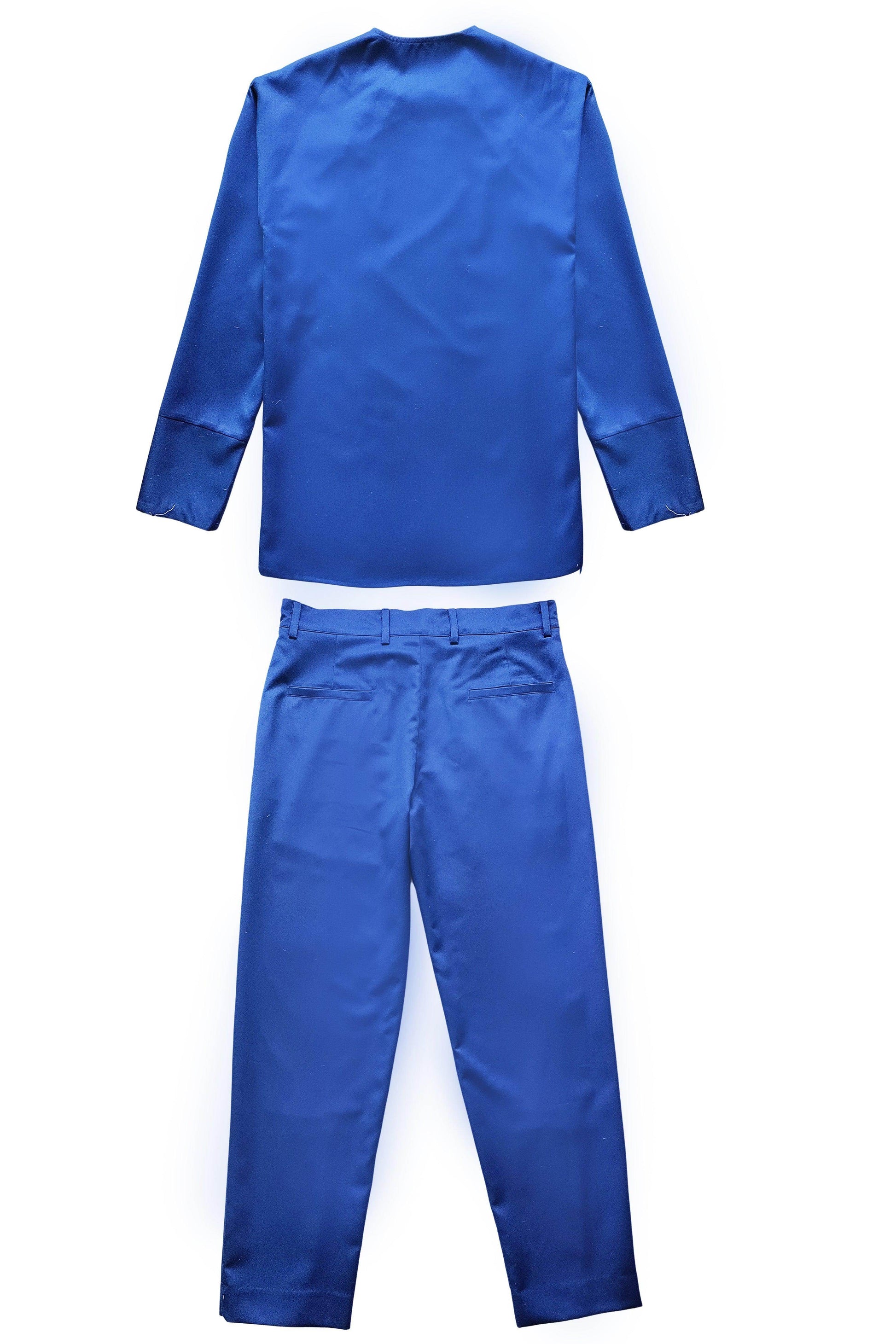 Blue pant set in all weather suiting material. Round neck with diagonally placed button placket on both sides of the neckline. Buttons can be worn all closed, partially open, or entirely open. Mock front attach panel. Long sleeves with three show buttons at the cuffs. Regular fit. Paired with matching zip at the cuffs. Wear it 2 ways, zipped up for a straight fit, or unzipped for wide-leg. Pockets on the side and back. Hook and zip closure at the front. Belt loops.