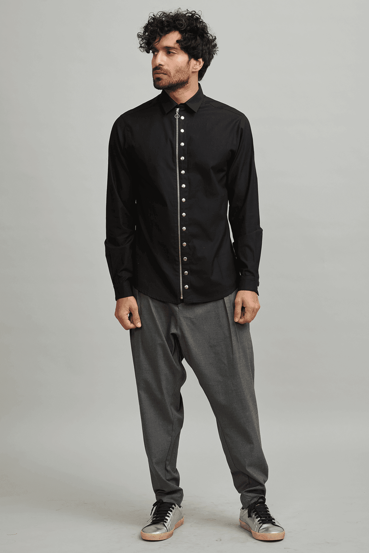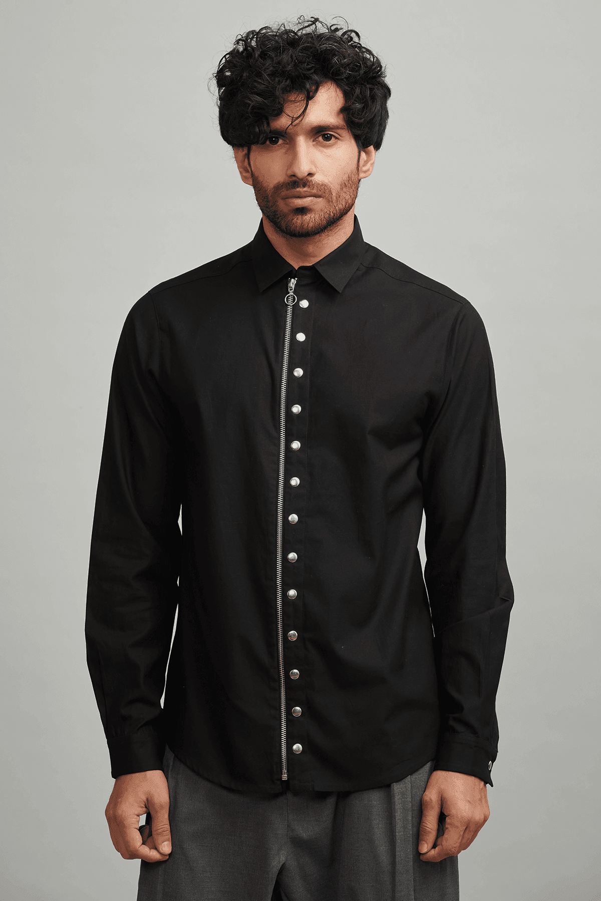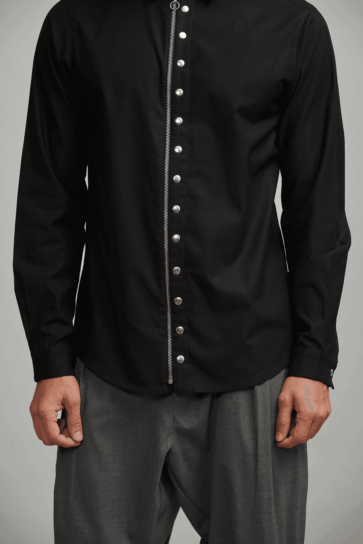 Black poplin full sleeve shirt with silver snap buttons and zipper down the center front.