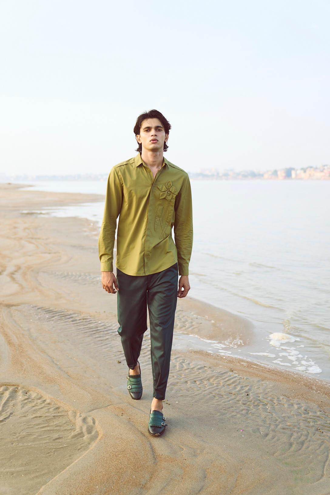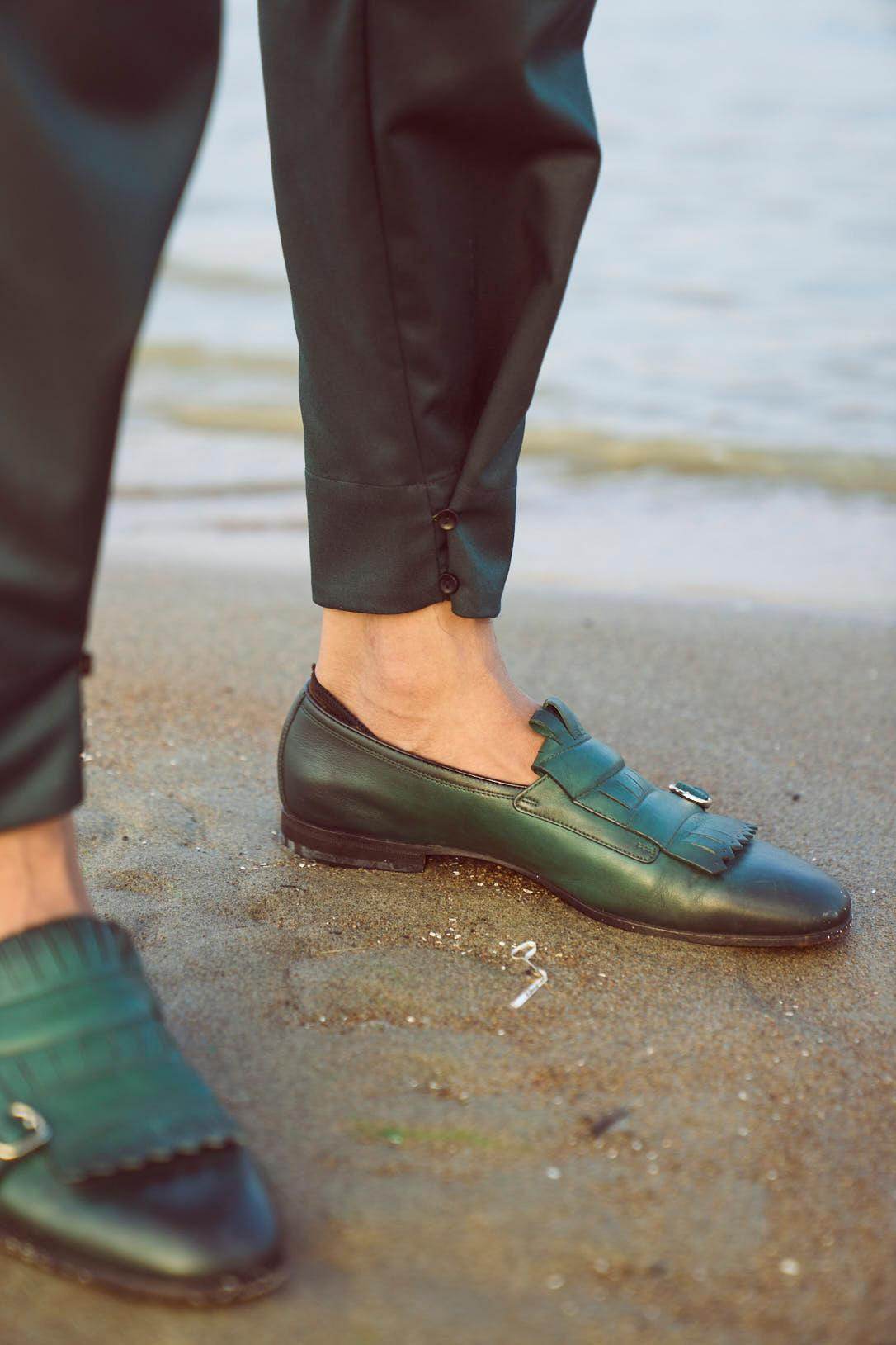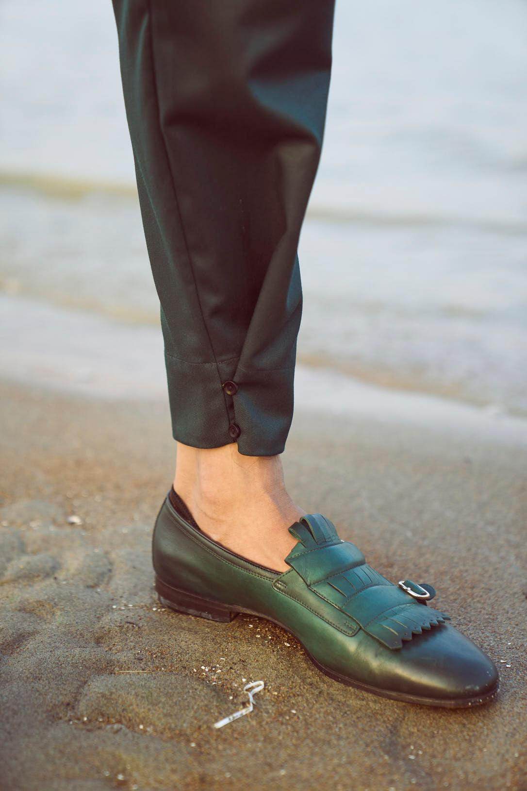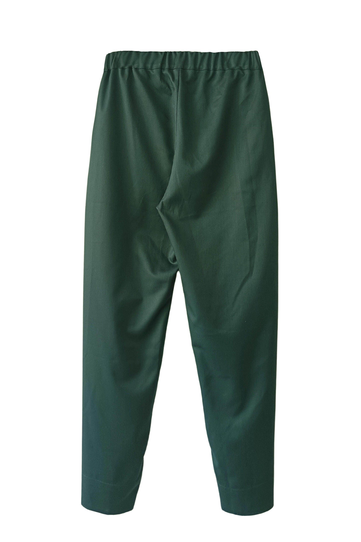 Forest green button cuff pants. Wear it 2 ways, as straight pants, or buttoned at the cuff for a tapered fit. Hook and zip closure at the front. Pockets on the side. Semi elasticated at the back.