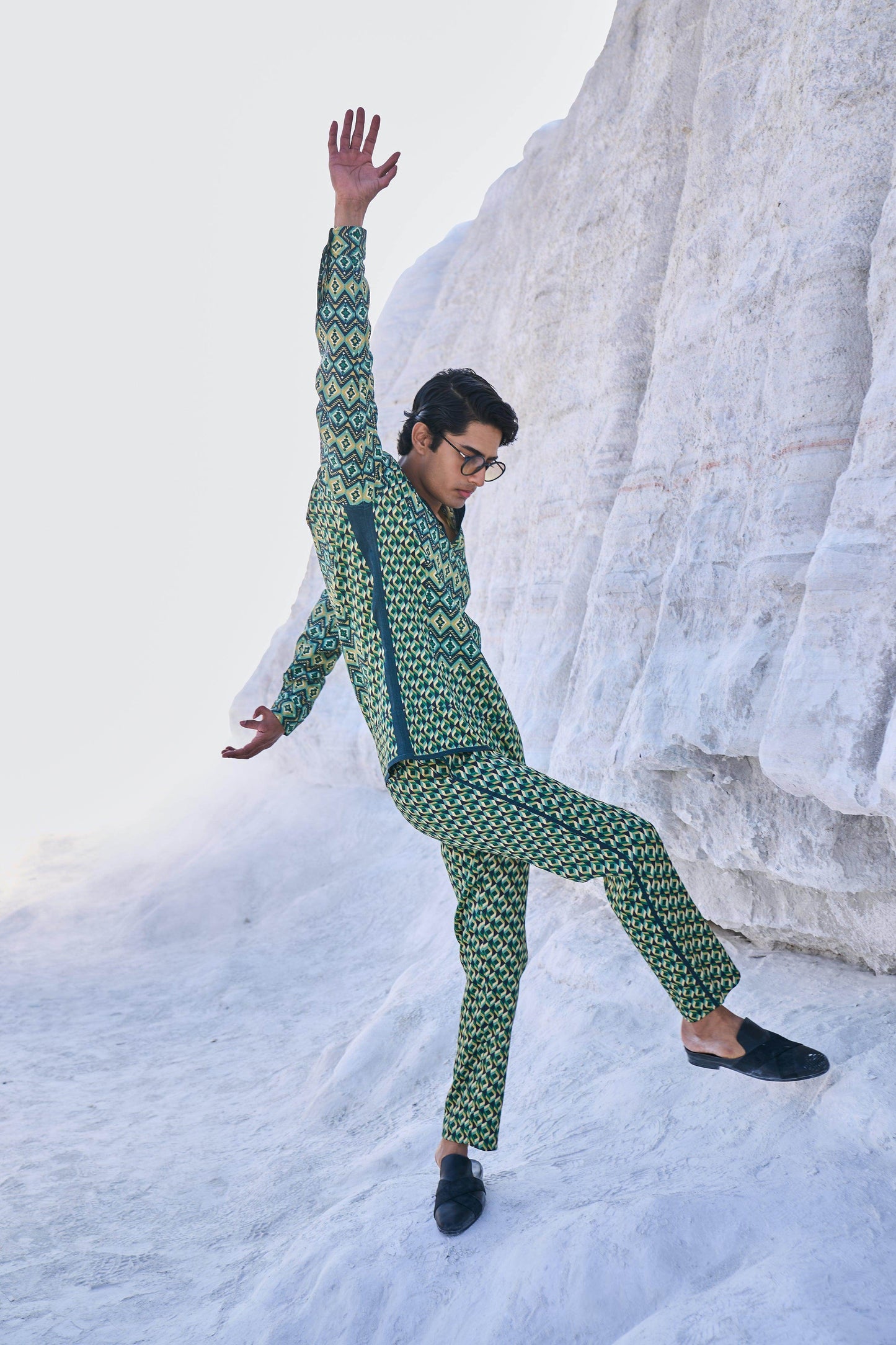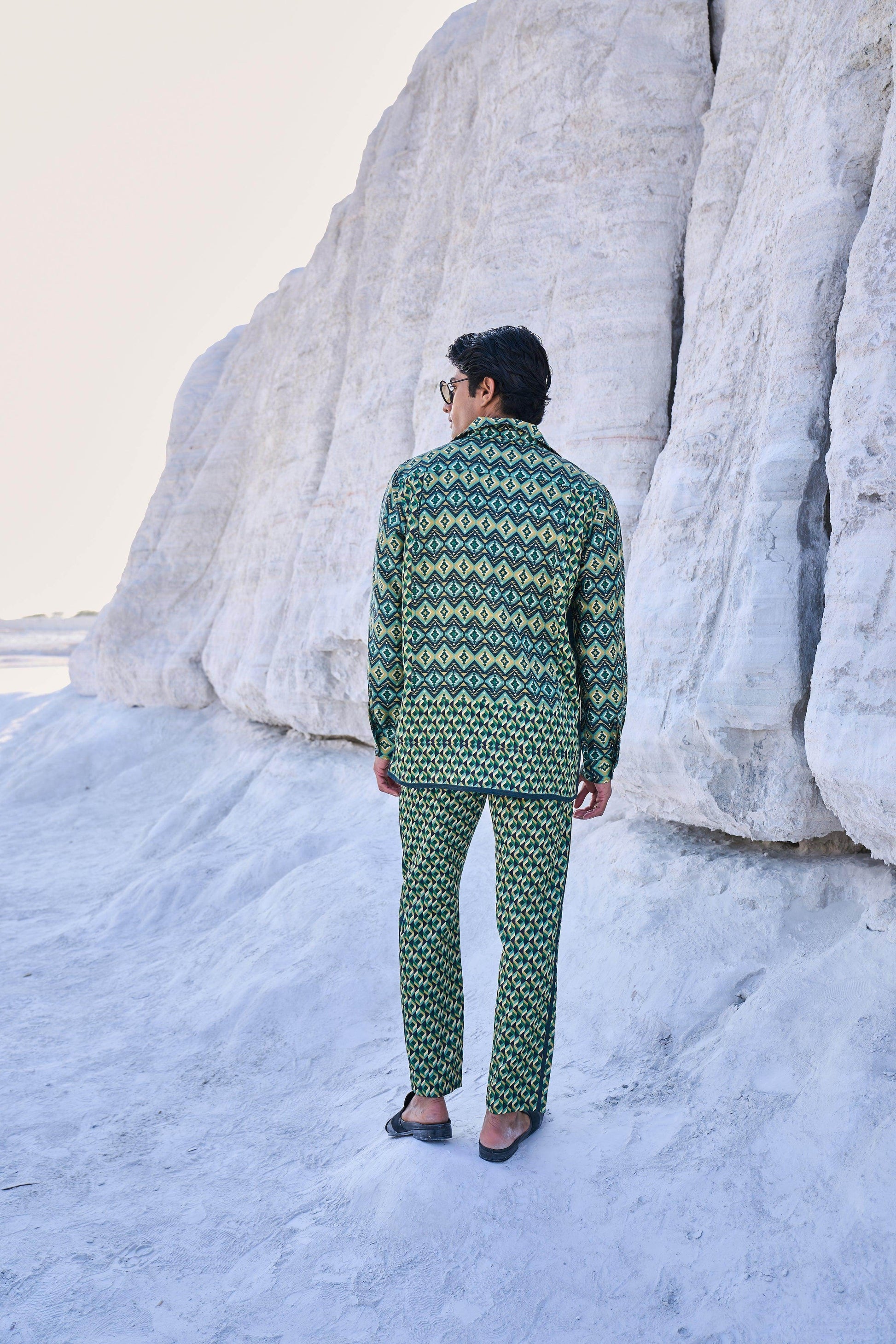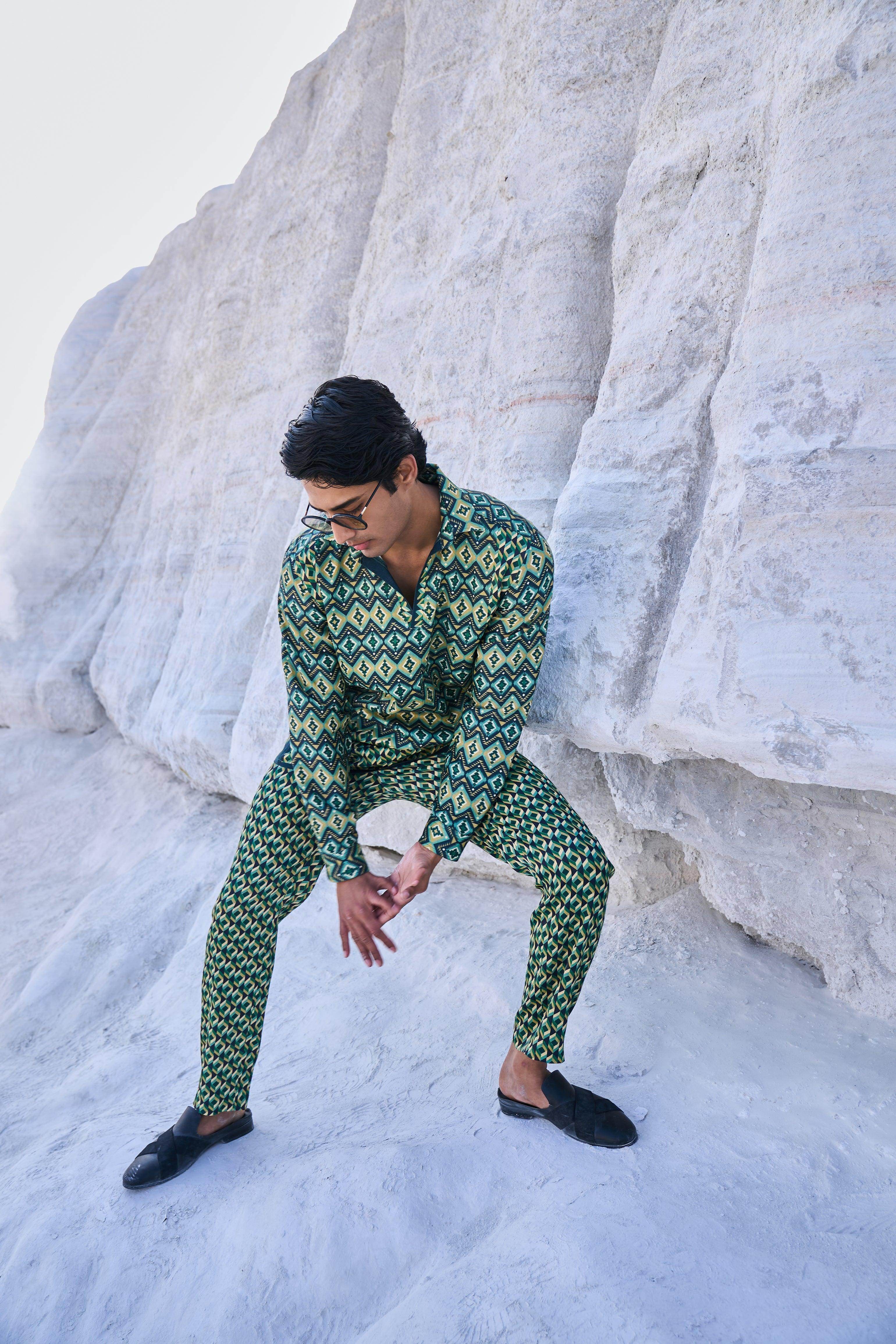 Pants have zip closures at the front, and belt loops. Pockets on the side and back.