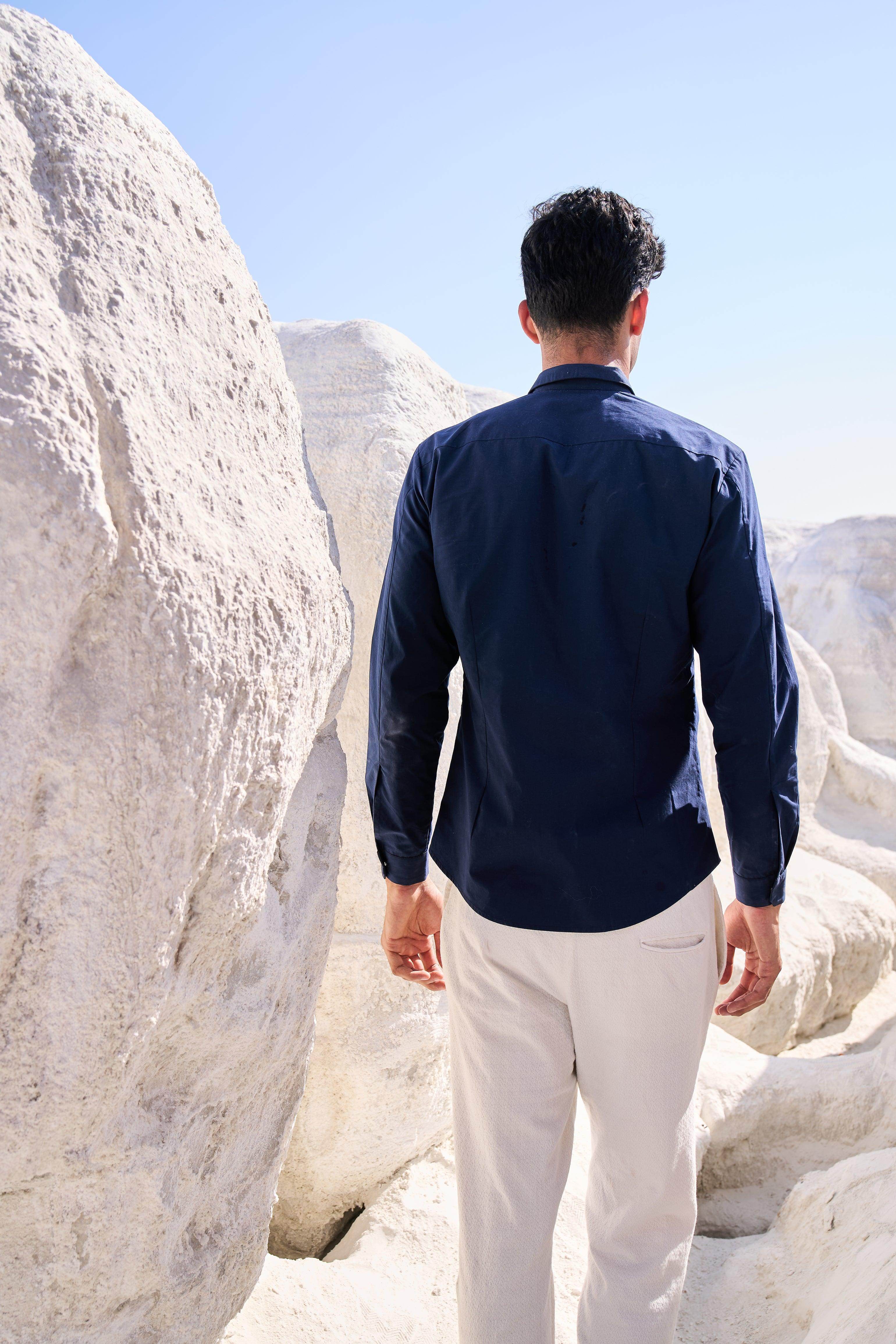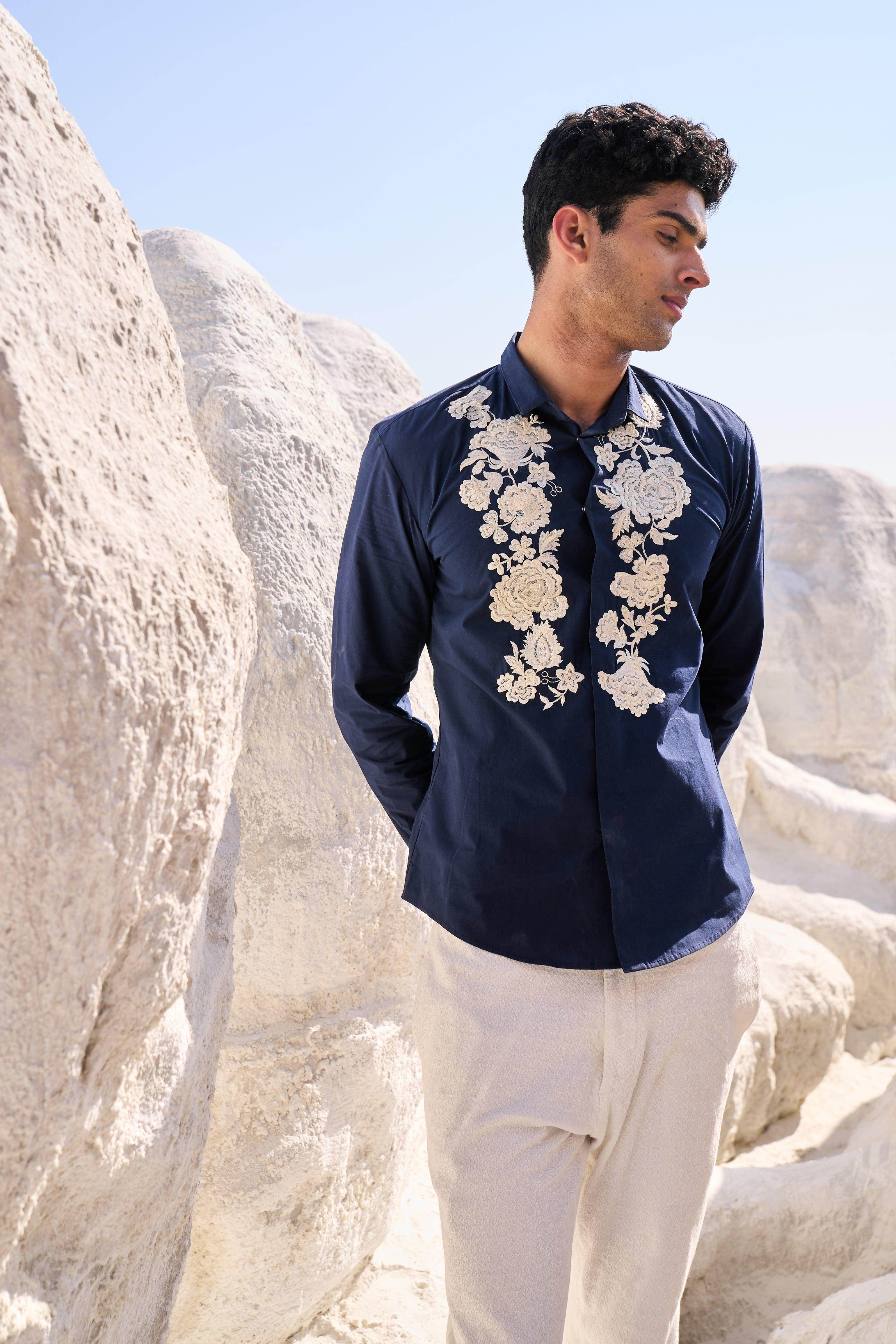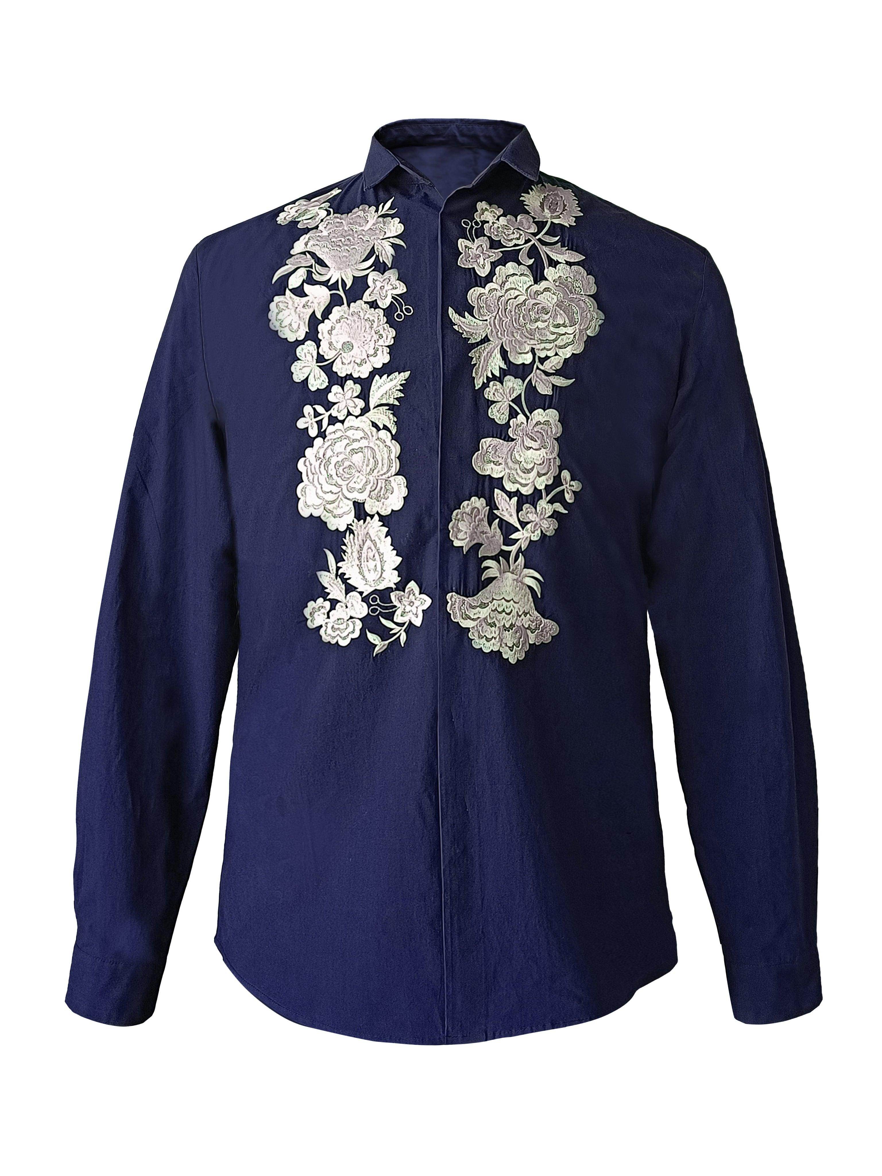 Blue cotton poplin shirt with Gara stitch inspired embroidery running down the center front placket. Long-sleeves. Snap button closure at the front and the cufff. Regular fit.
