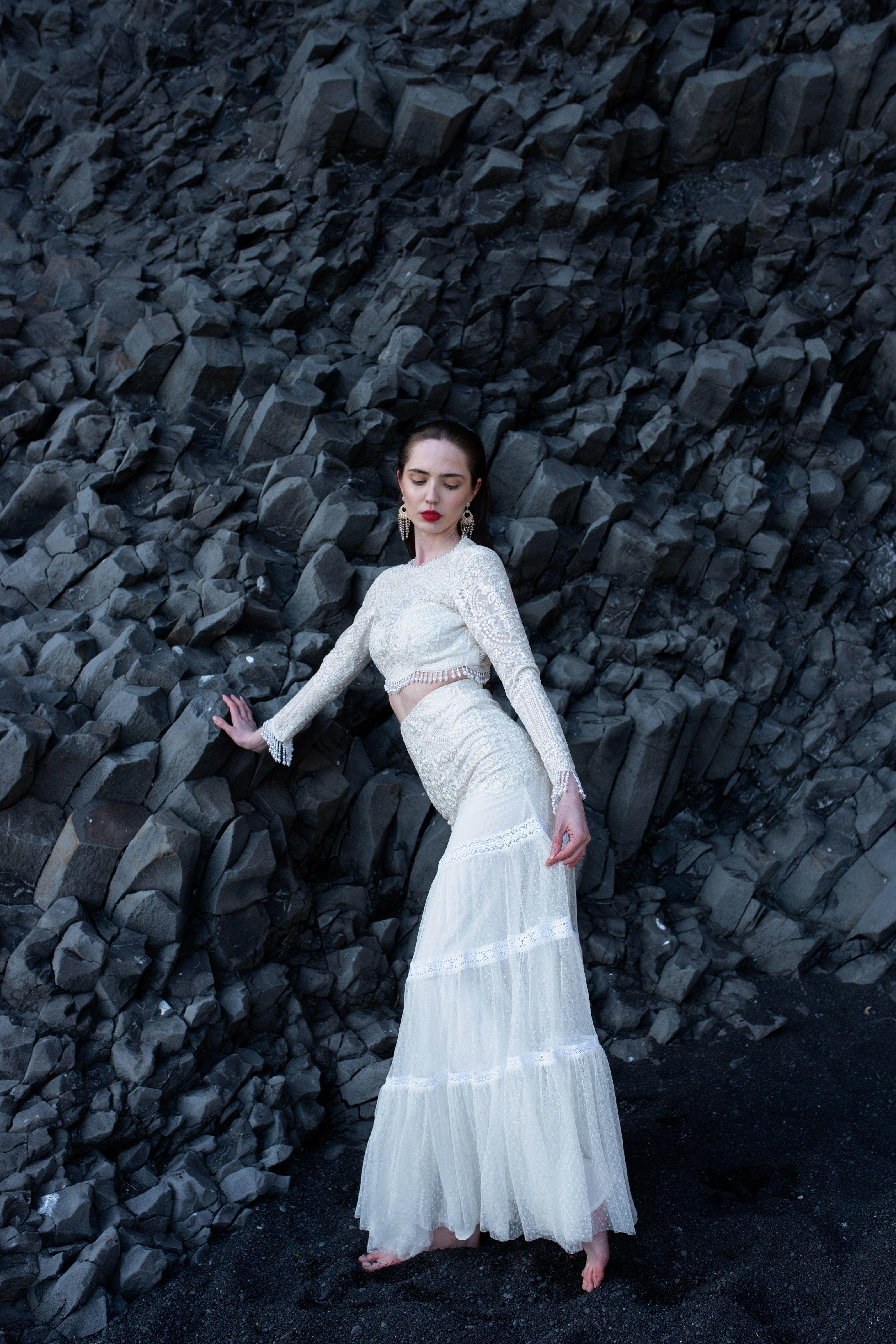 White on white delicately and intricately allover embroidered full-sleeve crop top. Pearl fringes dripping down the cuffs and bottom hem of the top. Hand applied pearls adorn the rounded neck. Hook-eye and zip closure at the back. The top is lined in the front with removable pad pockets.