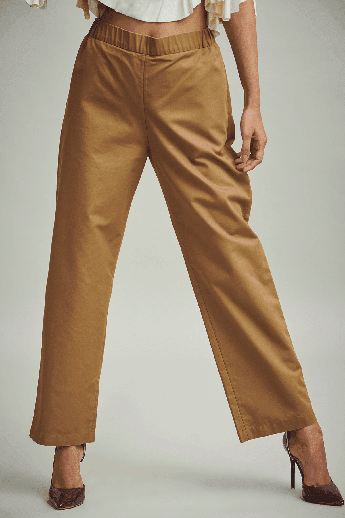 Flat front straight-legged pants. Elasticated waist. Relaxed fit.