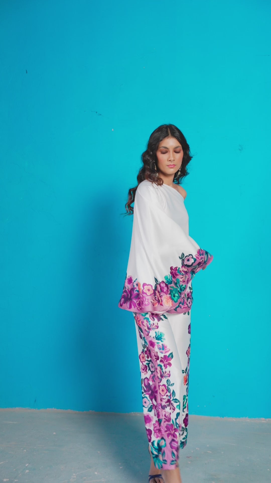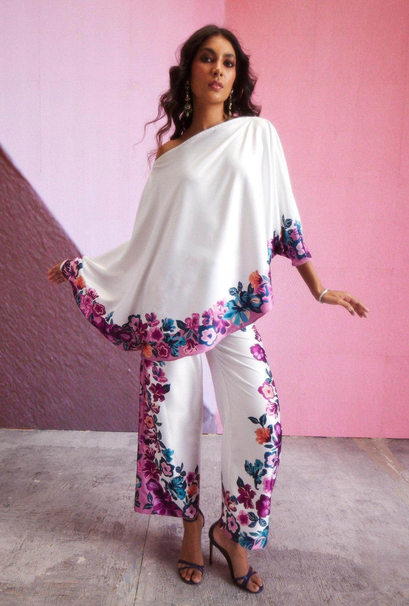 Kaftan inspired circular top in multicolour placed floral print around the hem. Can be worn as one shoulder or off-shoulder. Comfort fit.