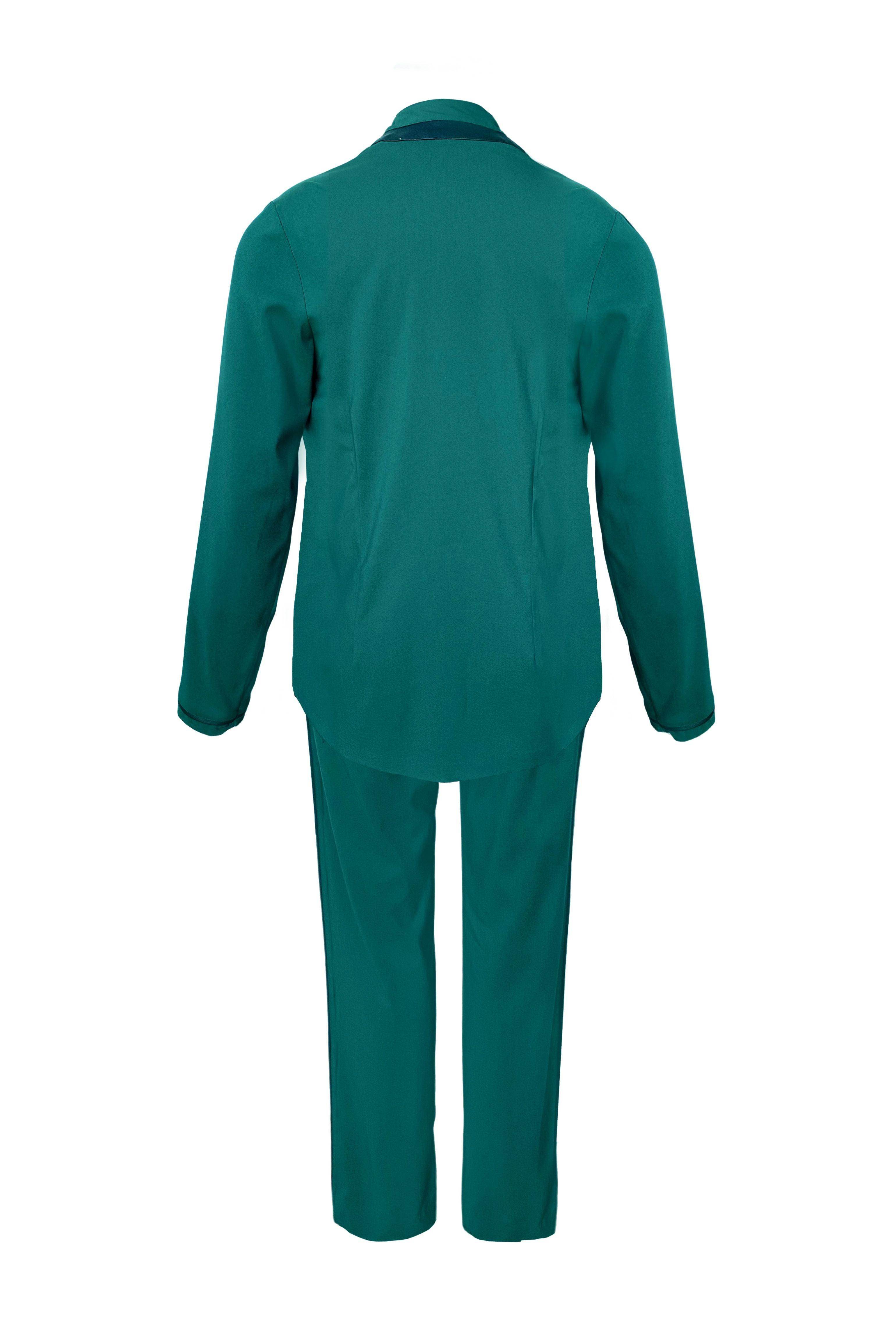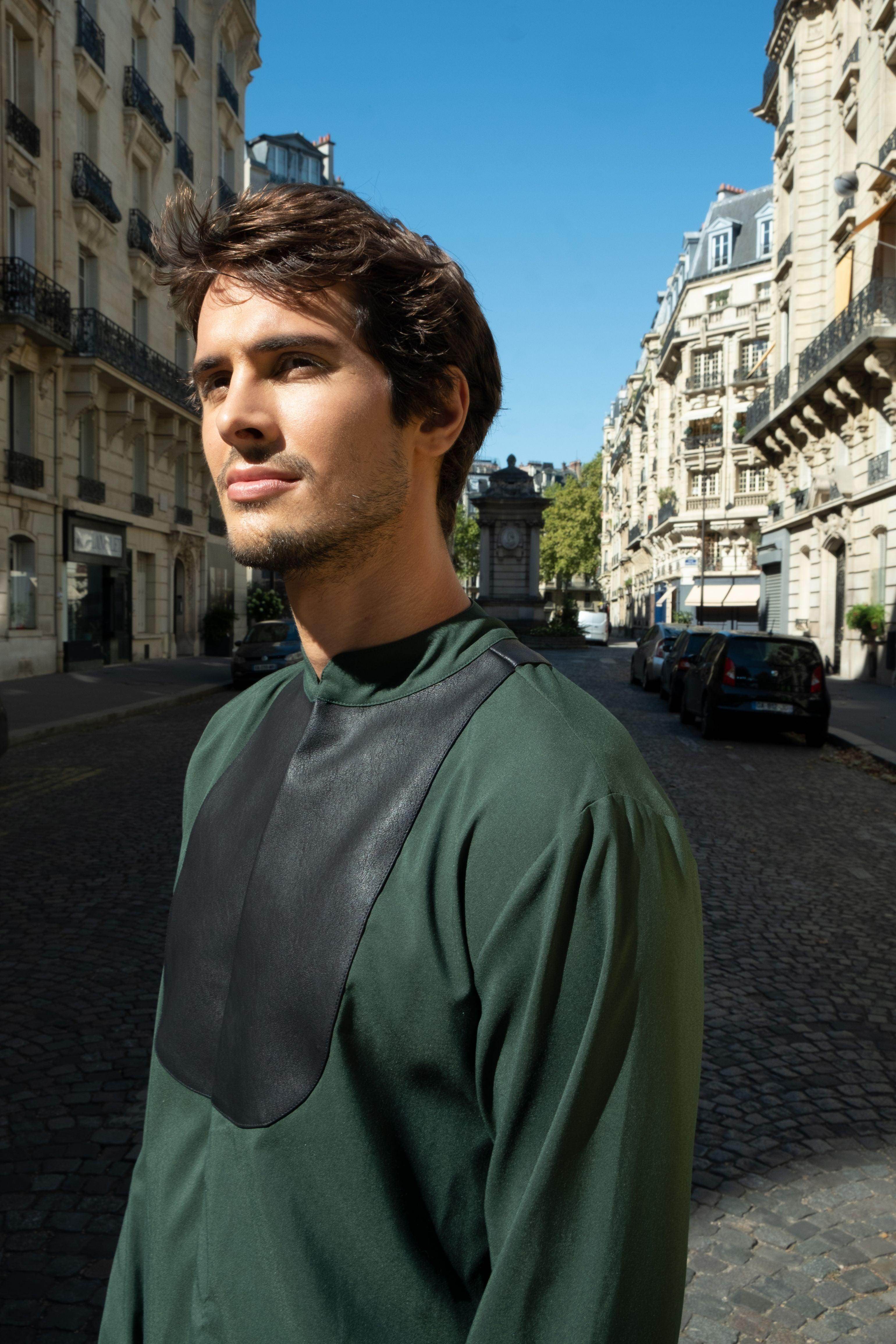 Green band collar full sleeve shirt with faux-leather bib panel at the front. Leather piping detail at the cuff and back of the collar. Concealed buttons. Regular fit. Paired with matching pants with leather piping detail down the sides. Zip closure at the front, belt loops. Pockets on the side and back. Made of all weather suiting material.