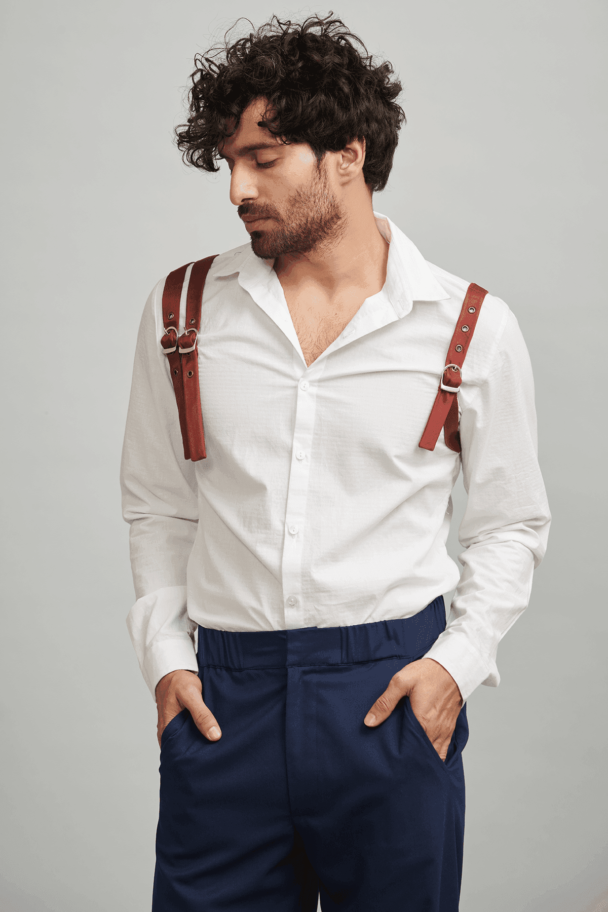 White poplin full sleeve shirt with contrast asymmetrical buckle and harness detail on the shoulders.