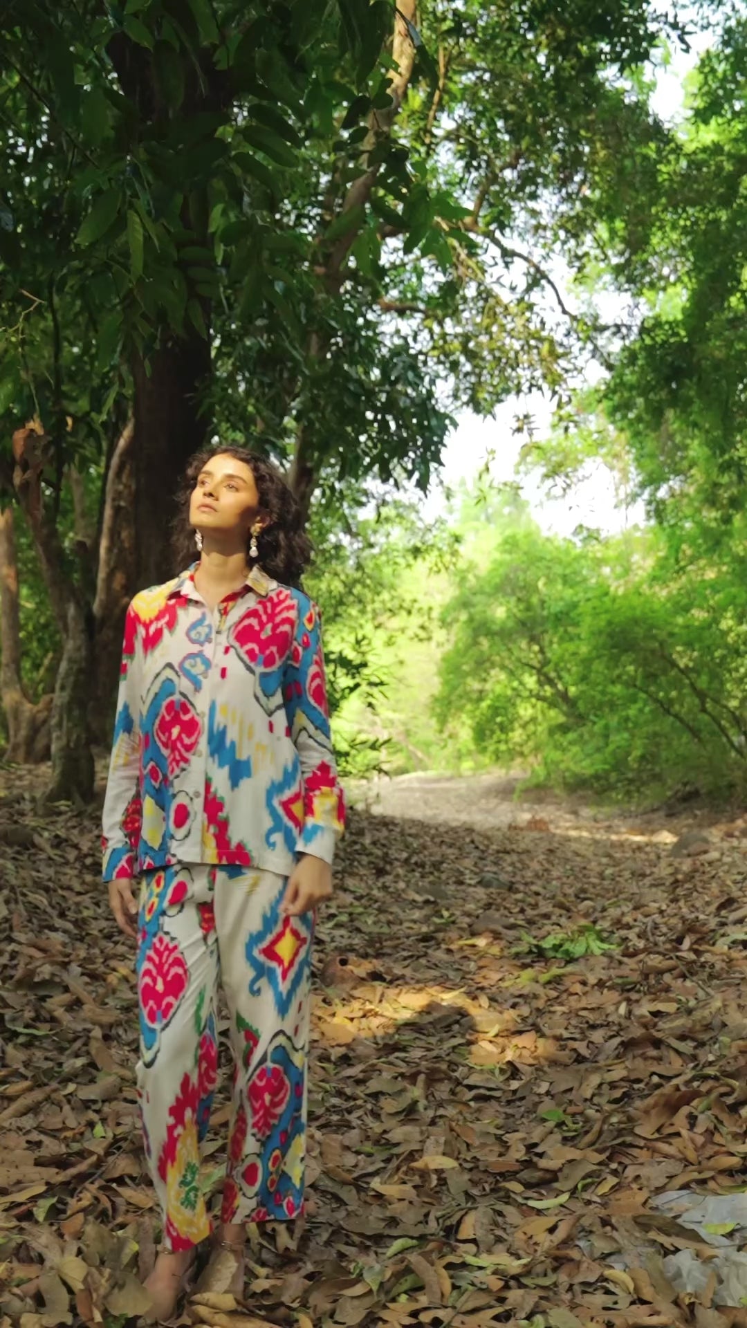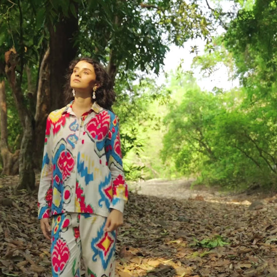 Relaxed fit pant in a multicoloured large scale Ikat print. Concealed button and hook closure and zip in the front. Semi elasticated at the waist. Includes side pockets and a patch pocket at the back.