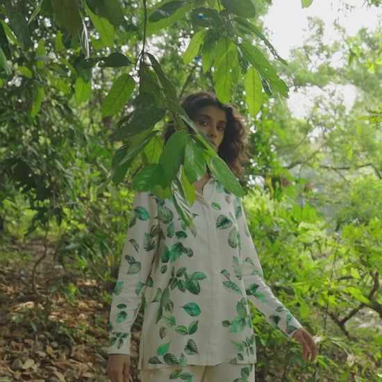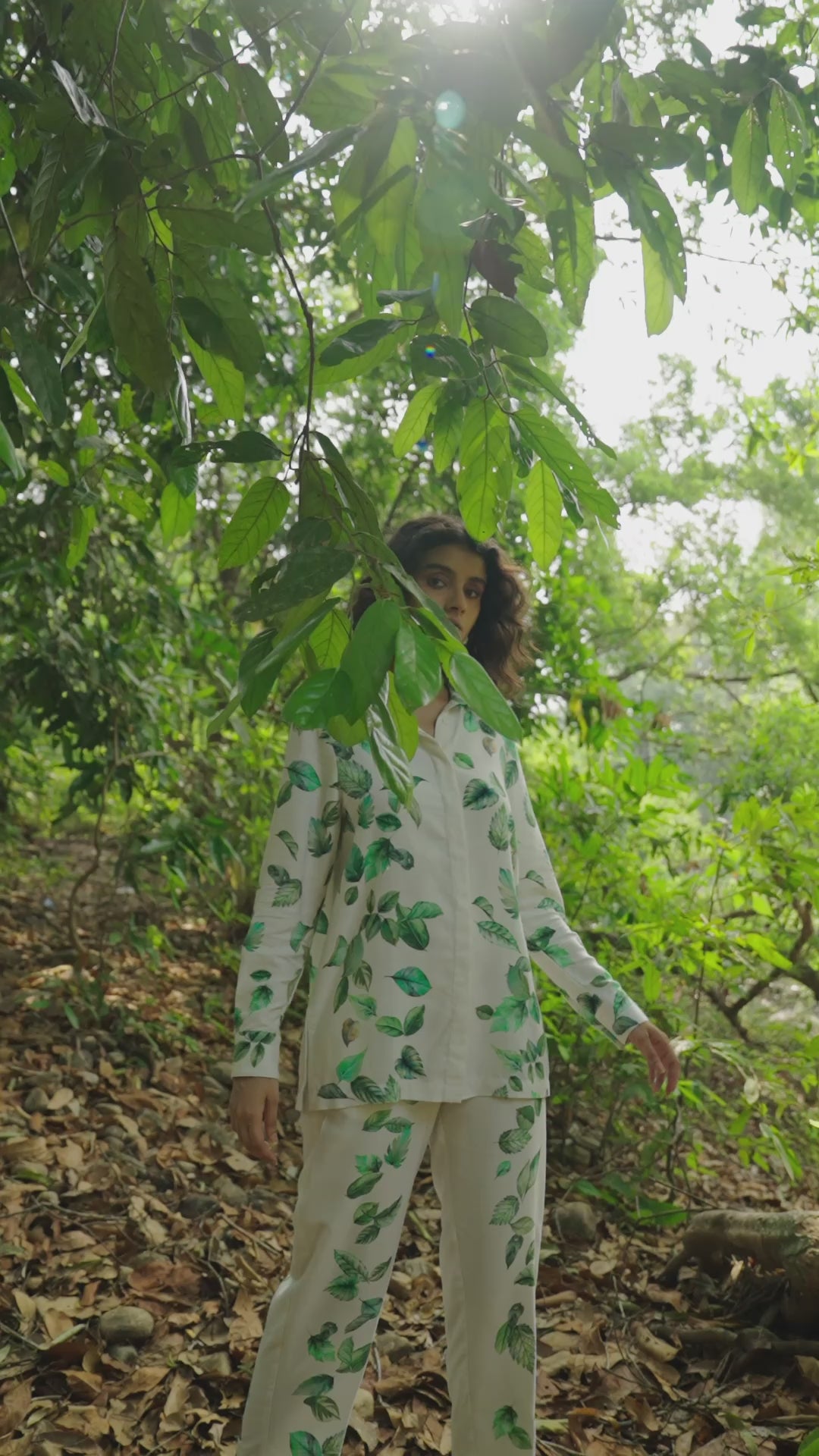 Foliage print straight-fit pants on an off-white textured organic viscose base. Zip fly with concealed button and hook closure. Semi elasticated at the waist, pockets in the sides.