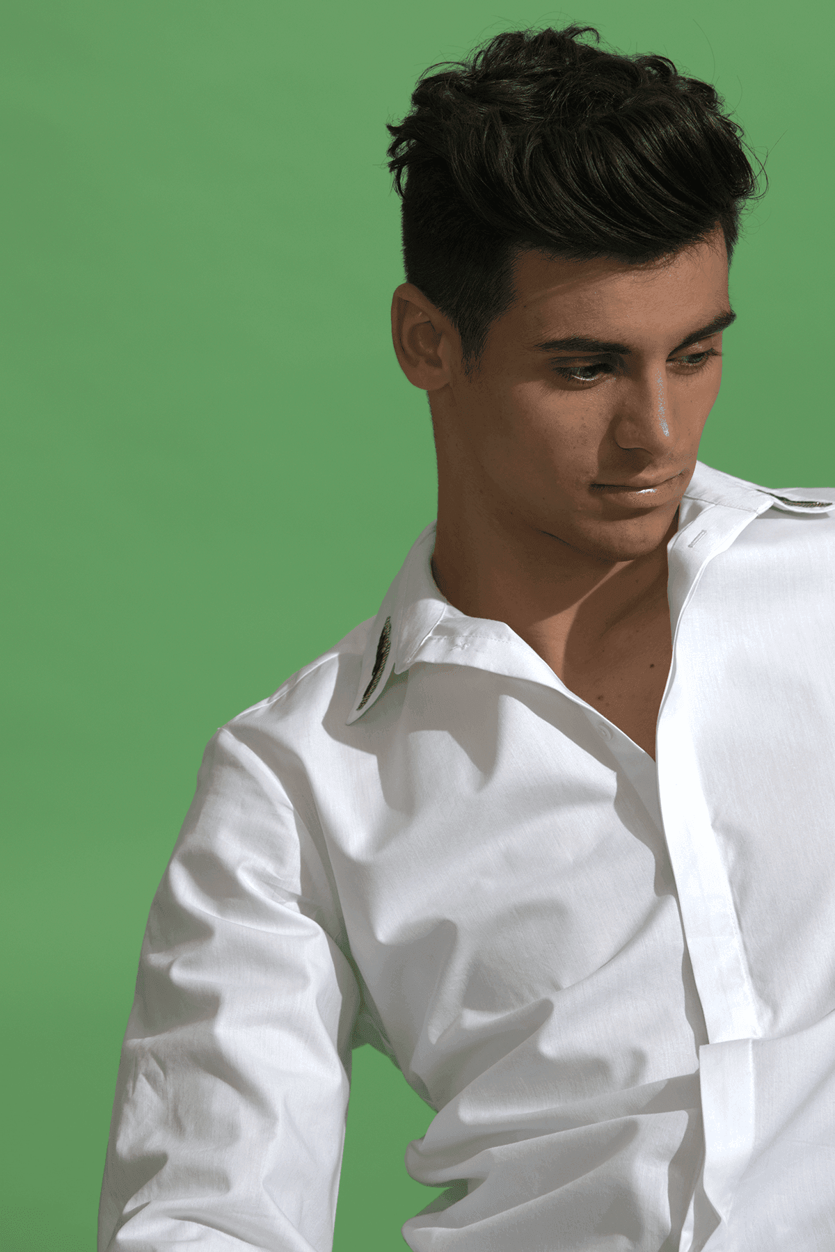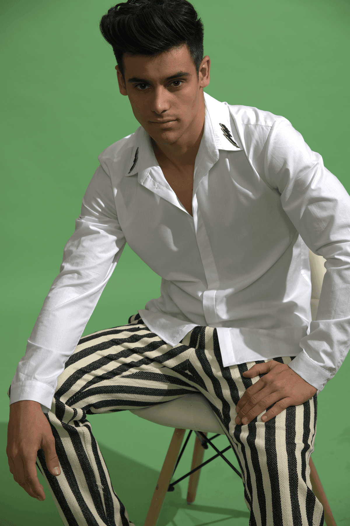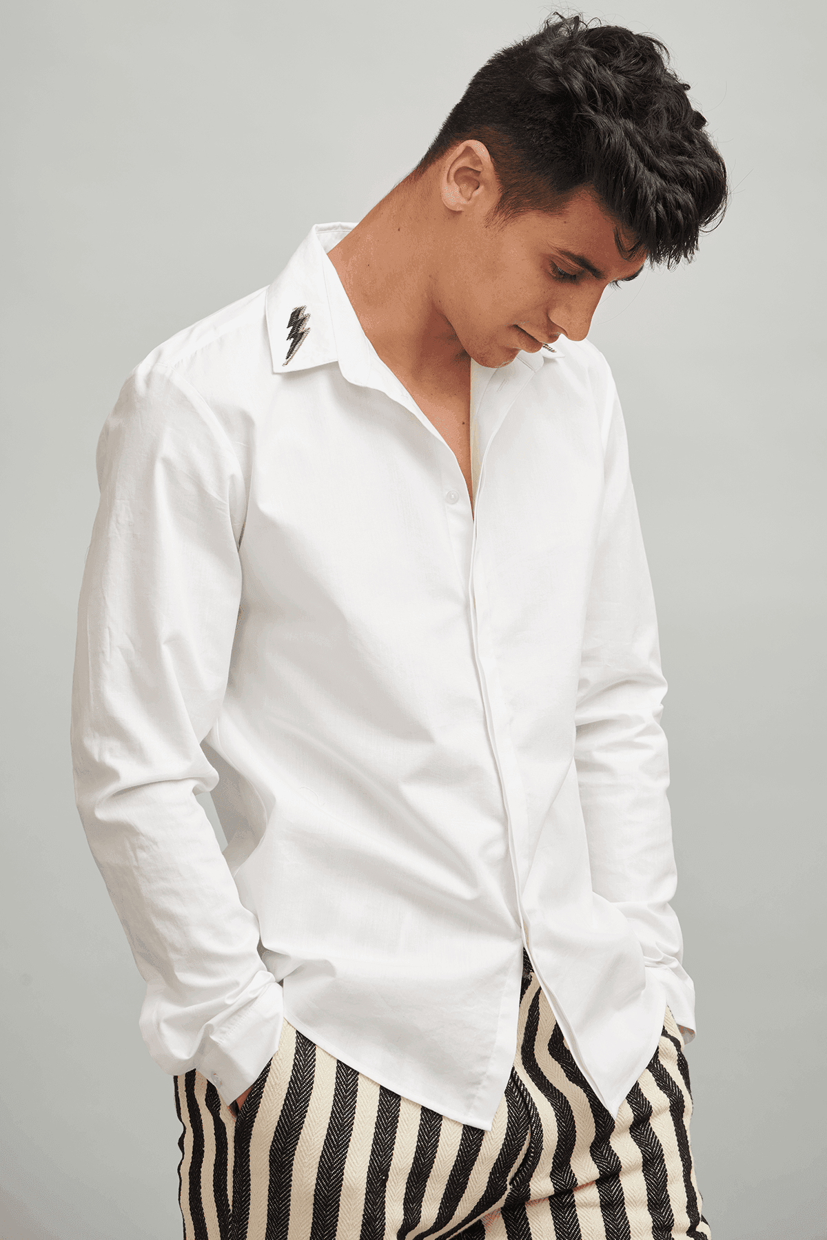 White poplin full sleeve shirt with hand zardozi applied lightning motifs on the collar.