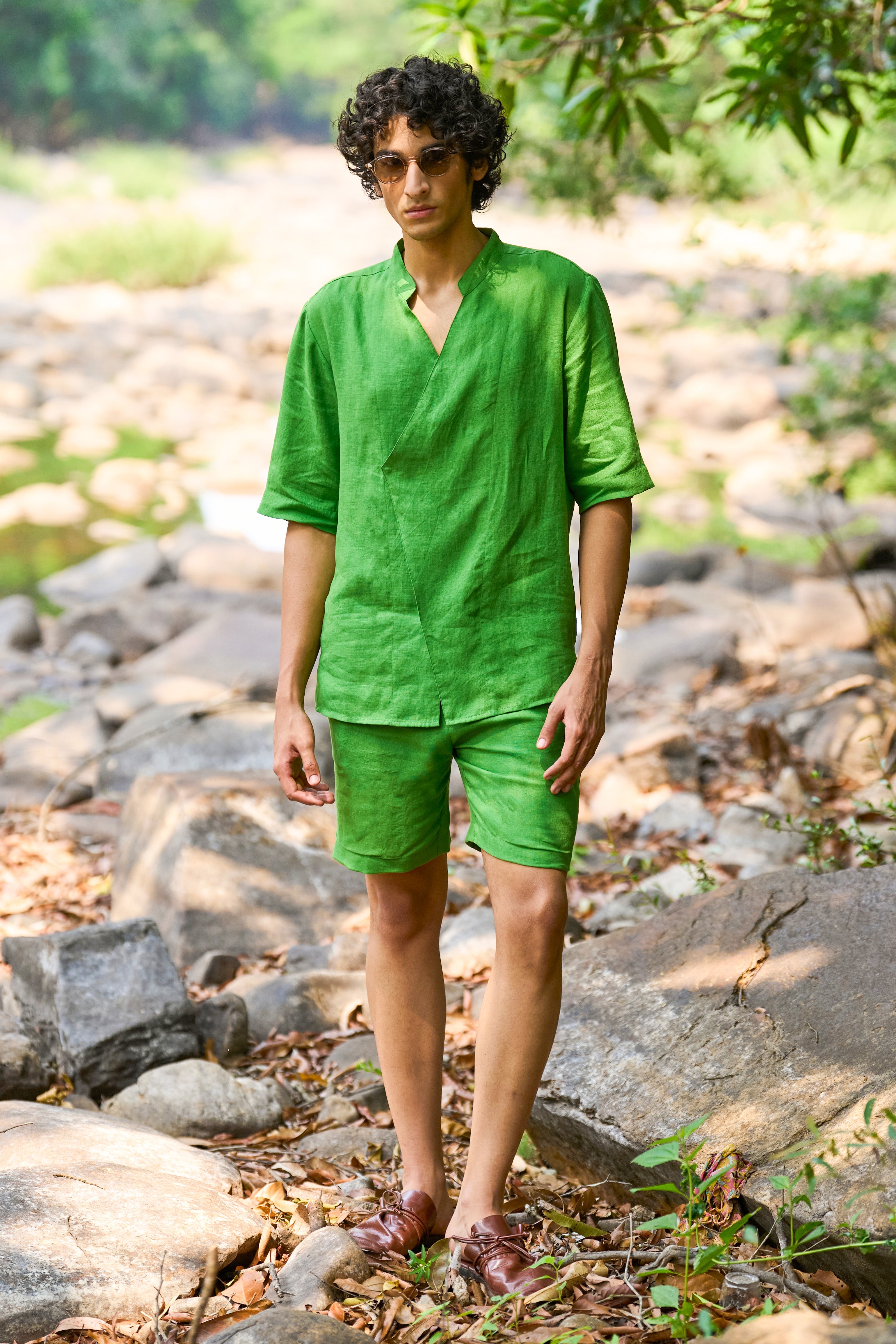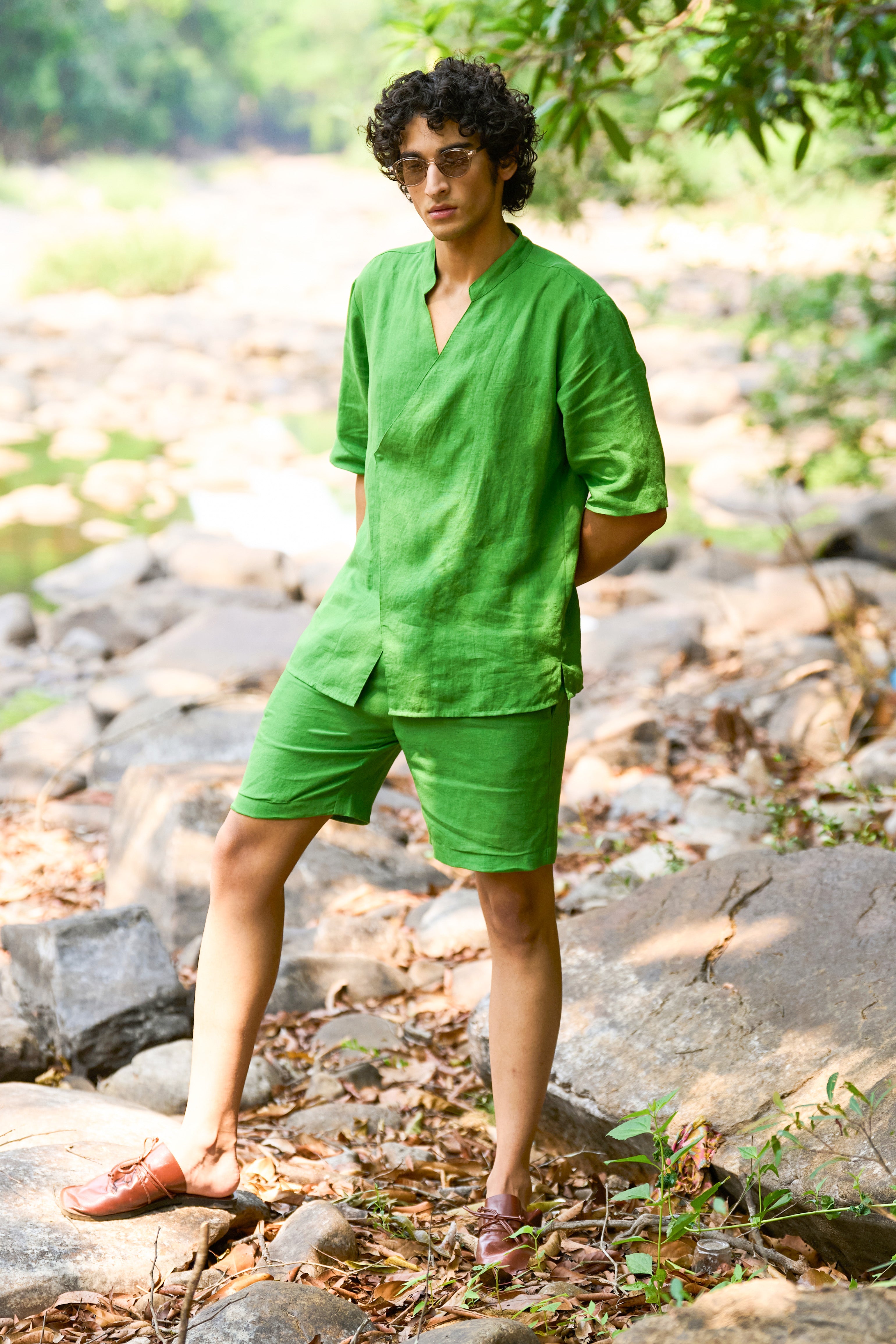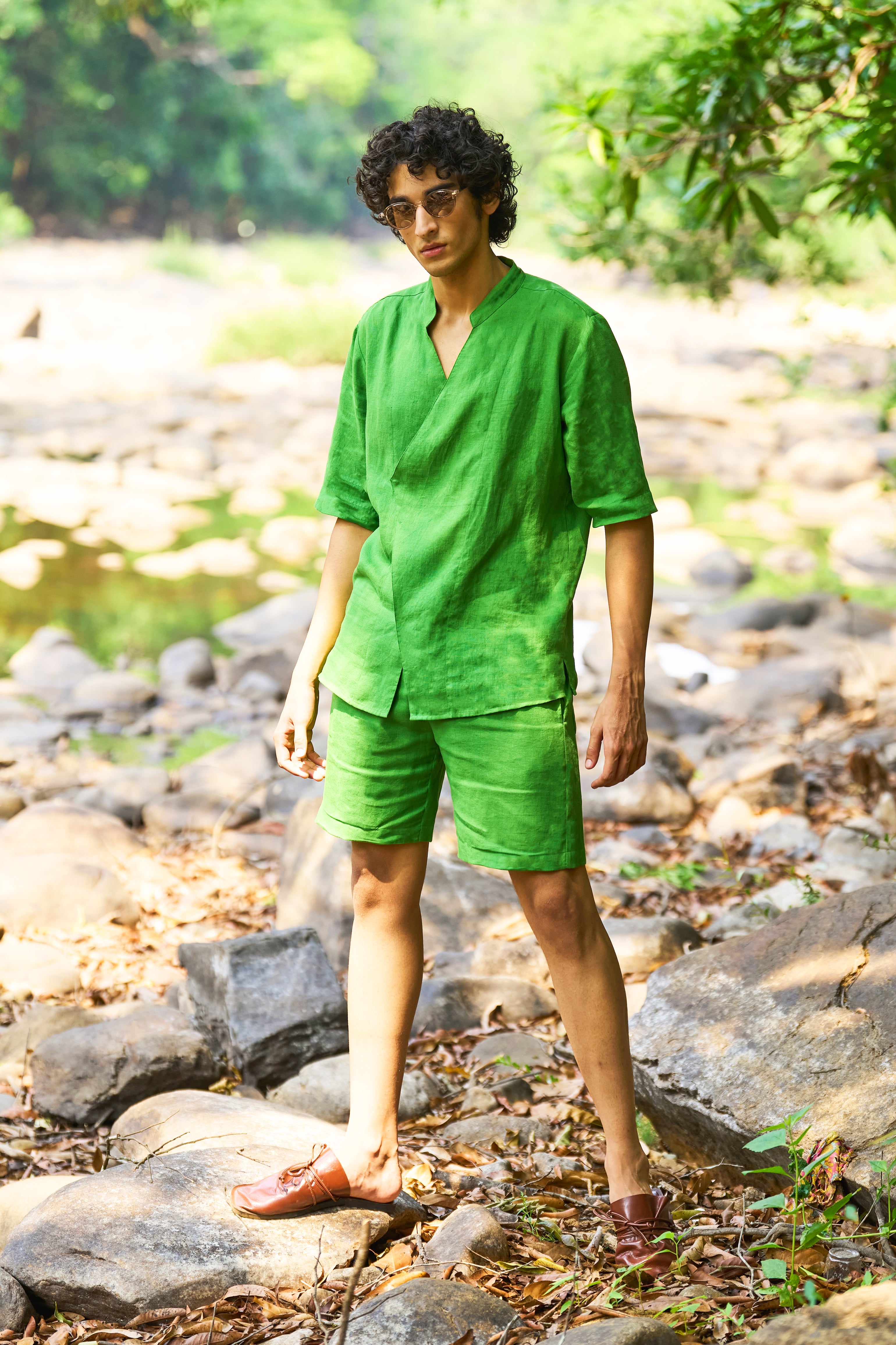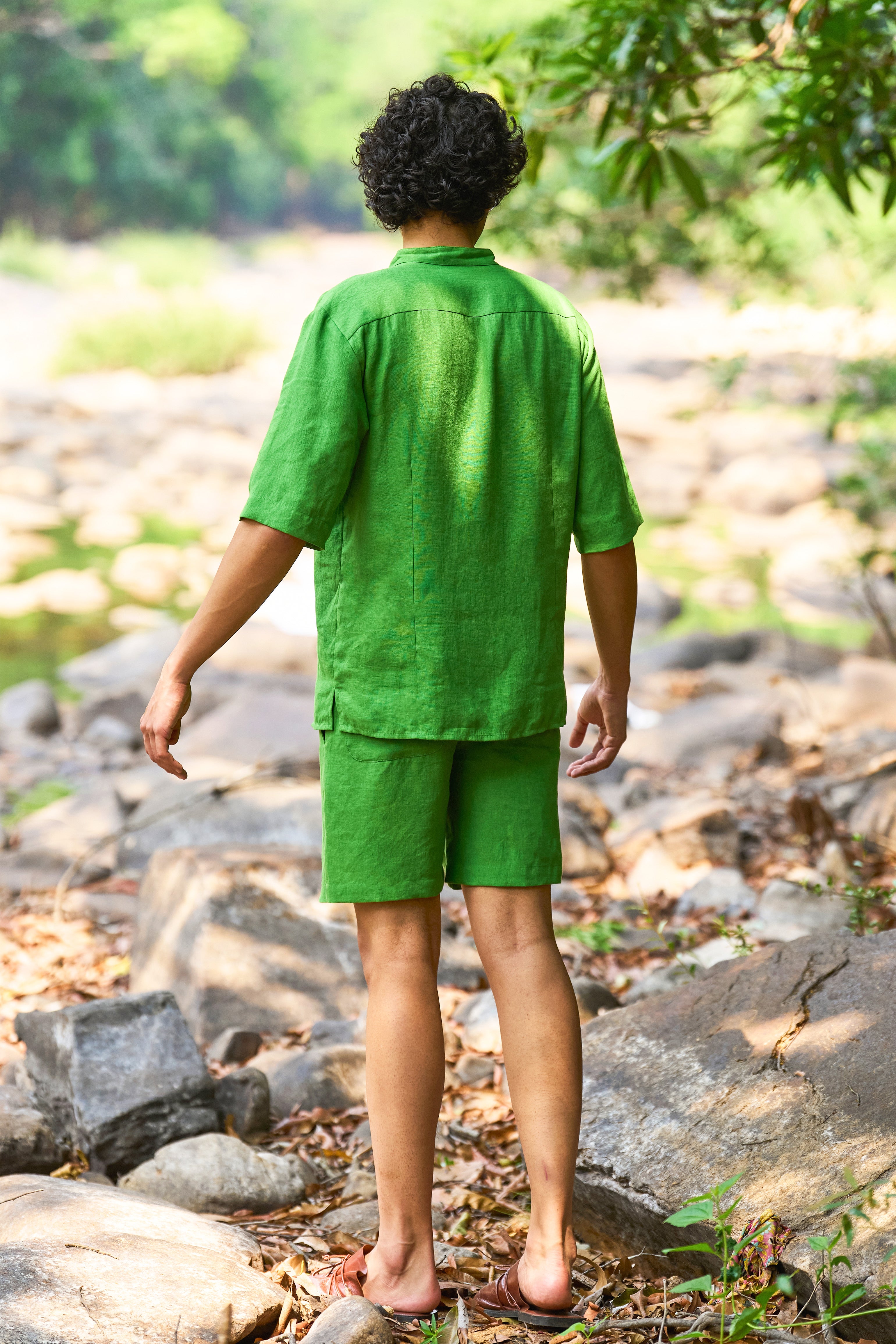 Green linen shorts. Elasticated waistband, front zip and hook closure. Includes side pockets and back patch pockets.