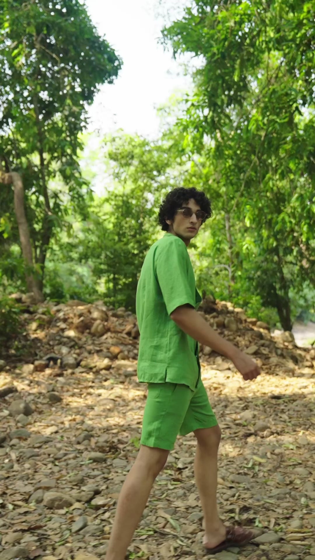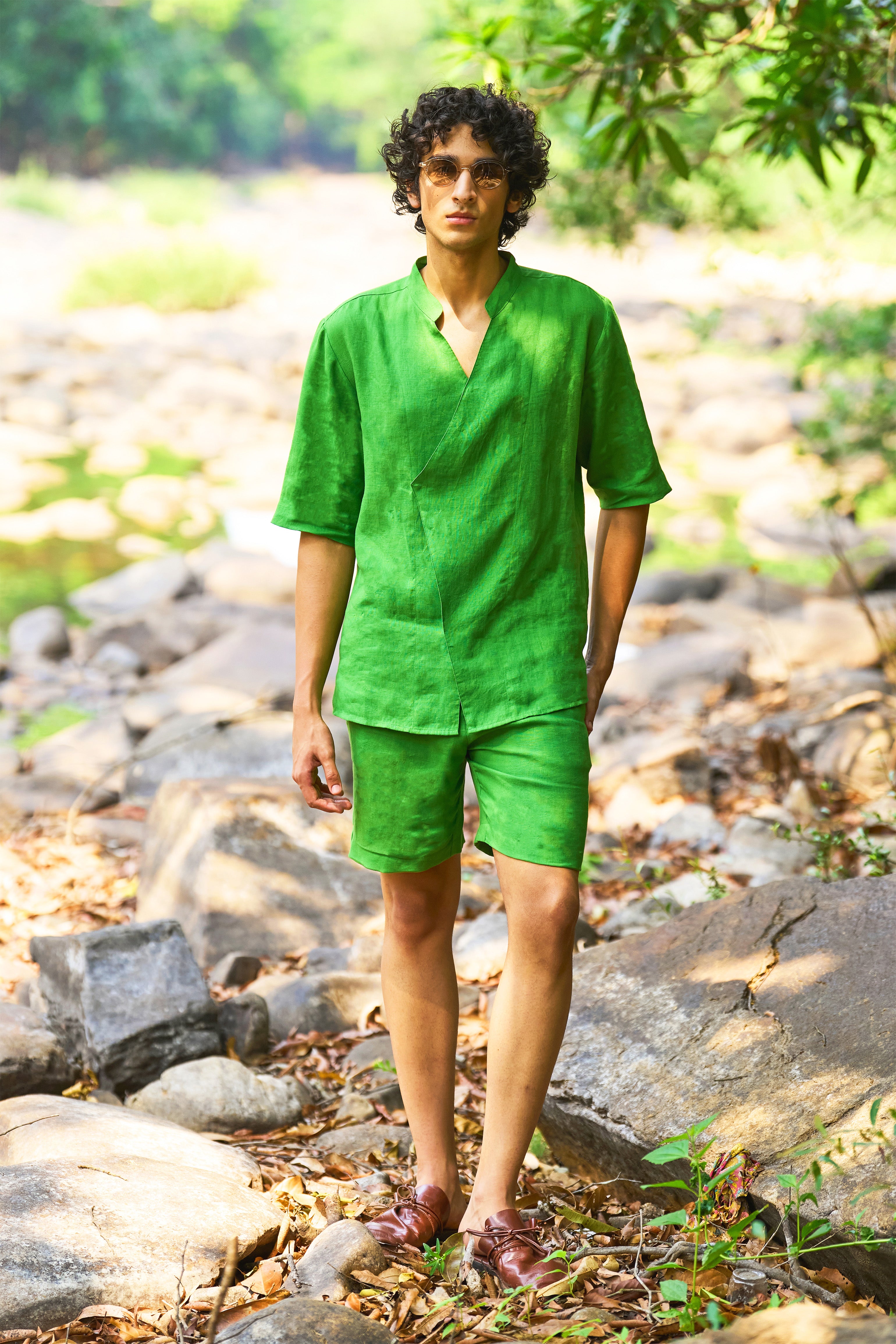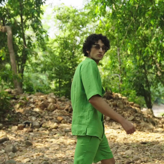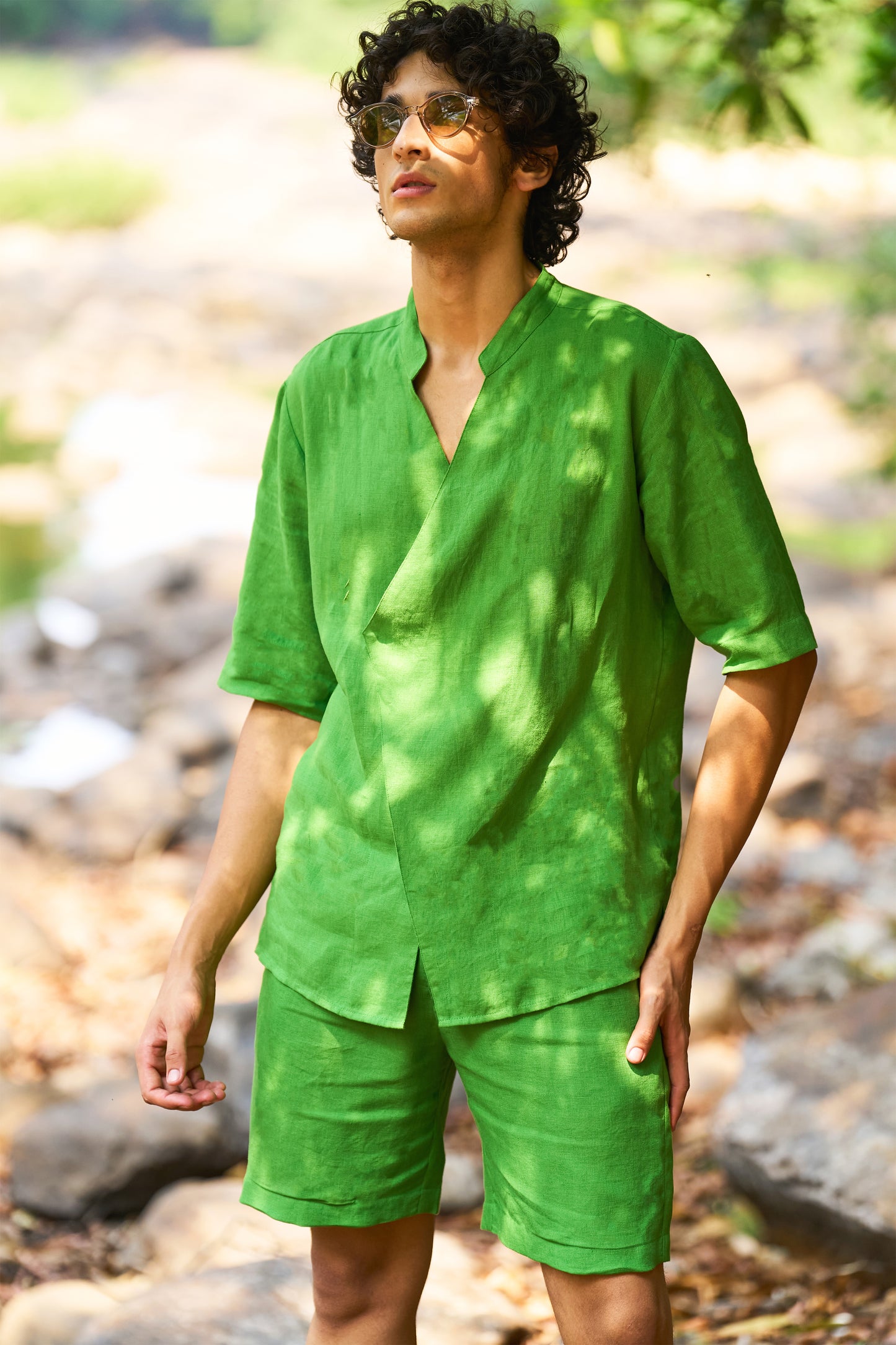 Green linen shorts. Elasticated waistband, front zip and hook closure. Includes side pockets and back patch pockets.