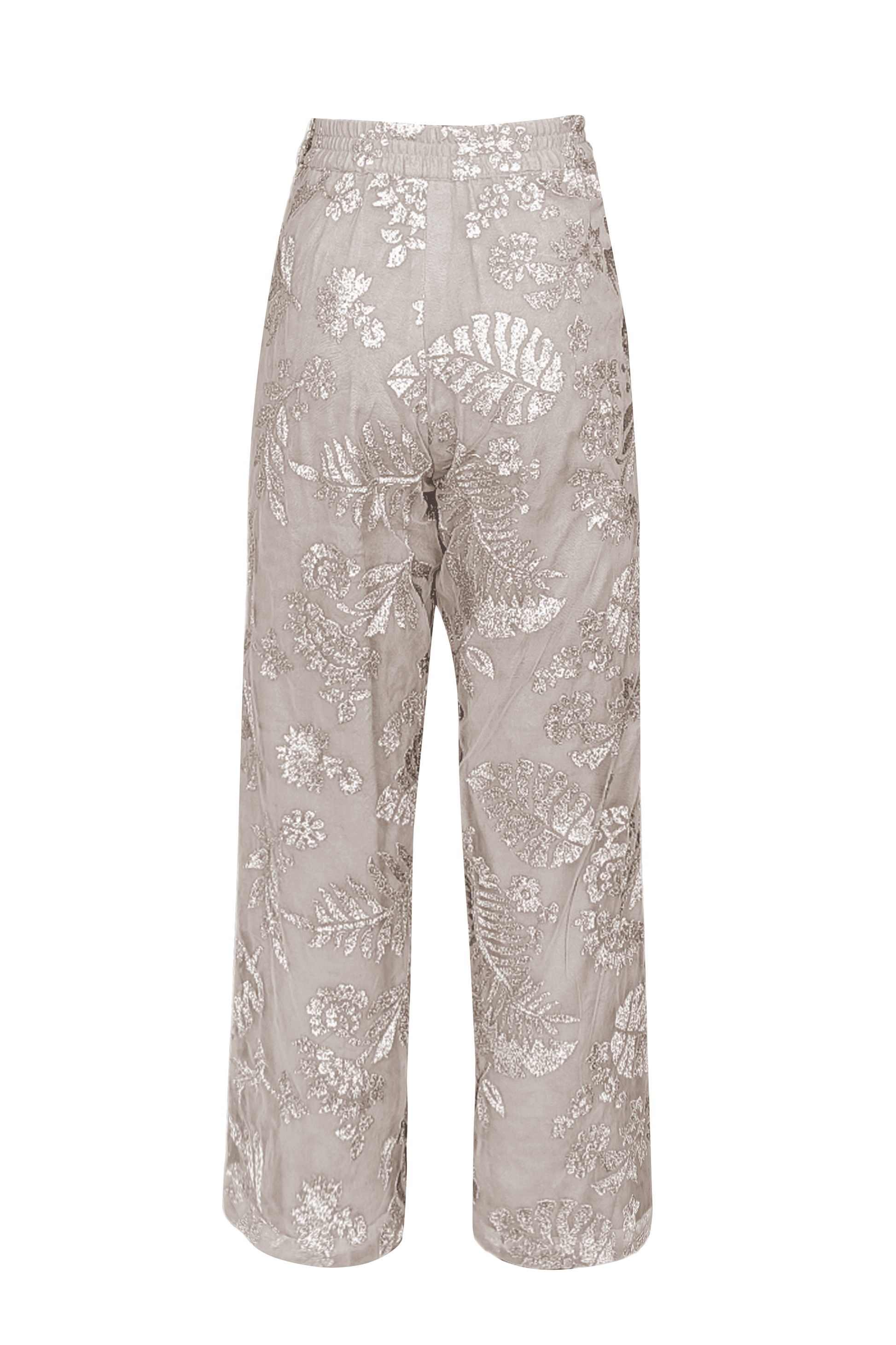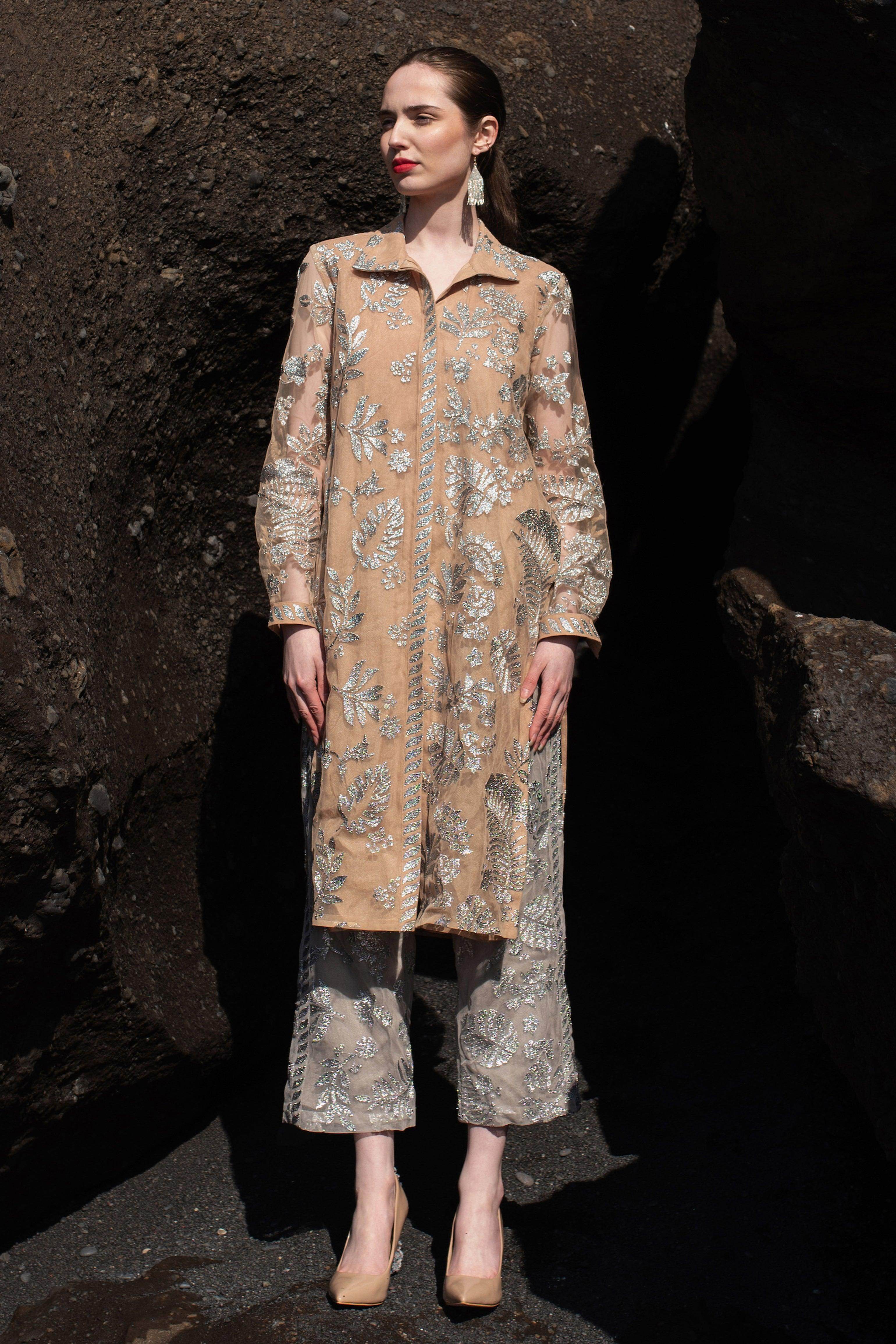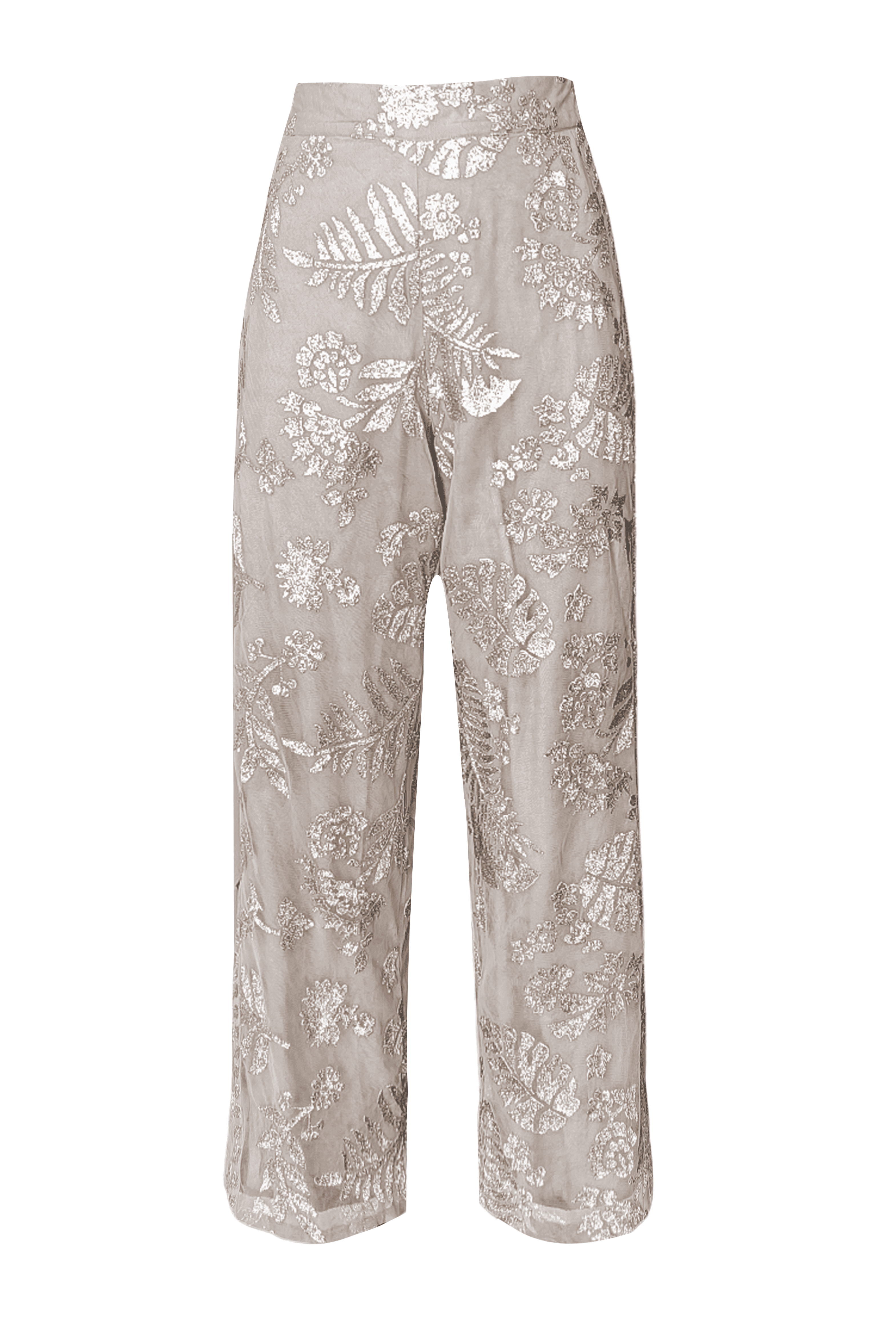 Grey tulle straight-fit pants with tonal silver metallic thread embroidery in badla inspired stitches. Tropical themed motifs framed with geometric borders down the sides. Hook-eye and zip closure on the side. Semi-elasticated at the waist. The garment is fully lined.