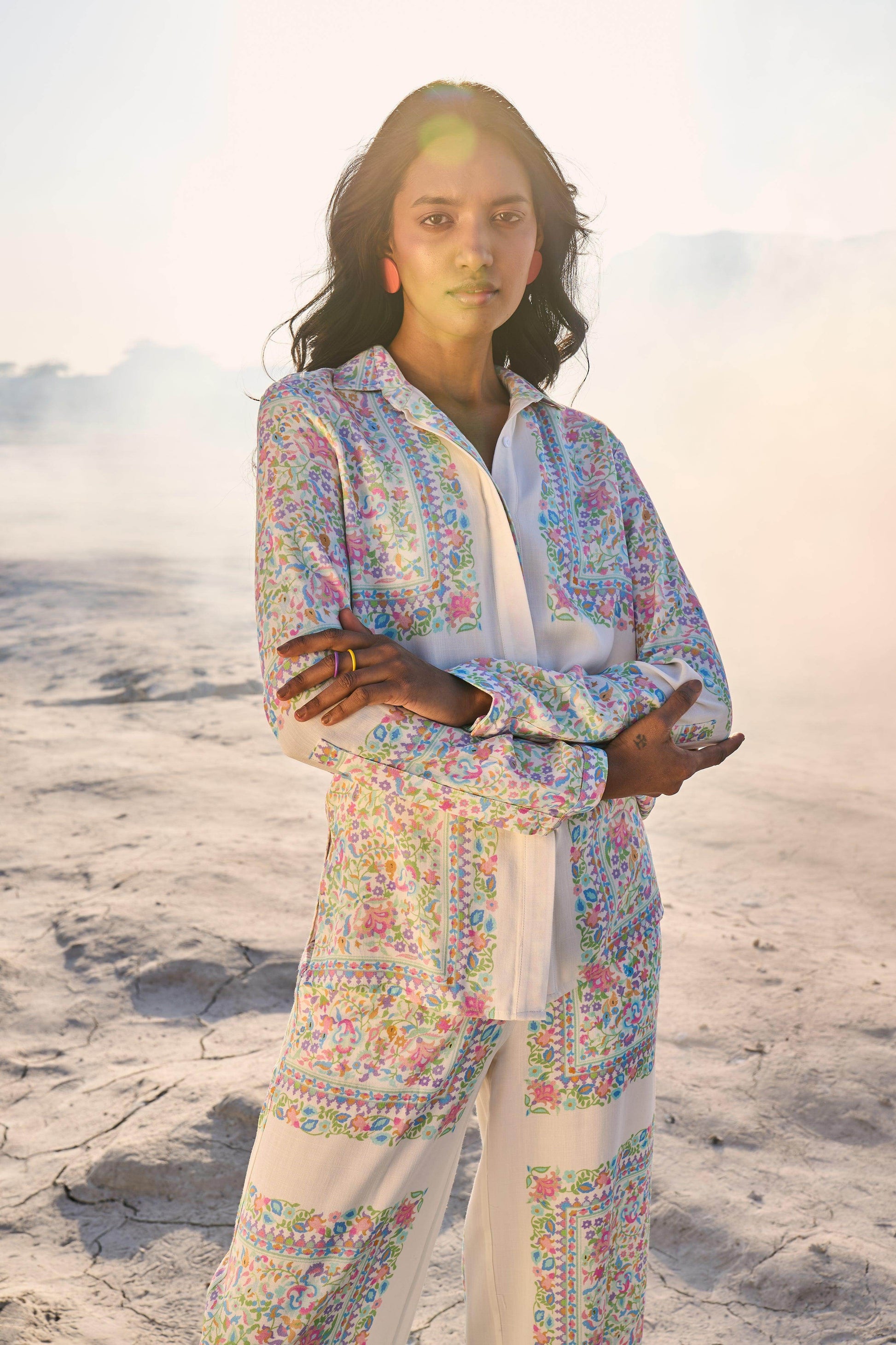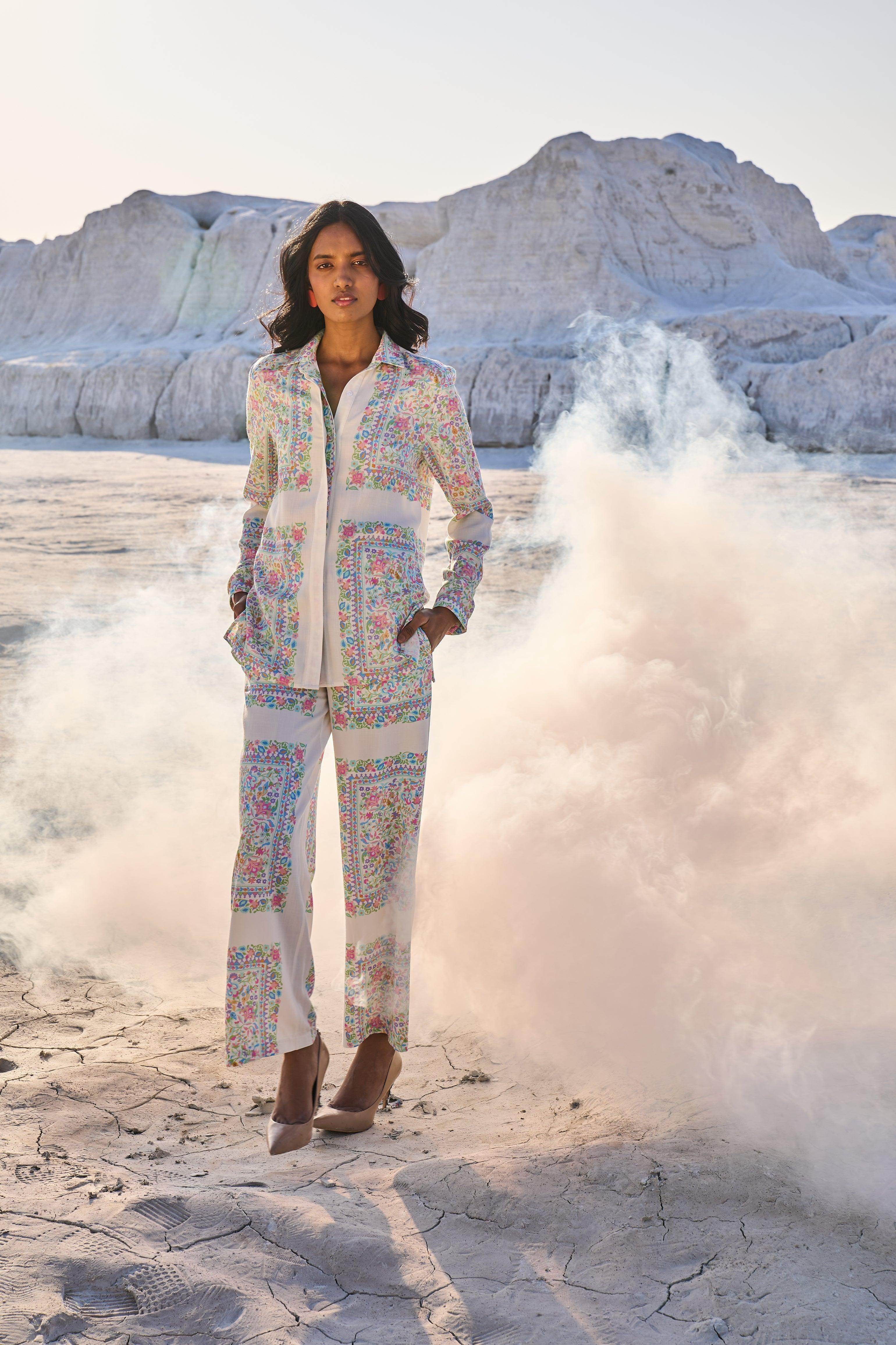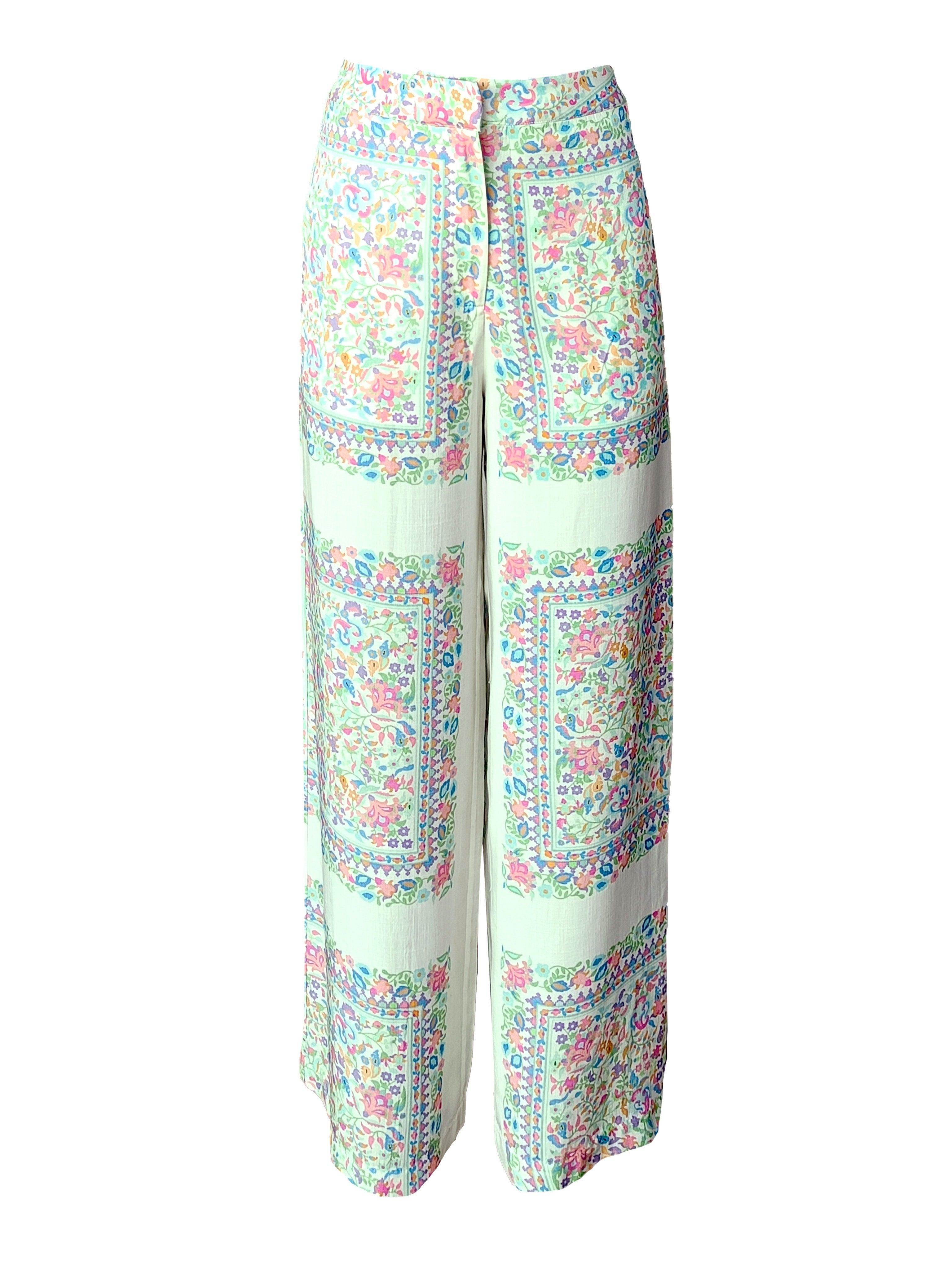 Pastel on ivory placement print inspired by kani shawls. straight-cut pants. Zip front, pockets in the side.