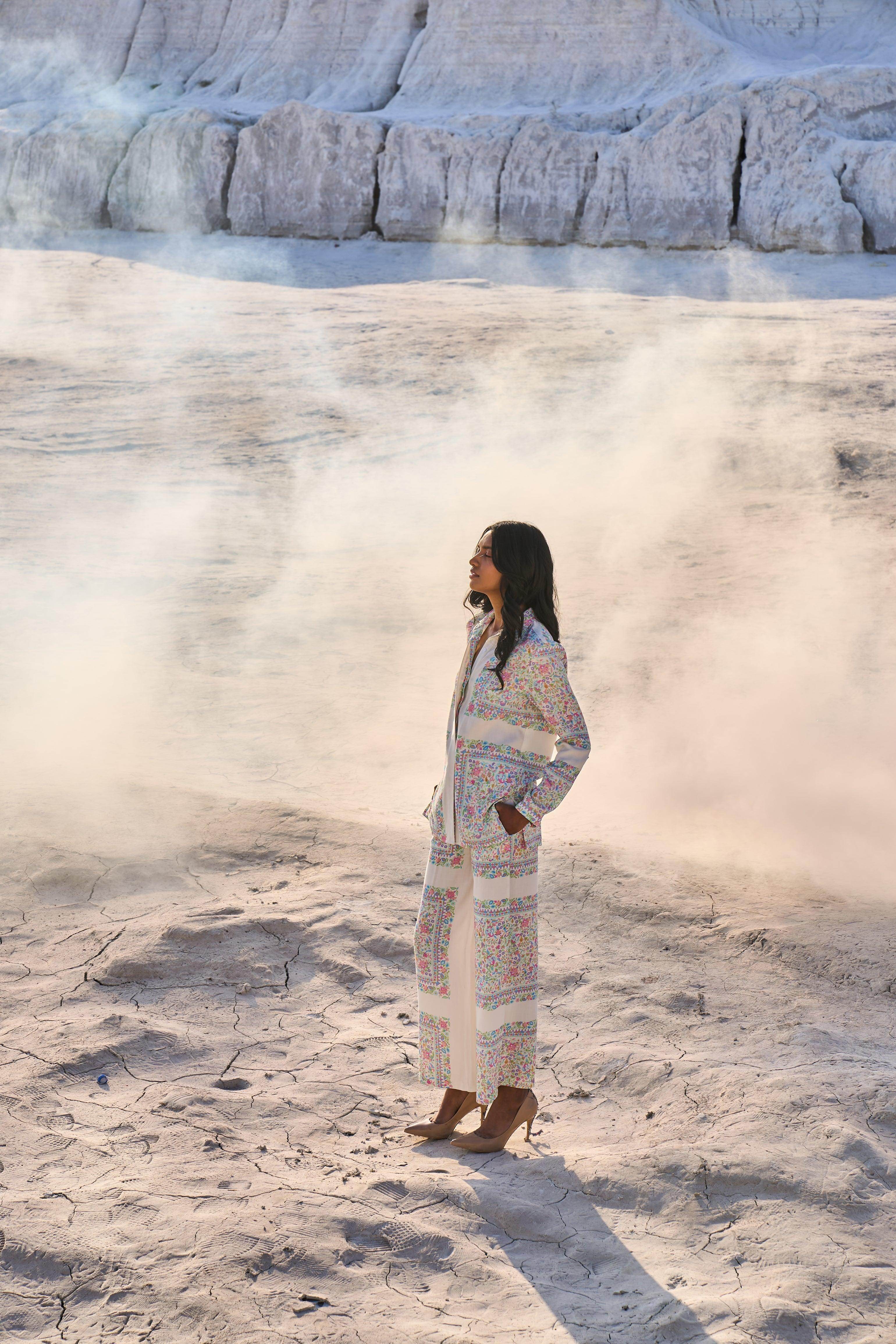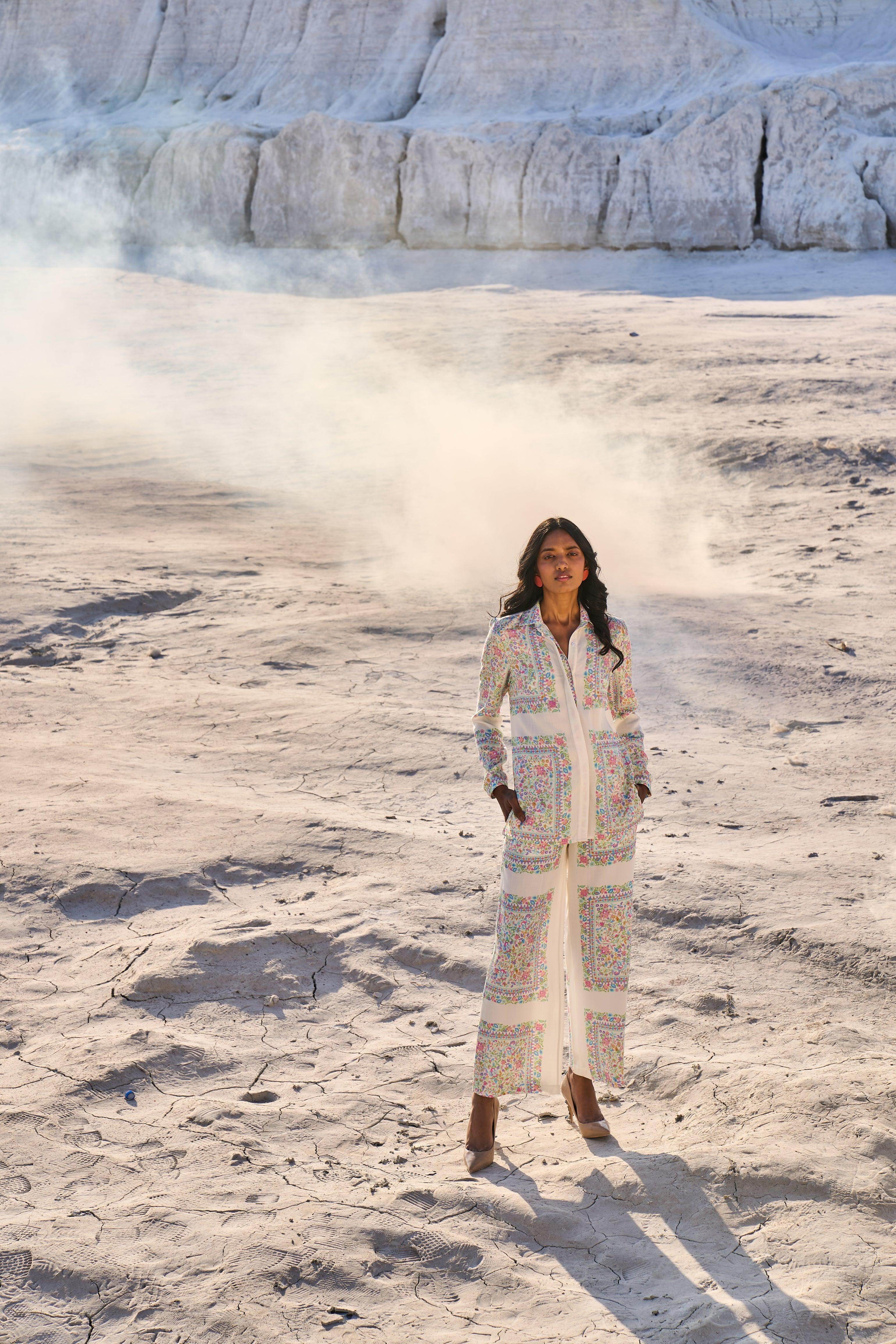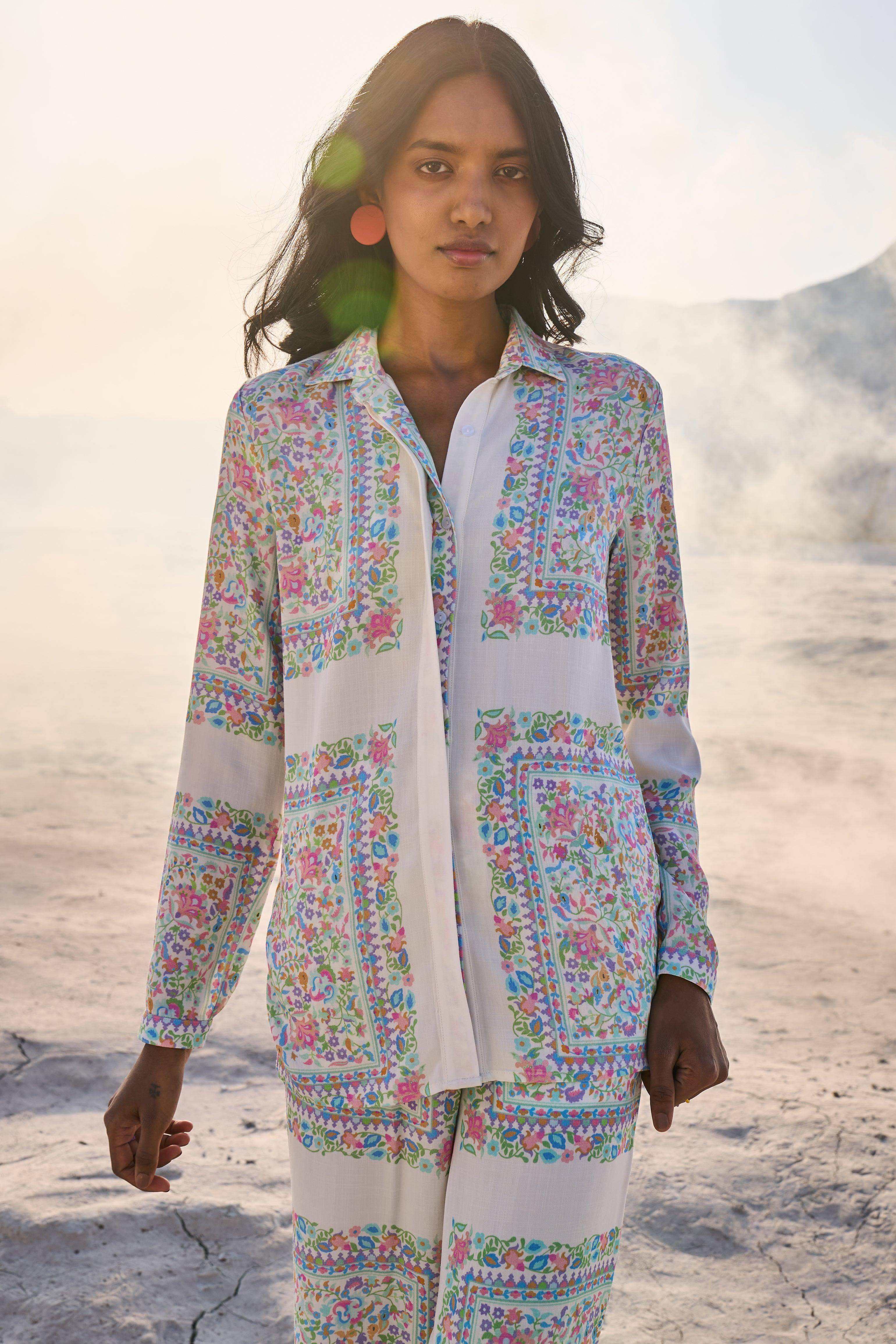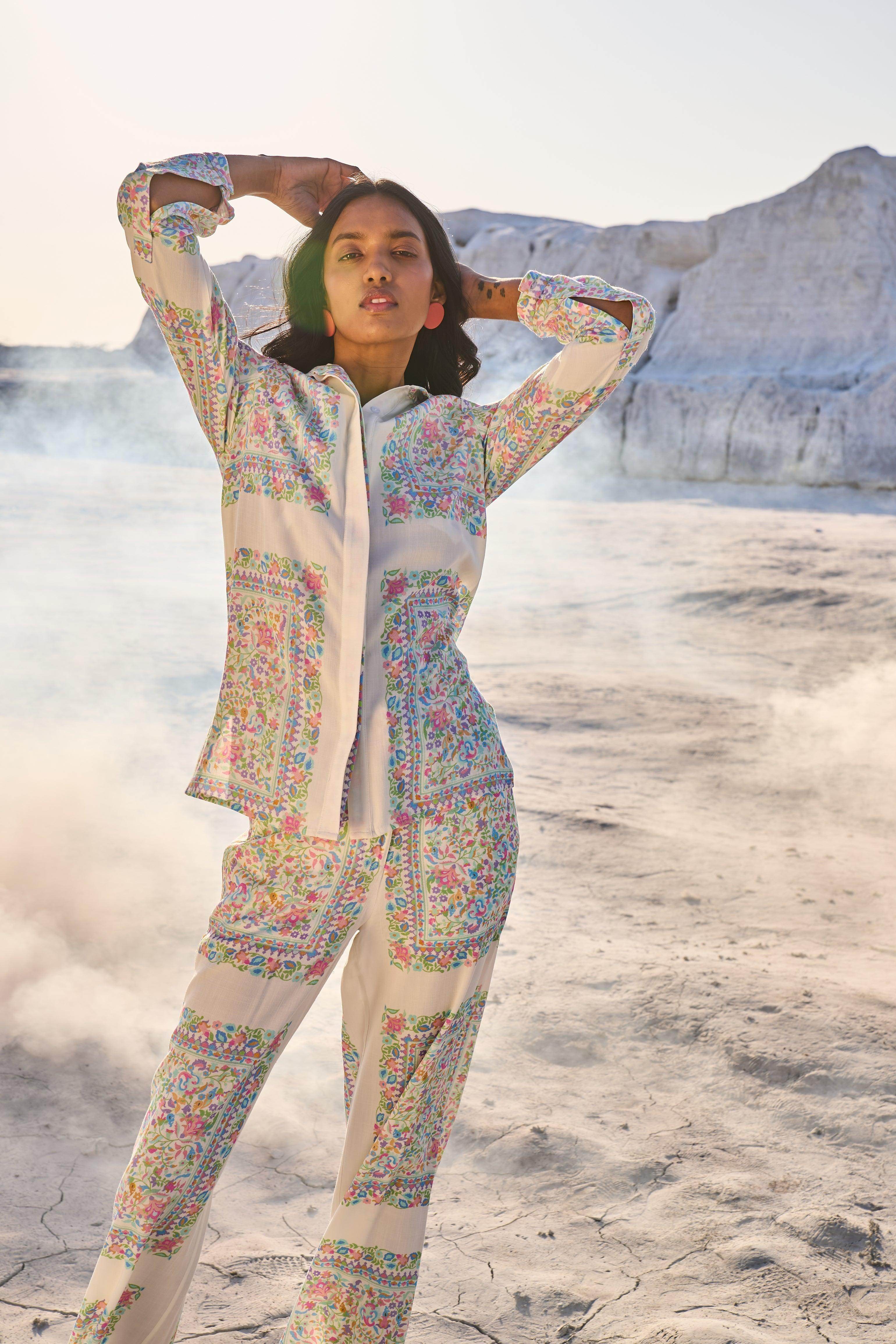 Pastel on ivory placement print inspired by kani shawls. straight-cut pants. Zip front, pockets in the side.