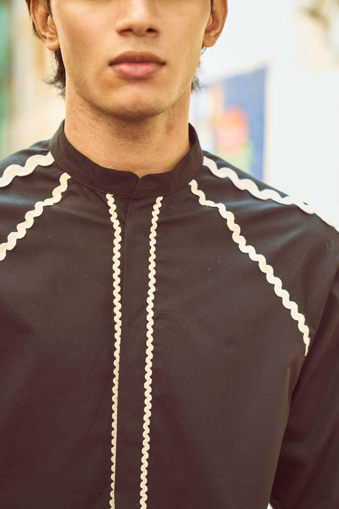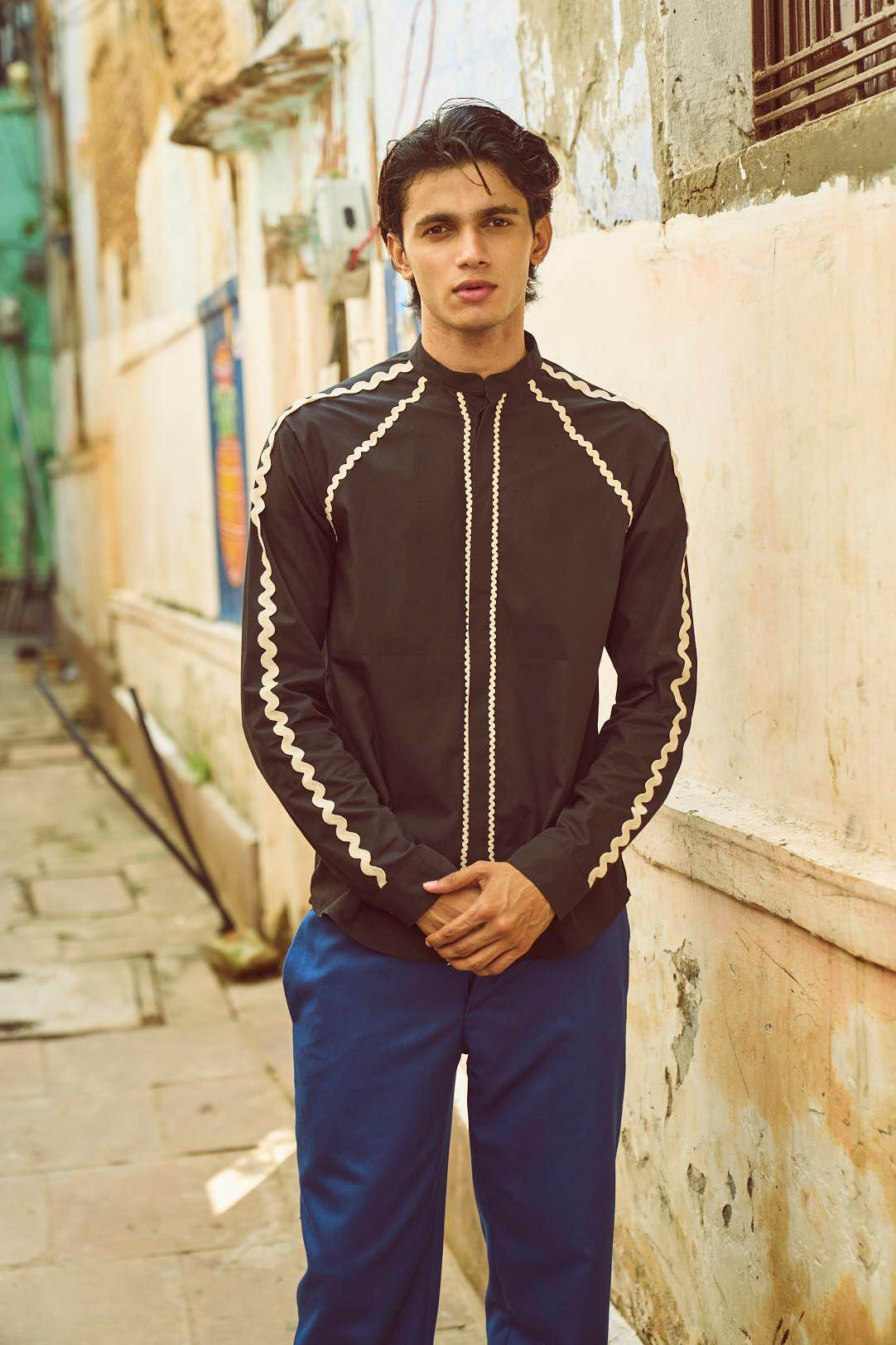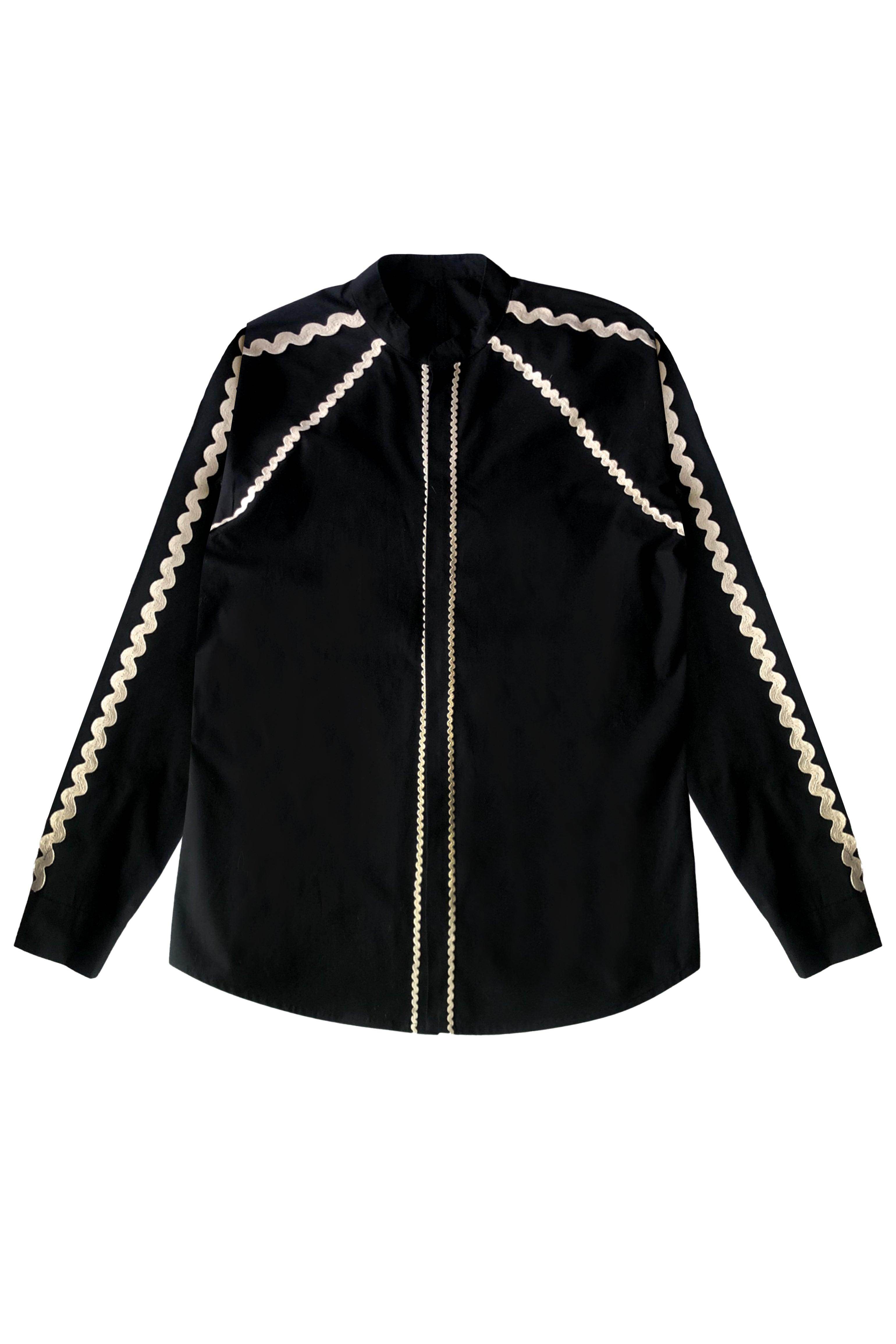 Band collar shirt in black cotton poplin. Contrasting ivory rick-rack tape placed on the center, front, shoulder, back, and sleeves in varying sizes. Concealed button placket. Full sleeves. Regular fit.