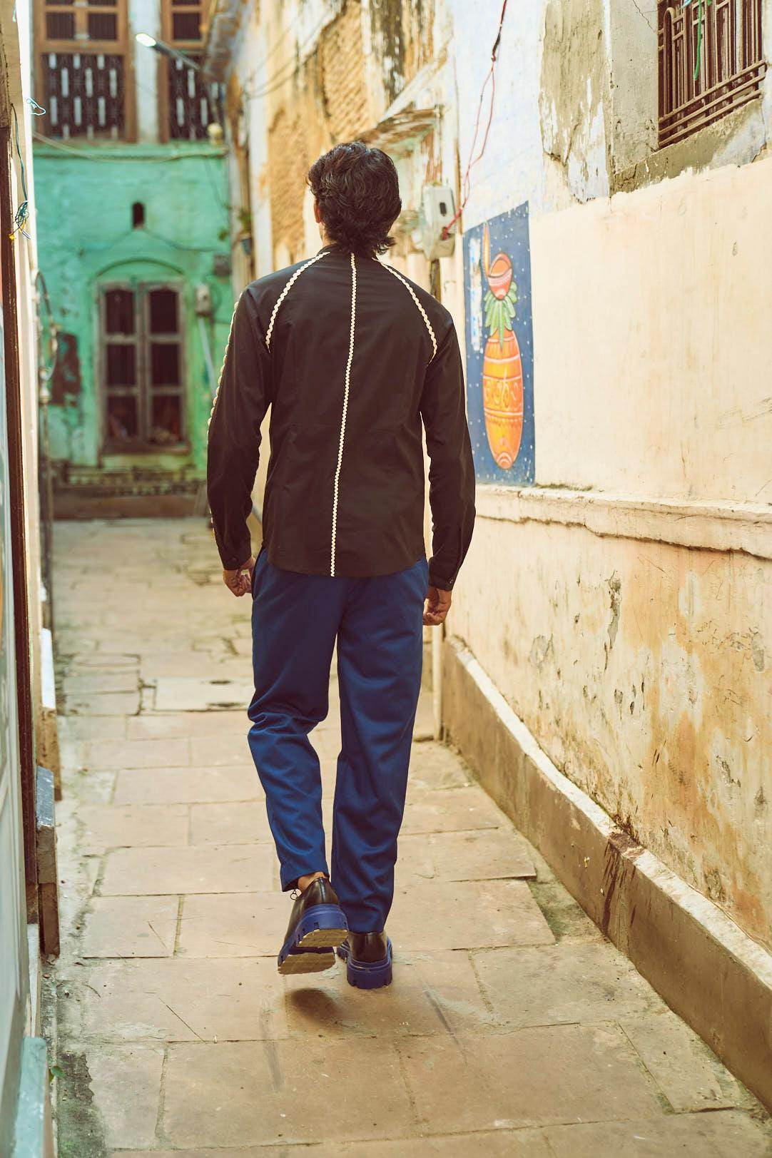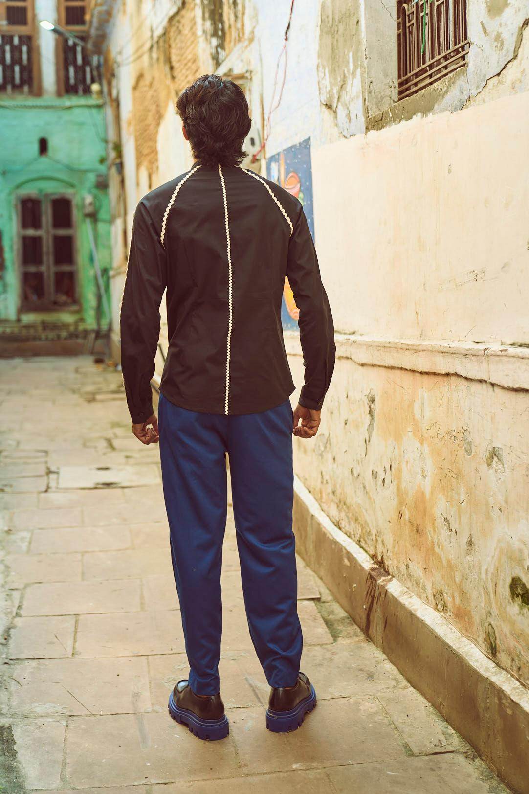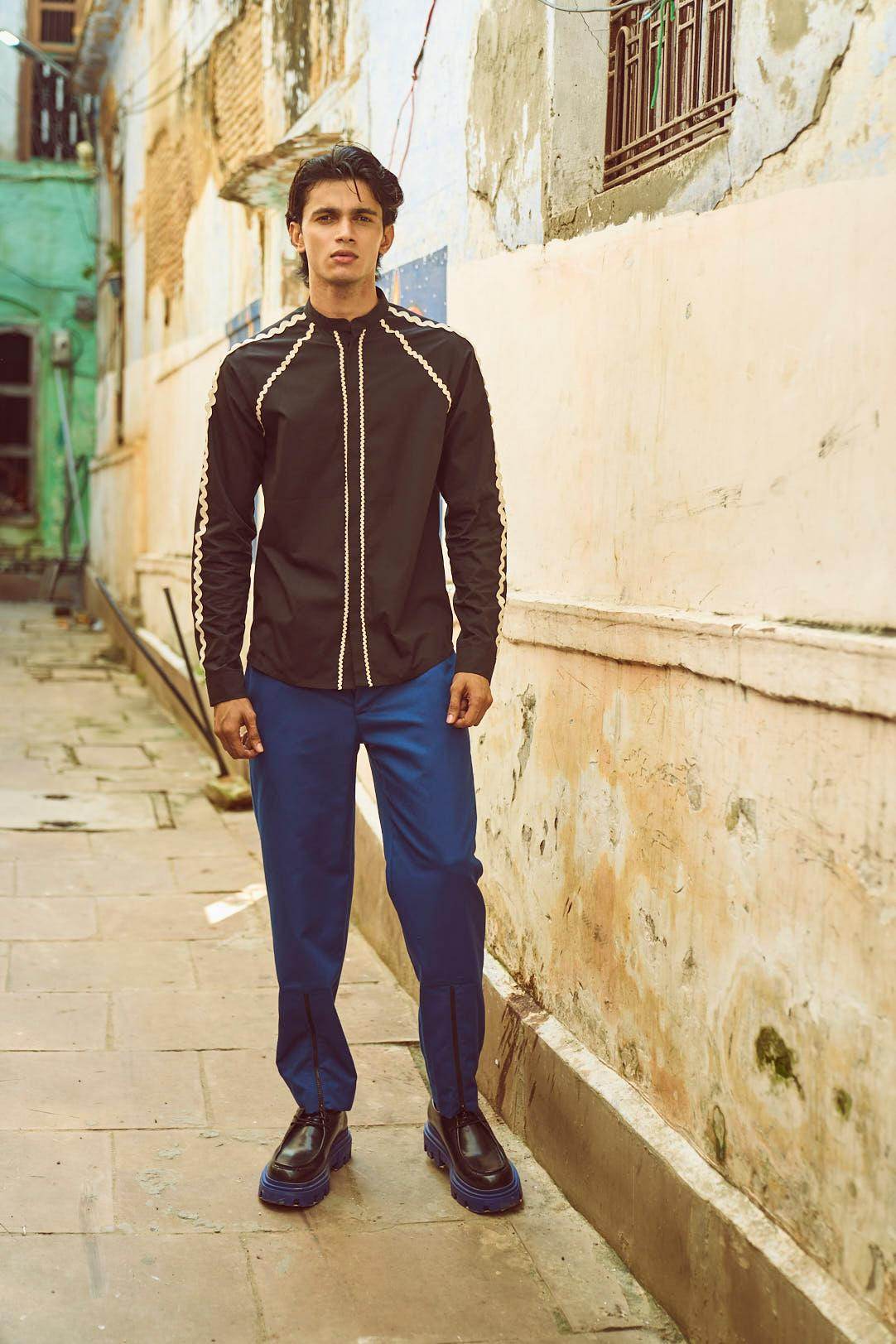 Band collar shirt in black cotton poplin. Contrasting ivory rick-rack tape placed on the center, front, shoulder, back, and sleeves in varying sizes. Concealed button placket. Full sleeves. Regular fit.