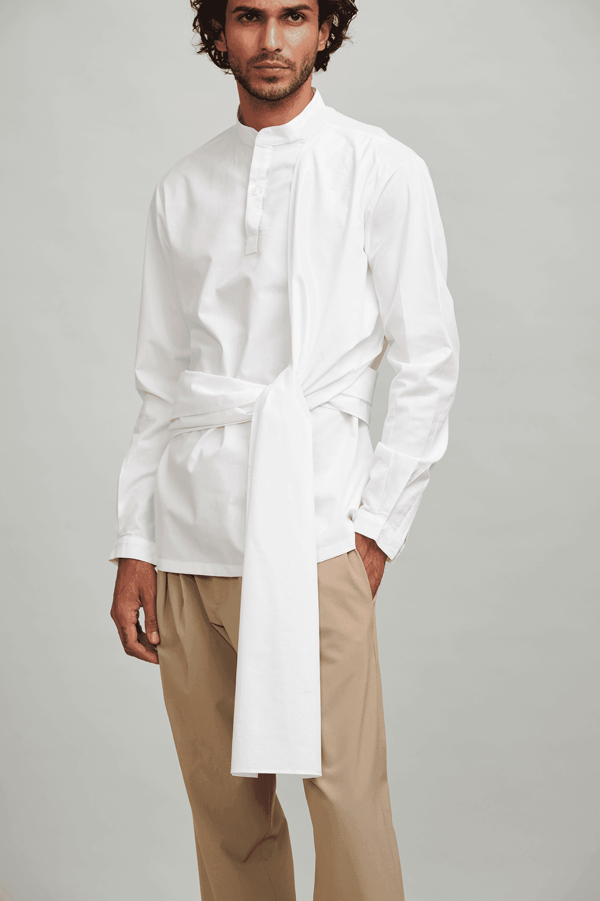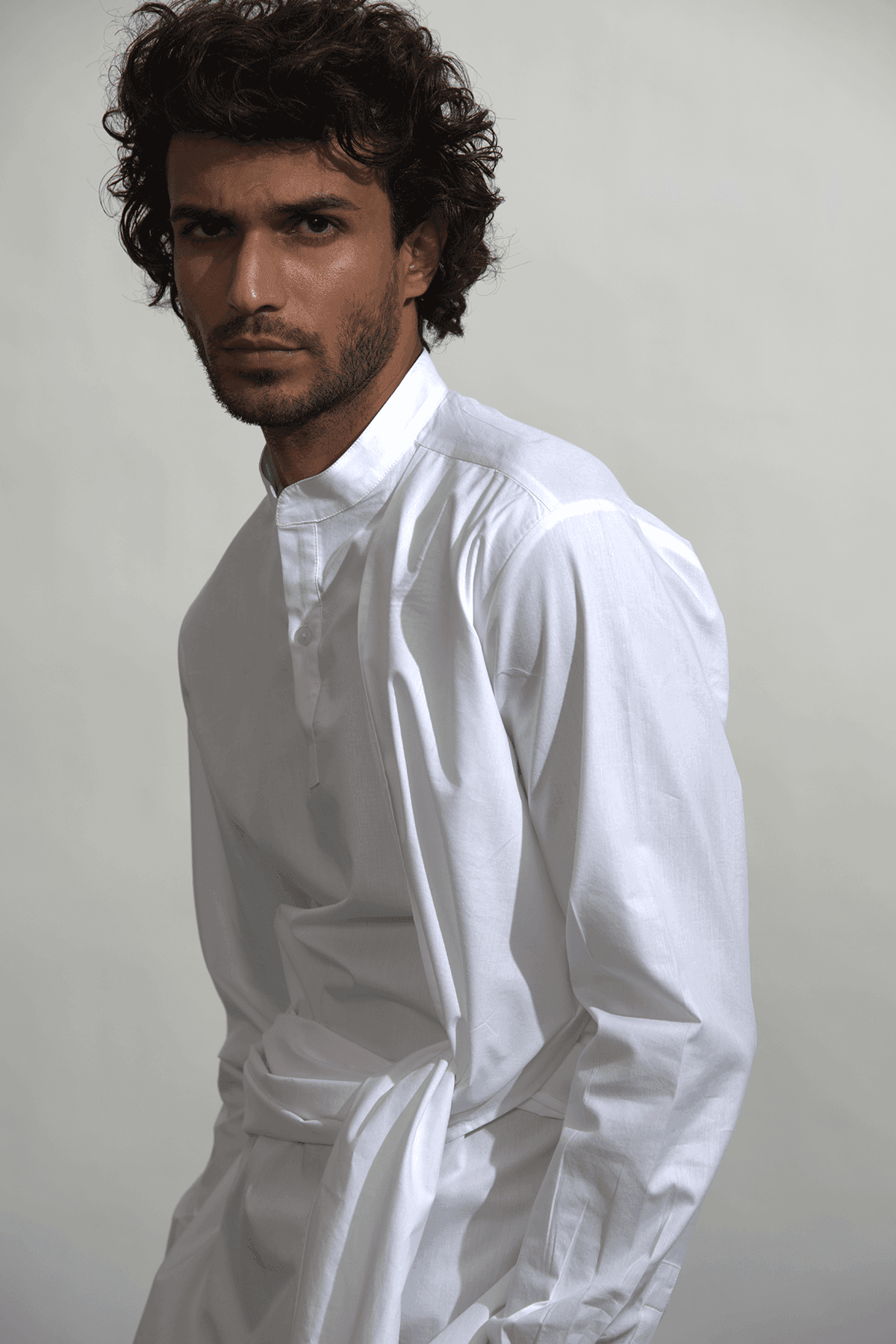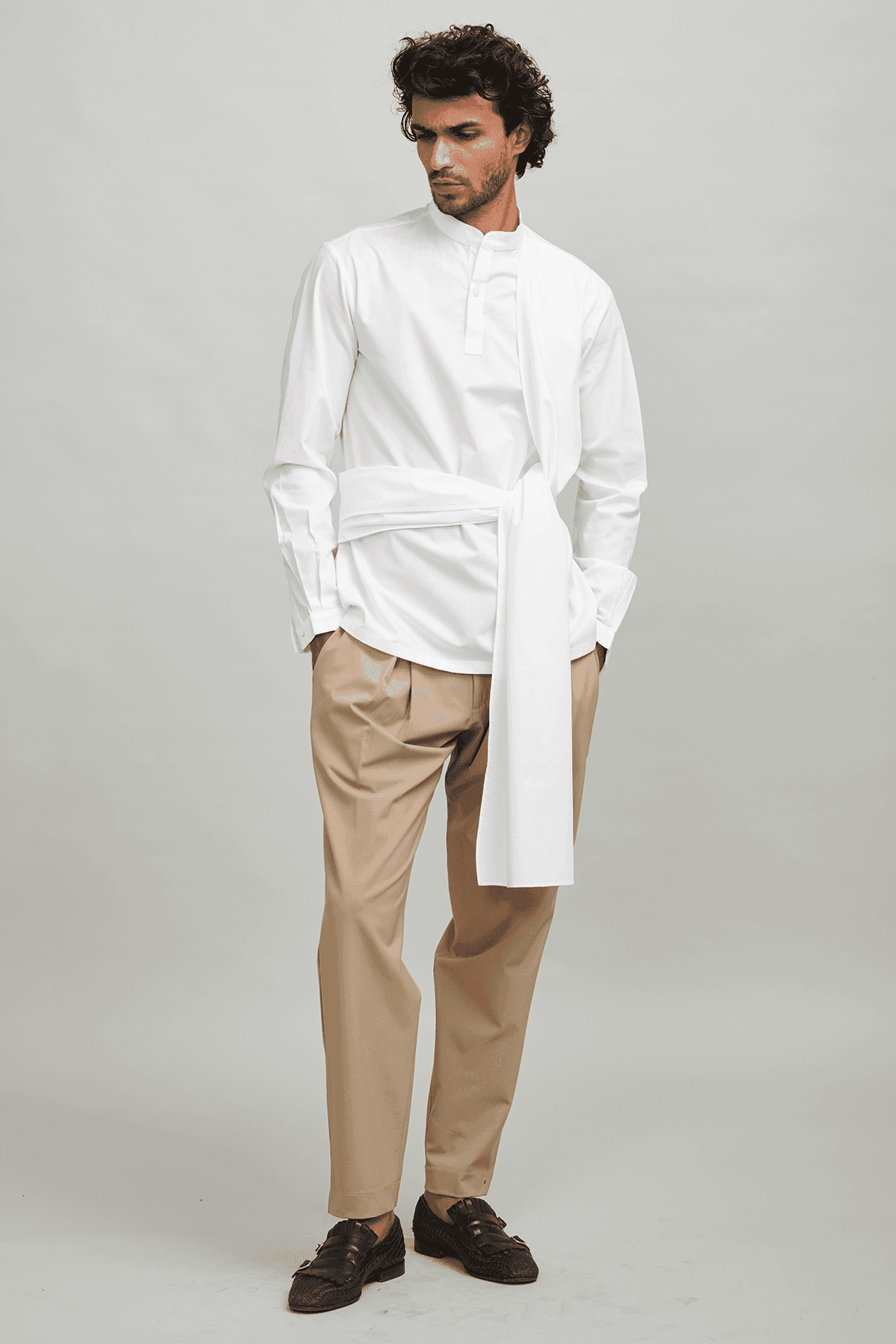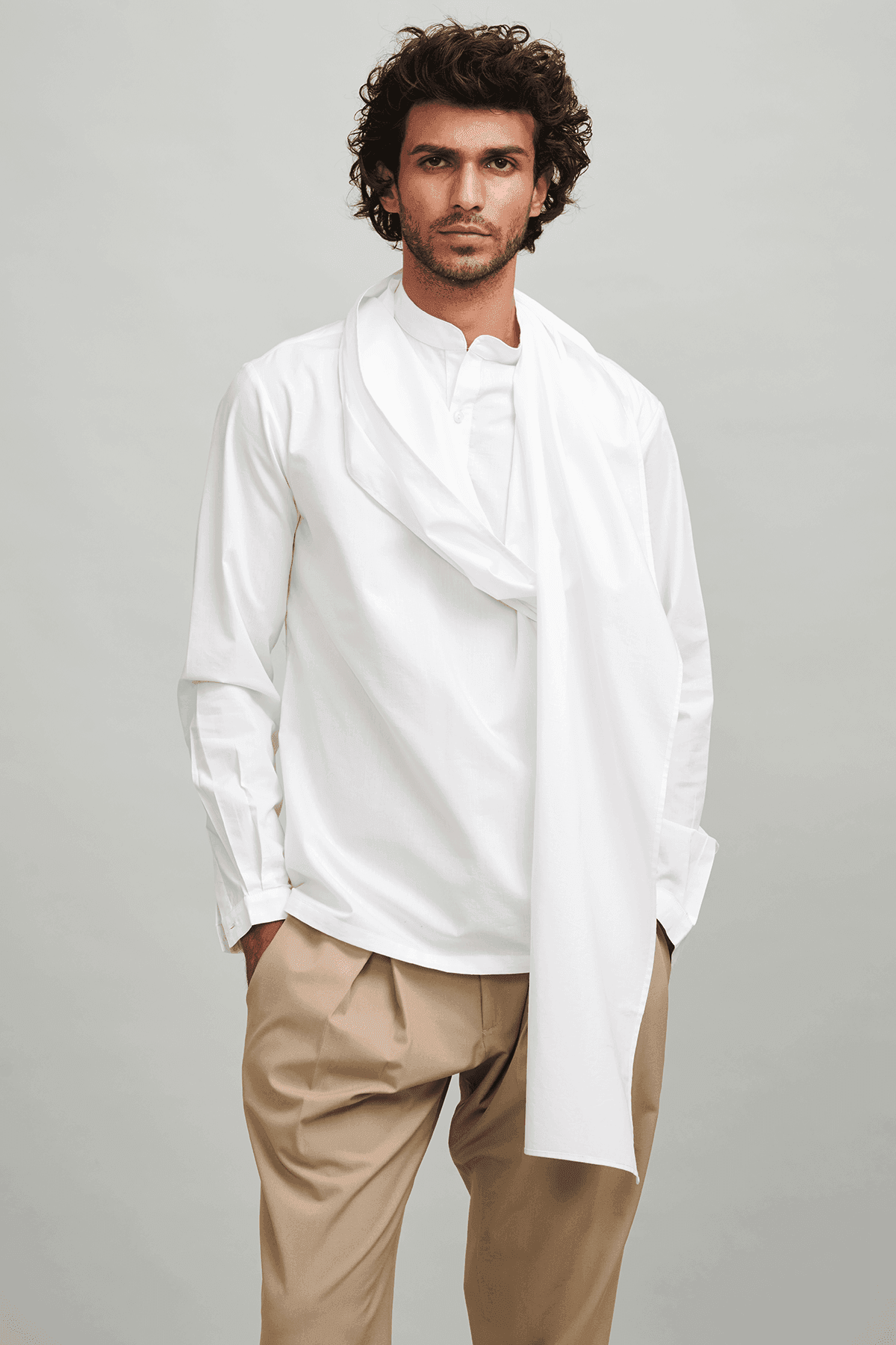 White poplin full sleeve band collar shirt. Attached scarf, can be worn 3 ways: as a scarf, as a wrap or left loose.