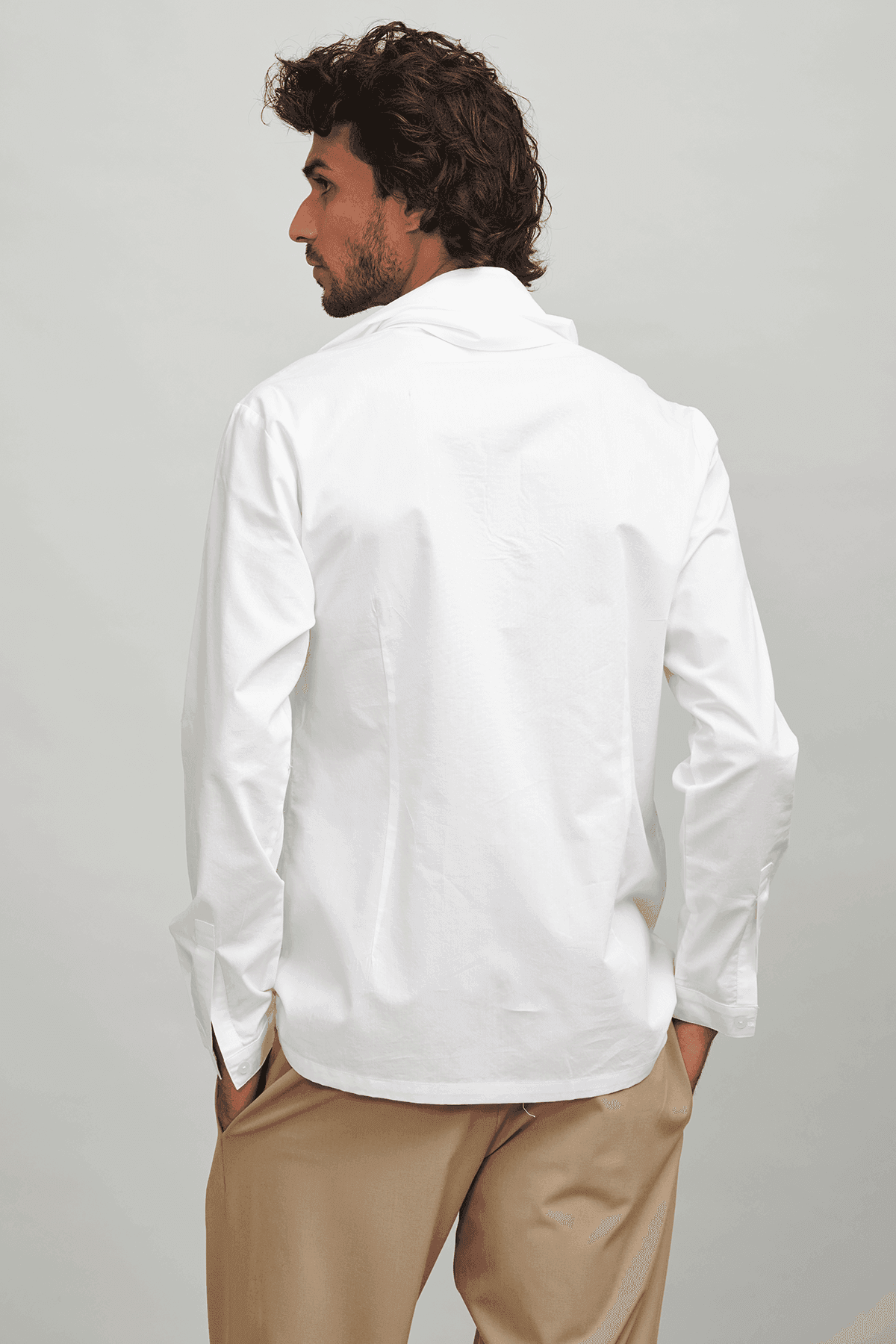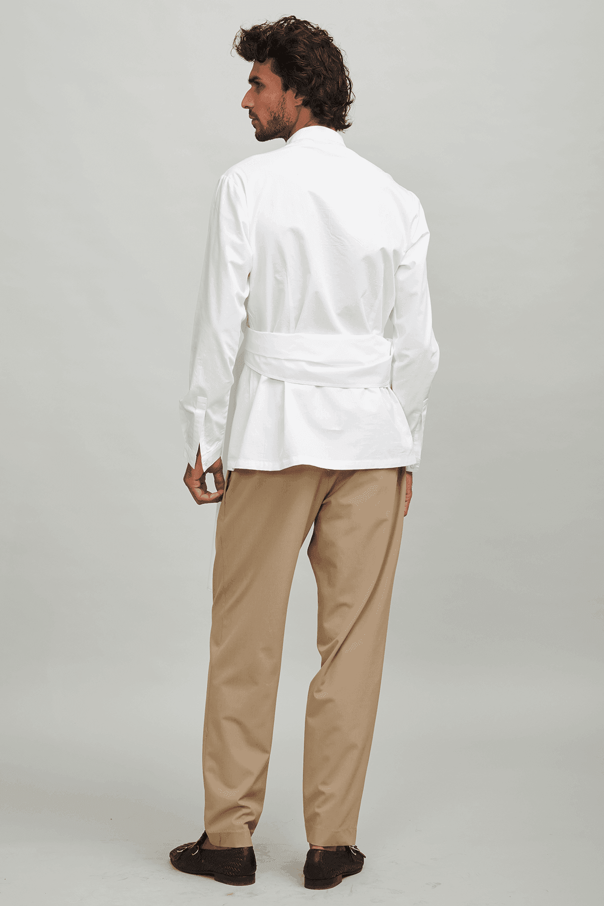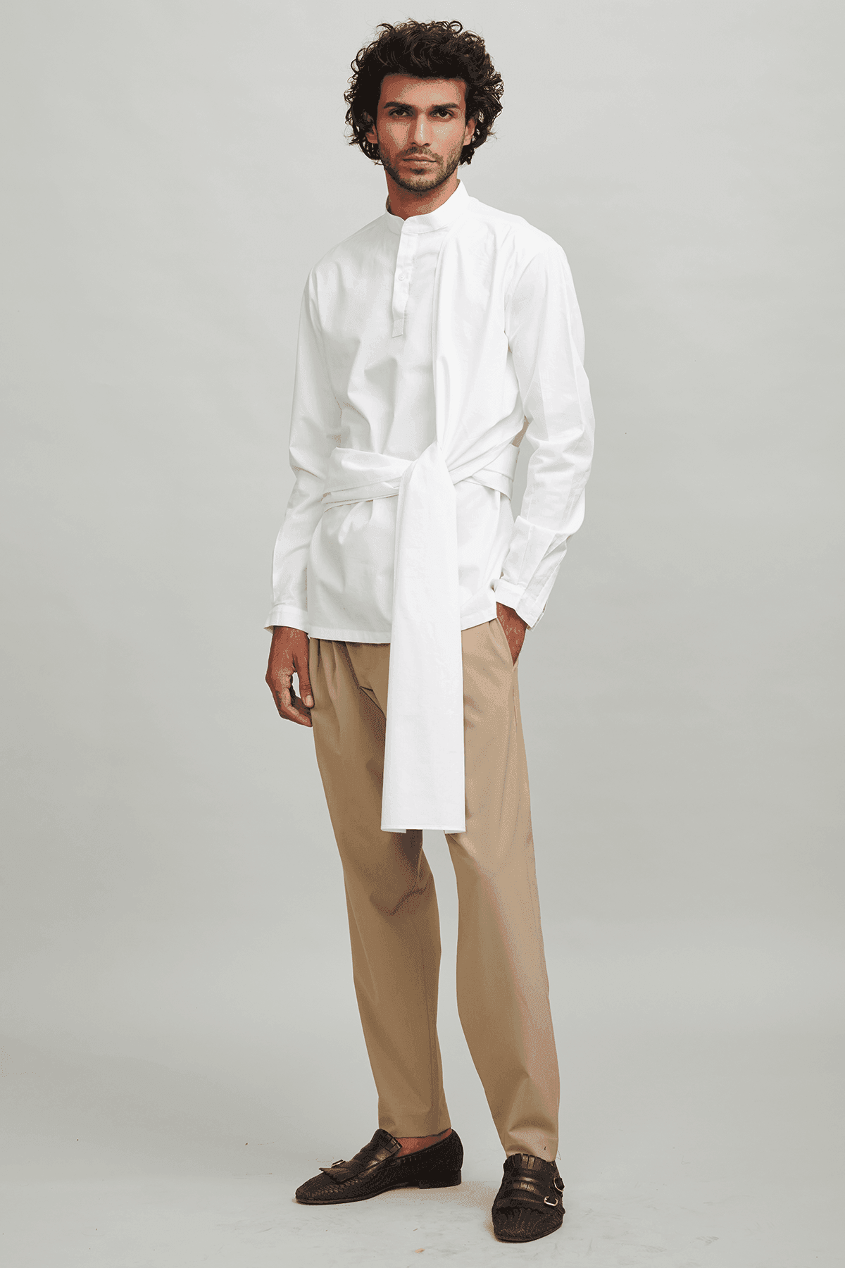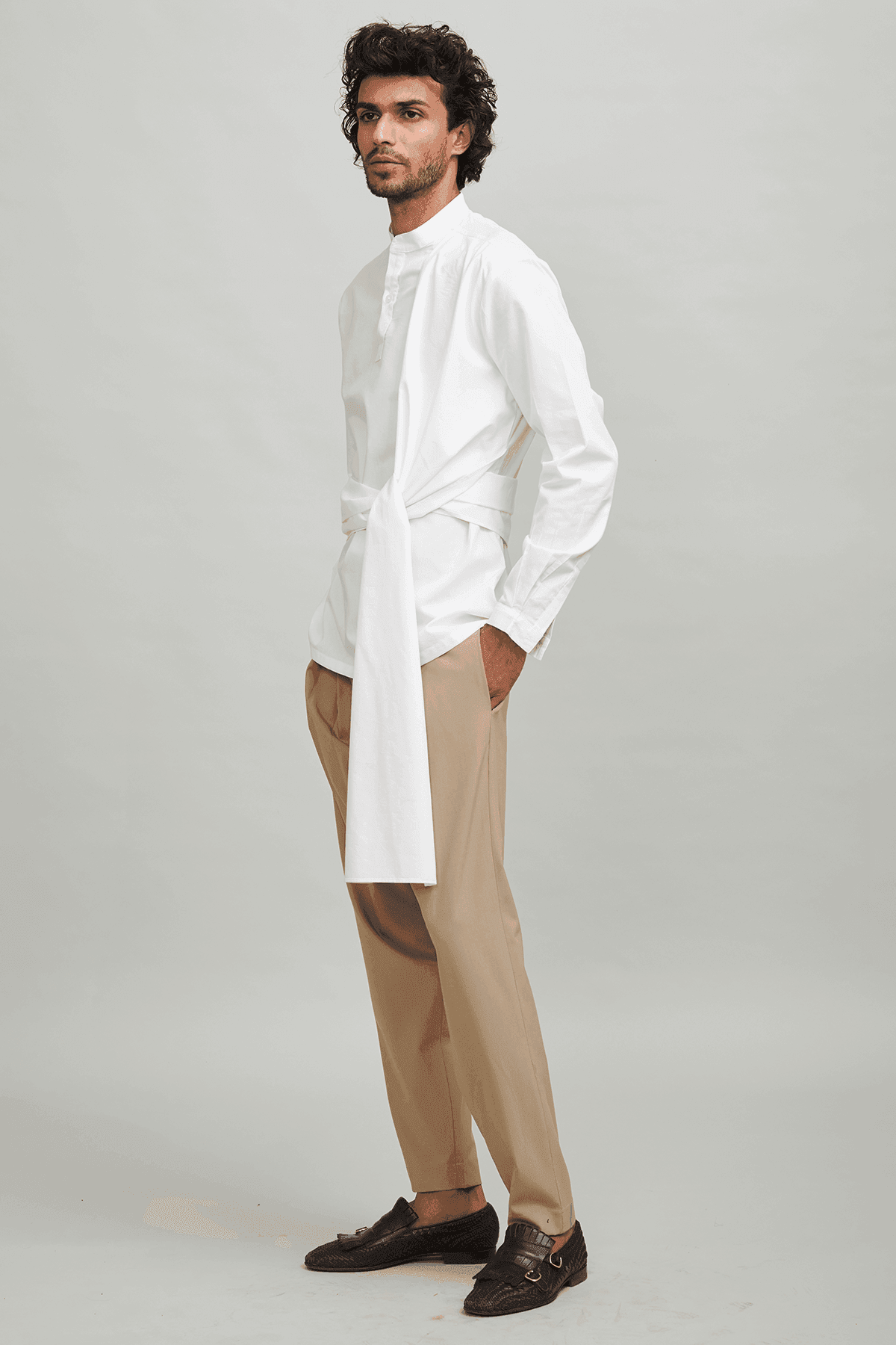 White poplin full sleeve band collar shirt. Attached scarf, can be worn 3 ways: as a scarf, as a wrap or left loose.