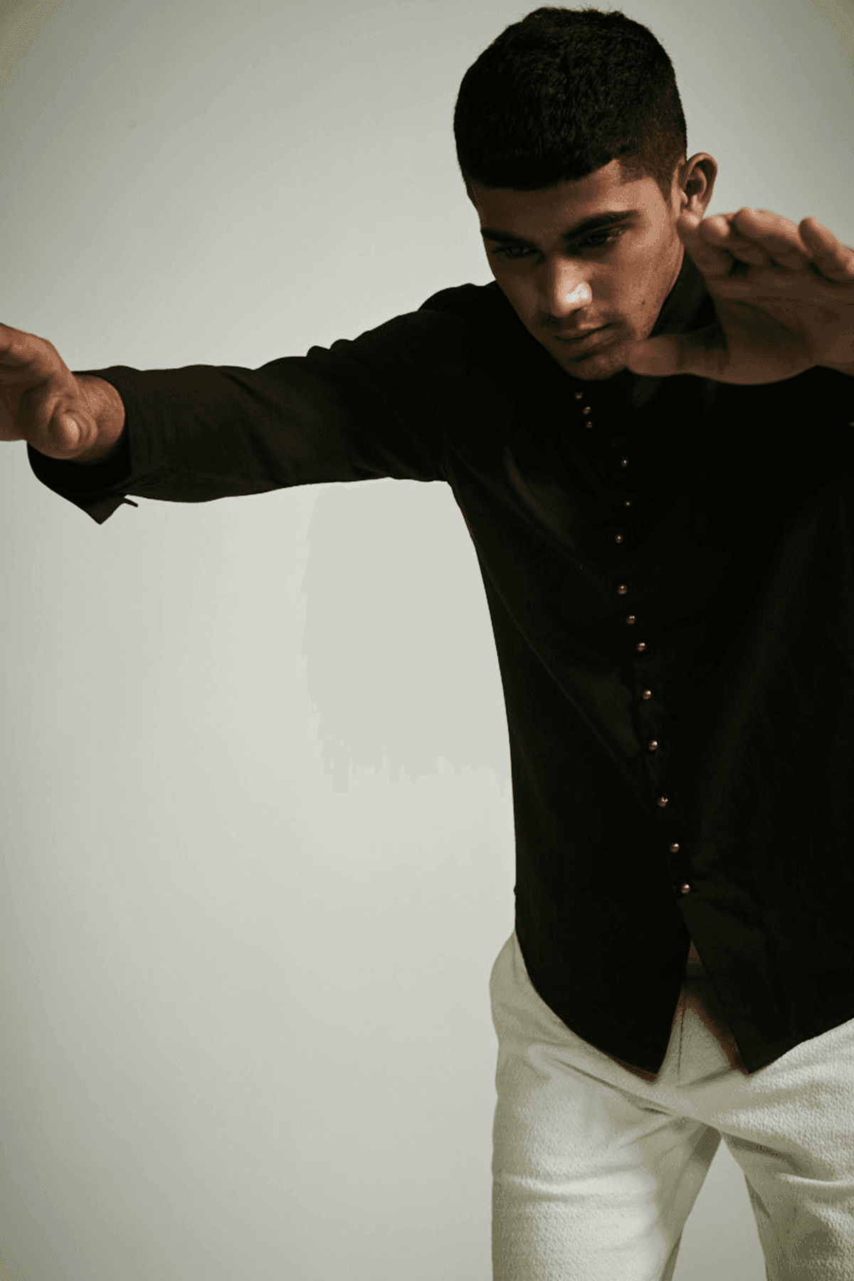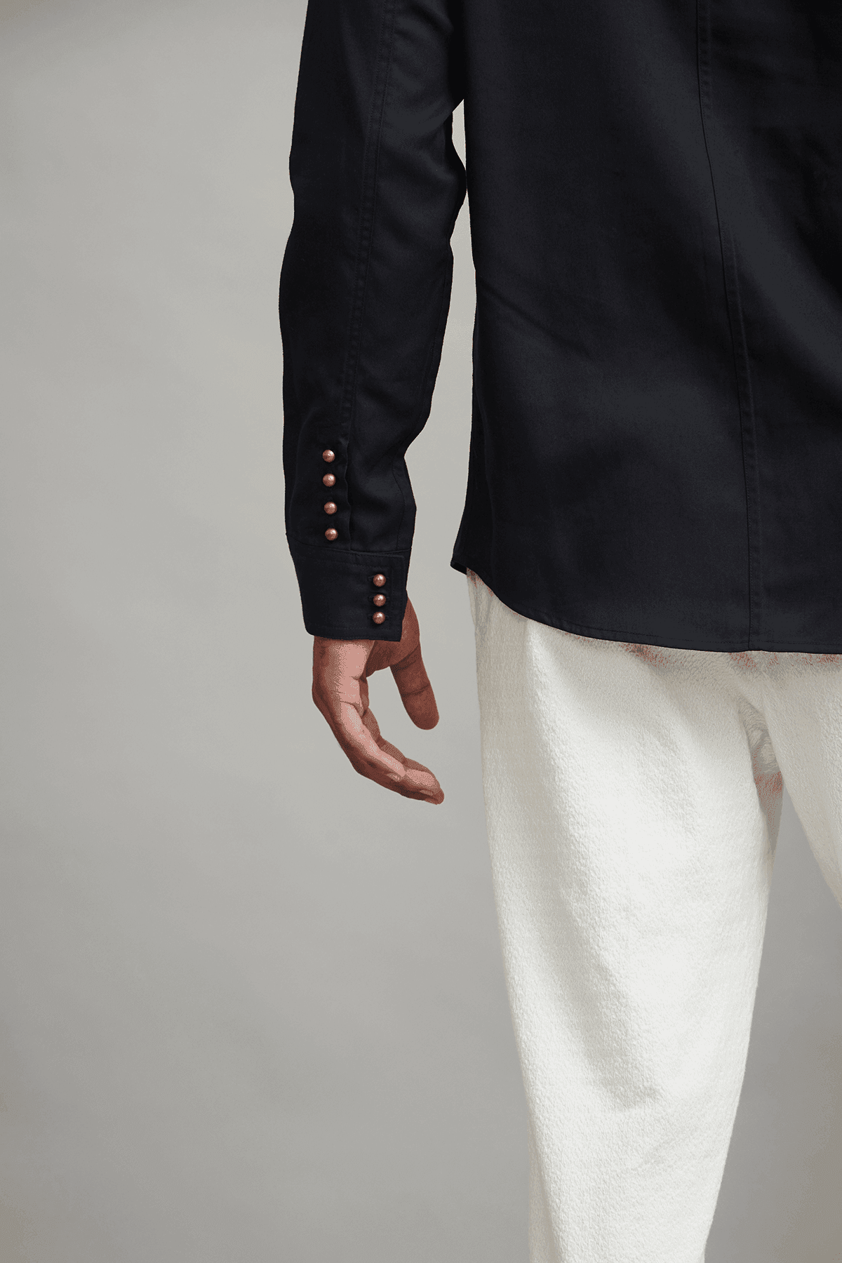 High neckband collar. Exaggerated antique finish shank buttons on the collar, placket, and cuff. Regular fit.