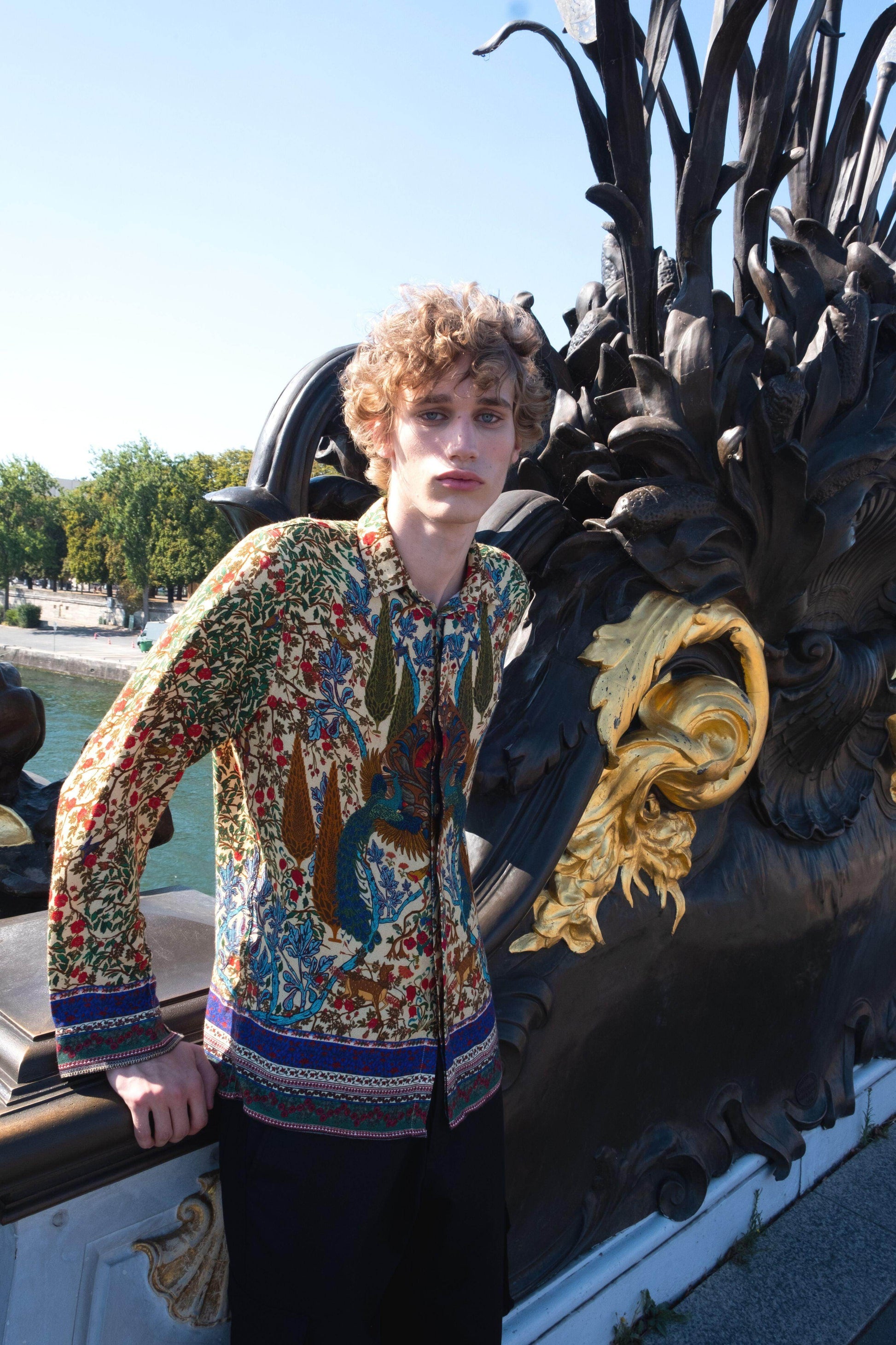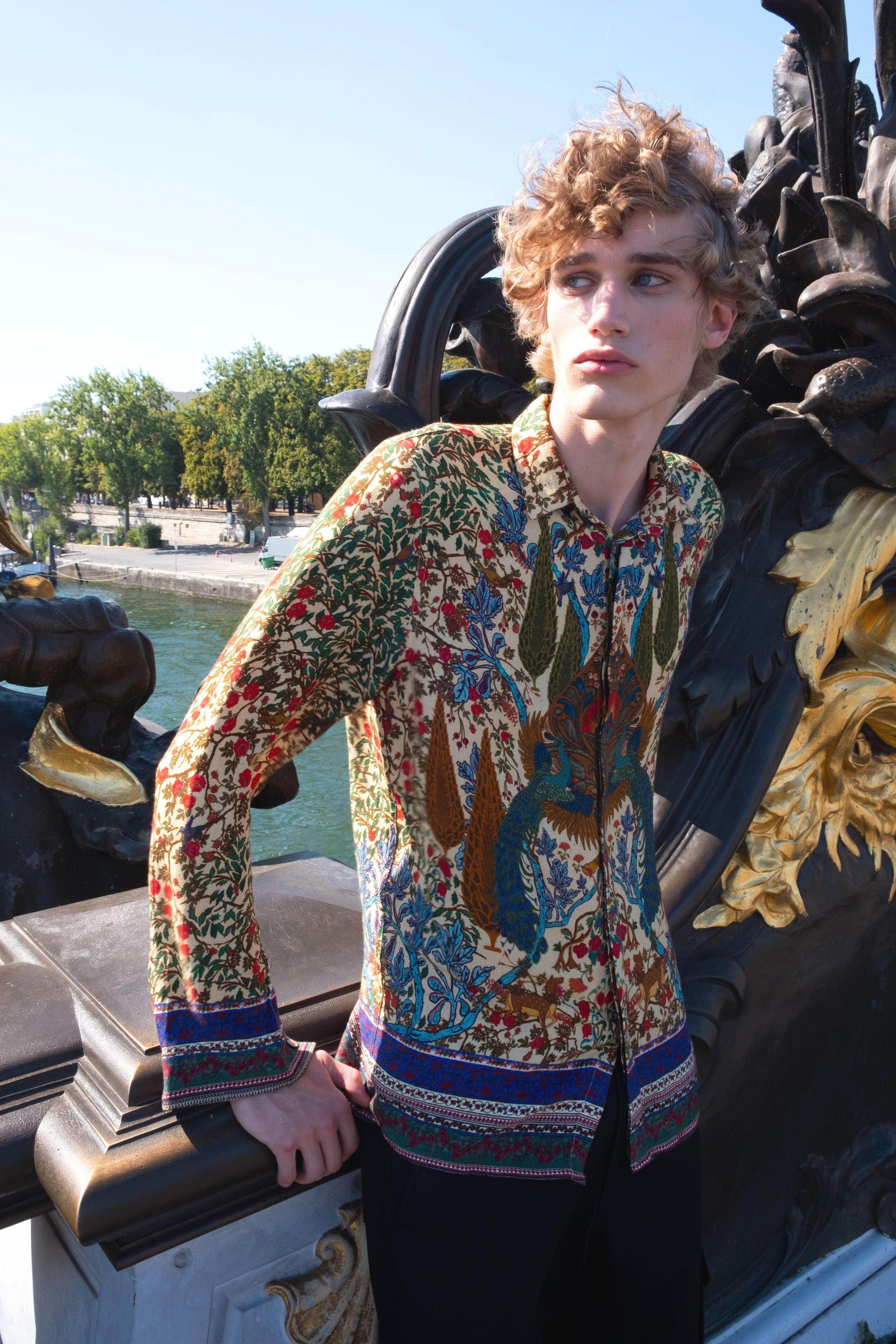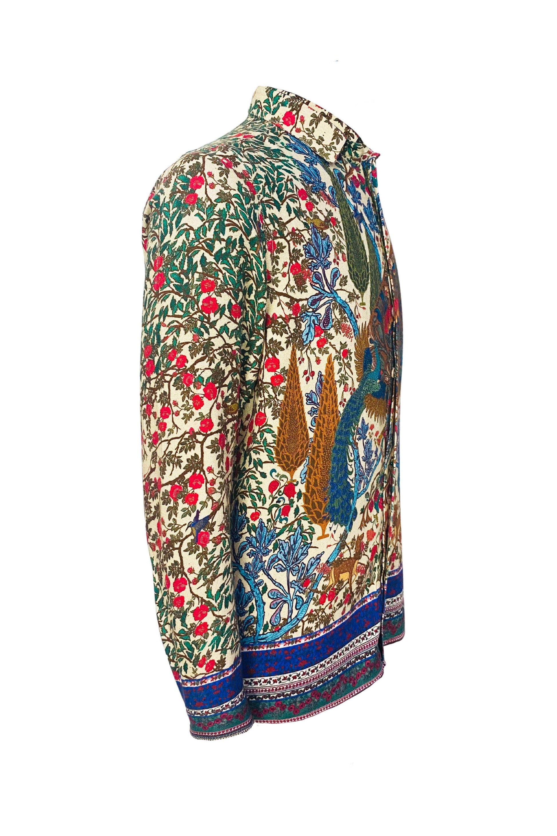 Full sleeve multicolor shirt with tapestry inspired placement print. Border on the cuff and bottom hem. Concealed placket, regular fit. Textured organic viscose.