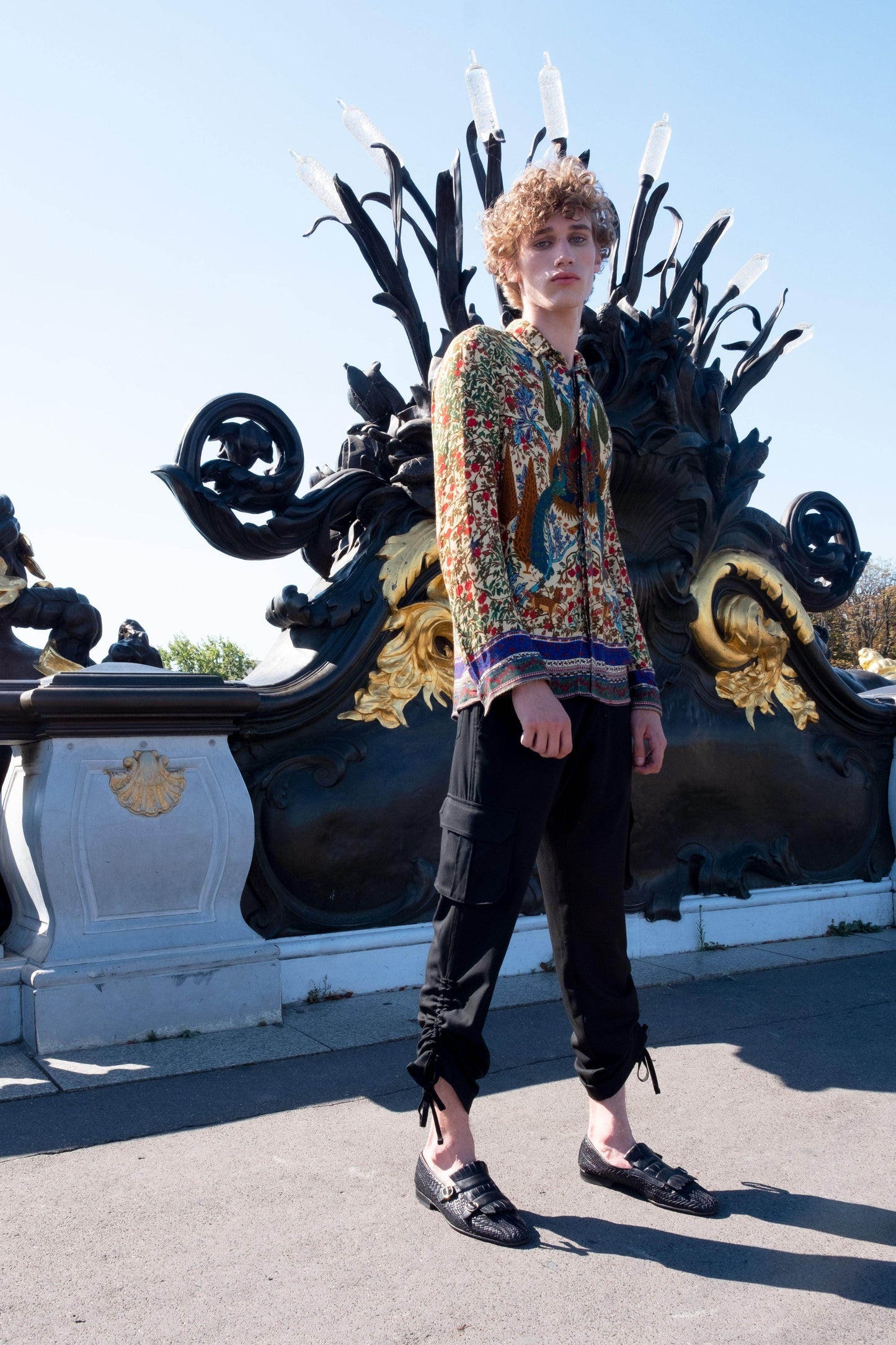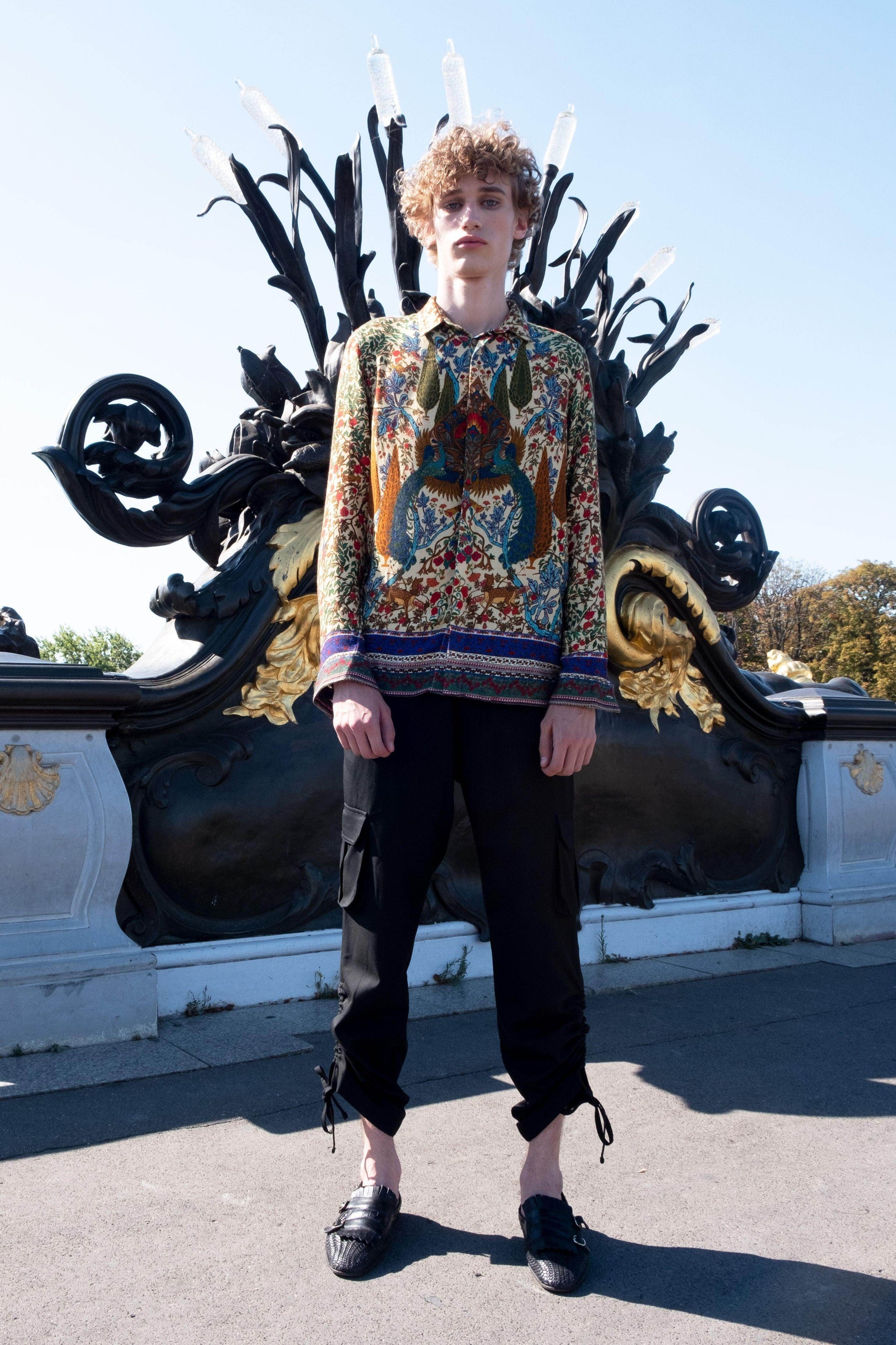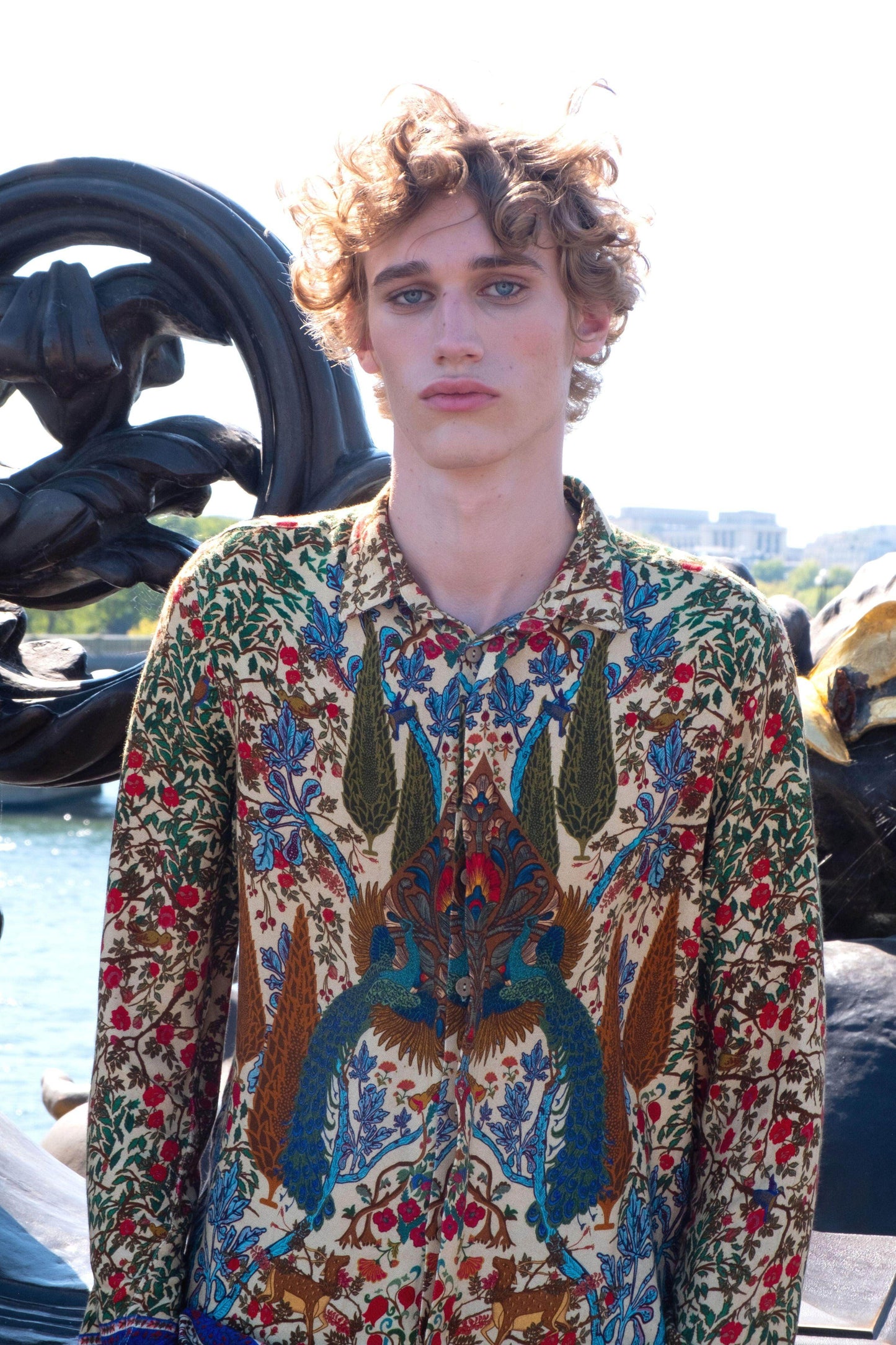 Full sleeve multicolor shirt with tapestry inspired placement print. Border on the cuff and bottom hem. Concealed placket, regular fit. Textured organic viscose.