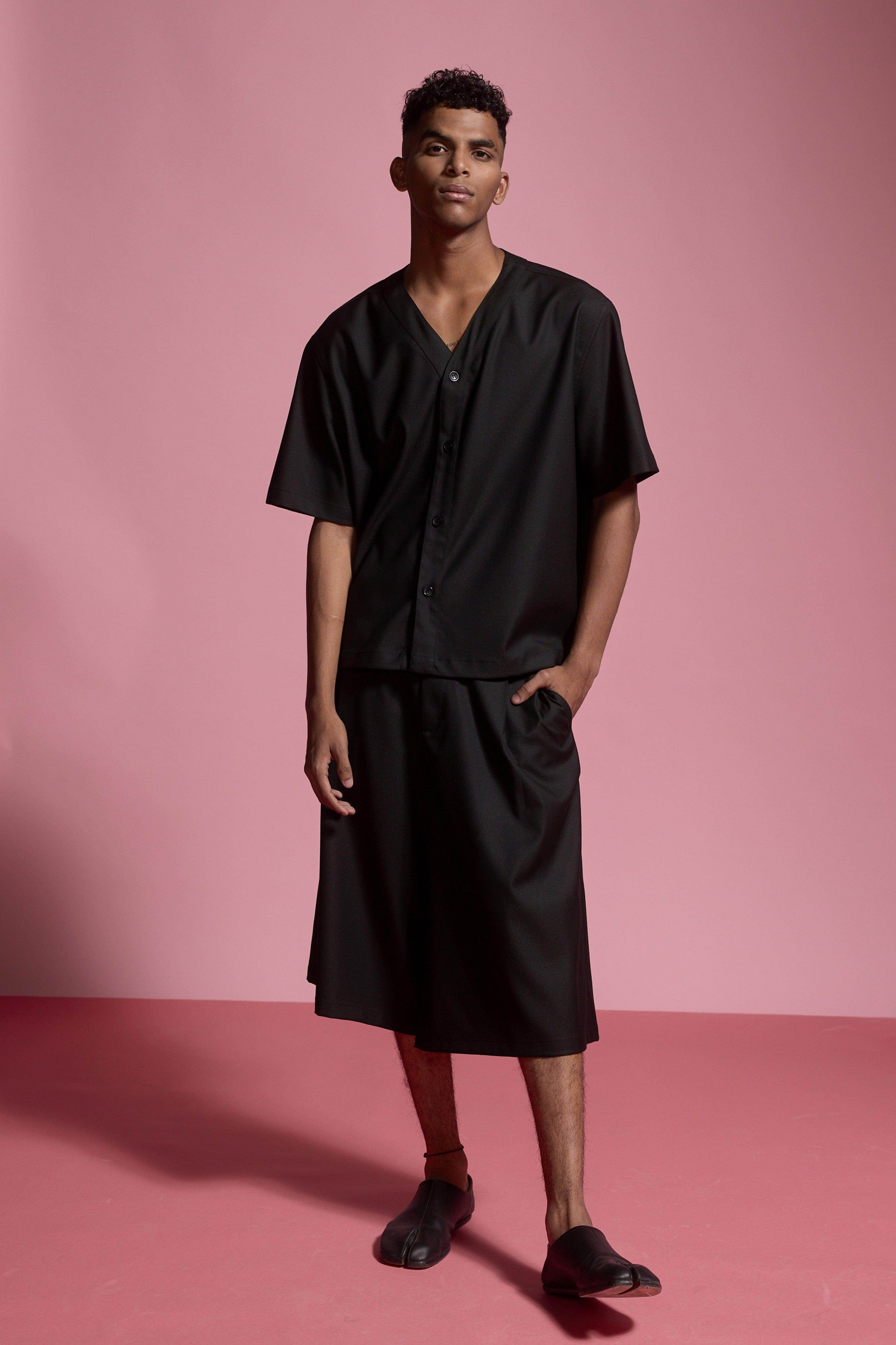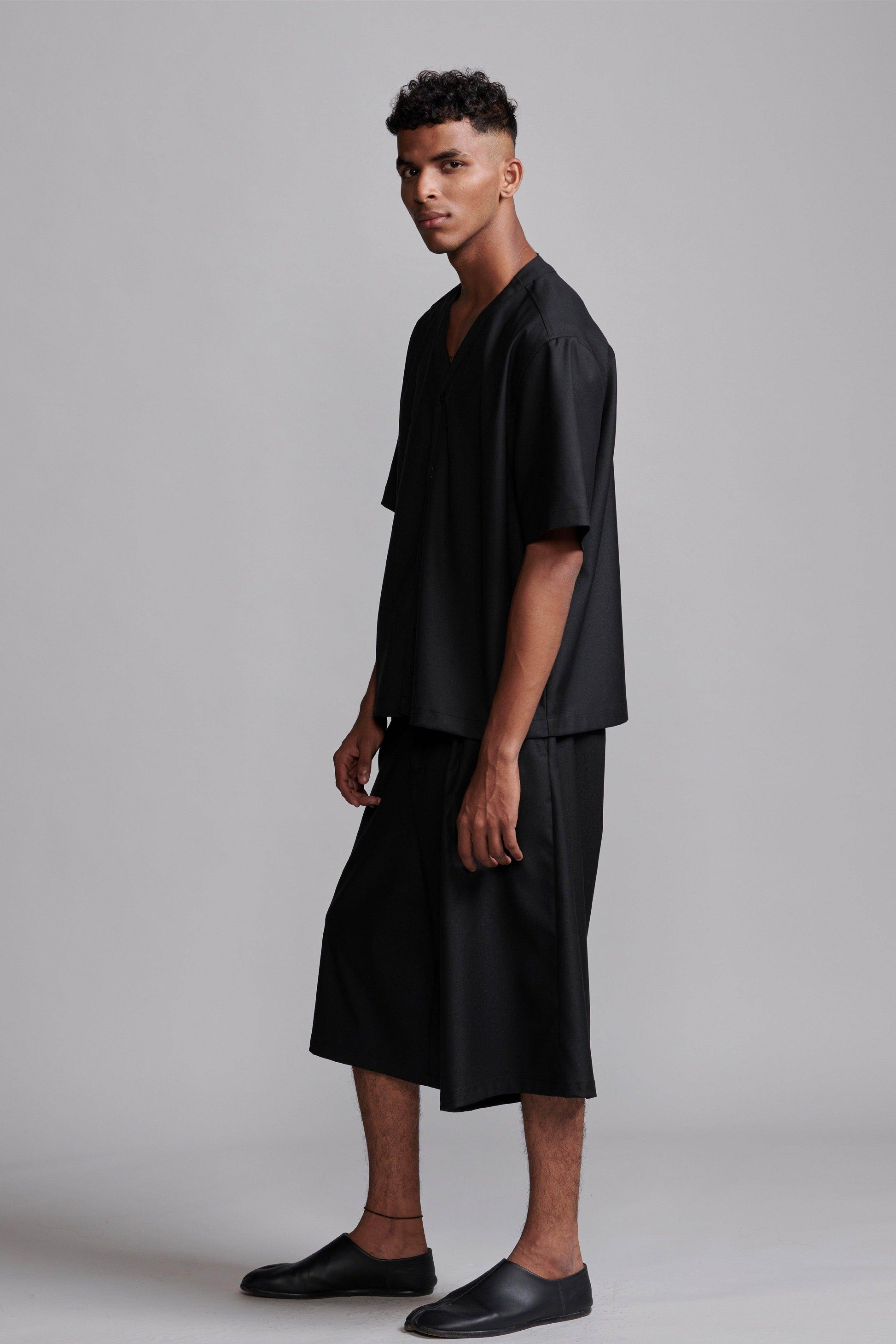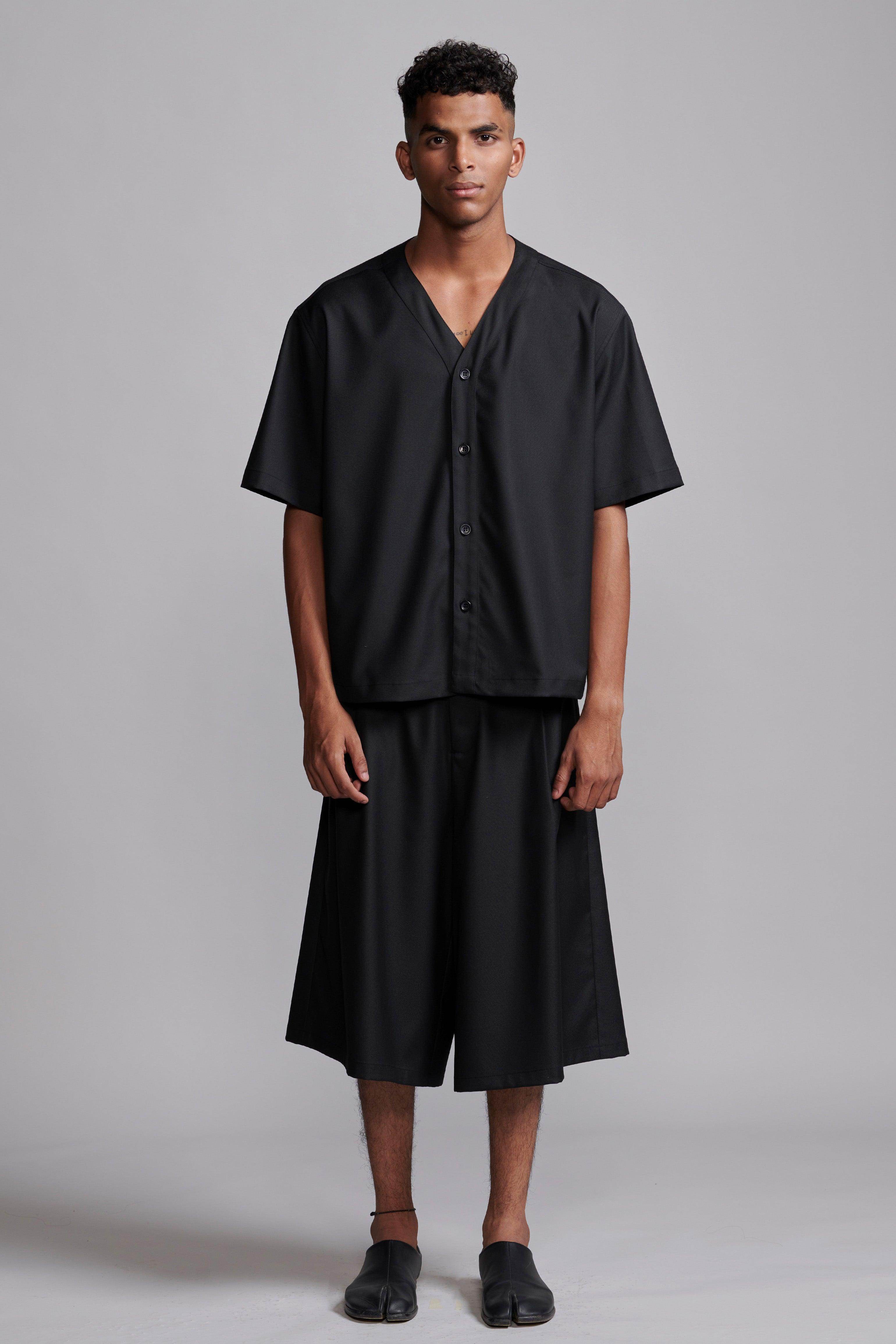 Y-neck half sleeve shirt in all-weather suiting material. Relaxed fit with a front button-down placket. Paired with Black wide-legged long shorts made from all-weather suiting material. Features flat pleats in the front, zip fly with hook-and-eye closure, and belt loops at the waist. Side and back pockets.