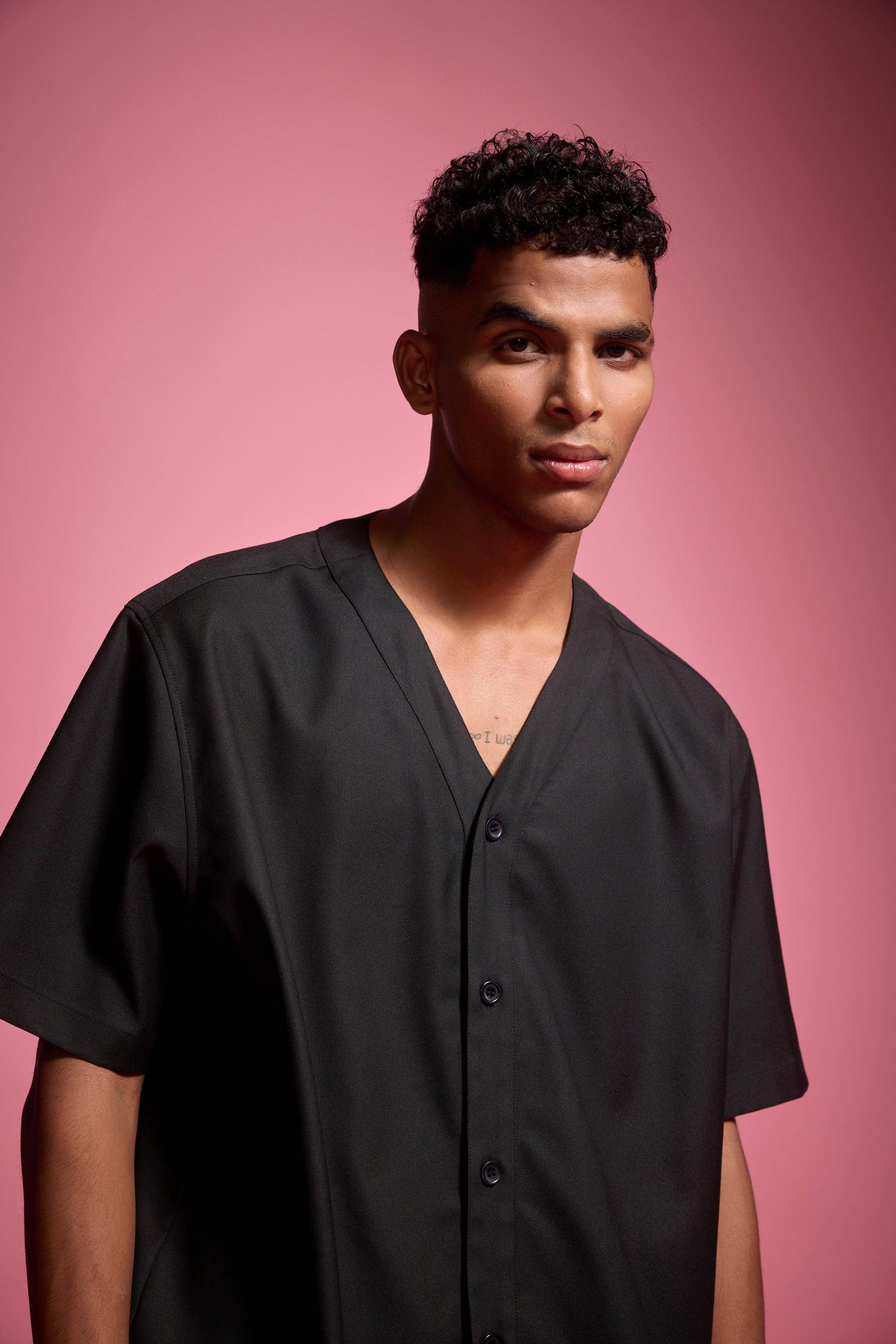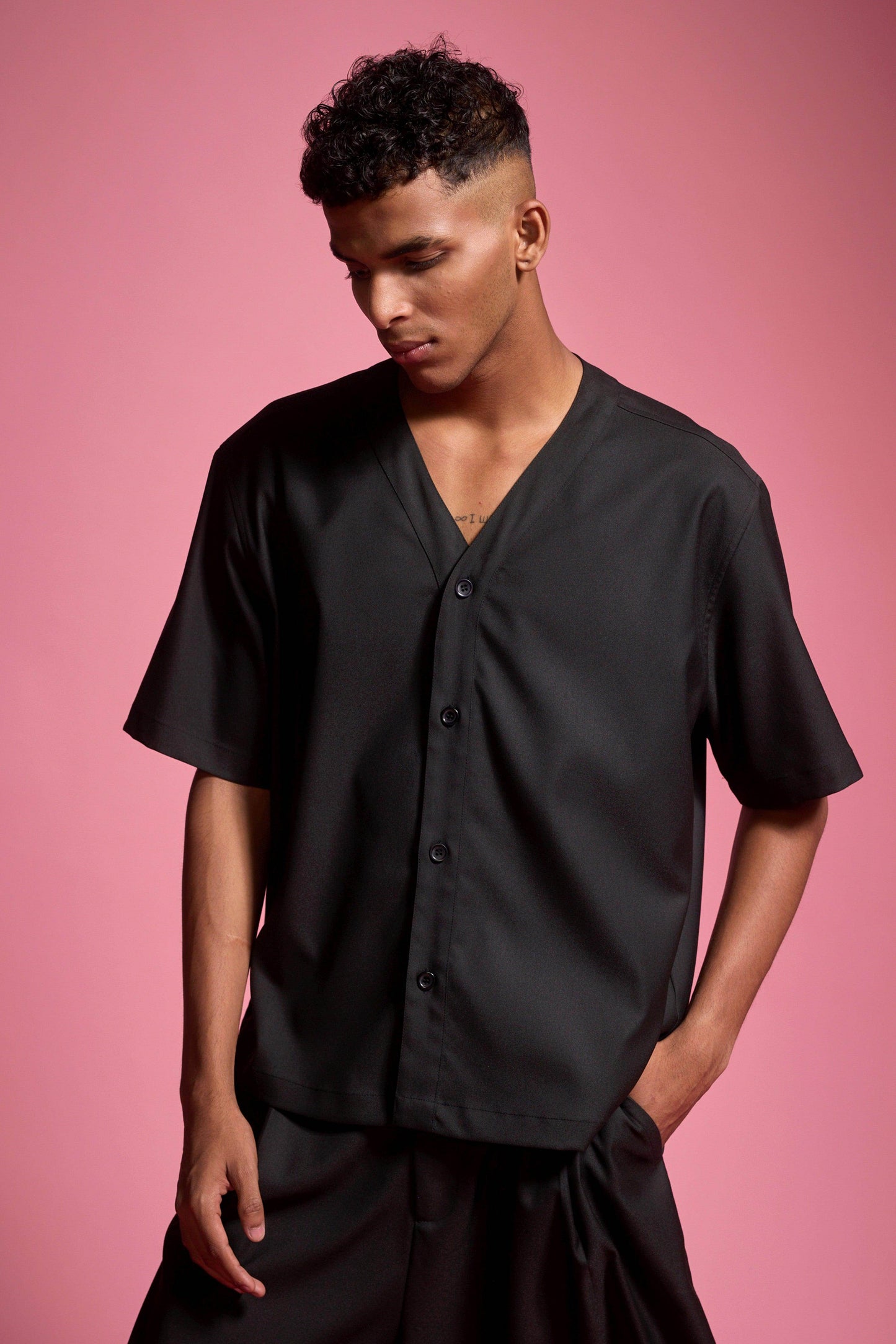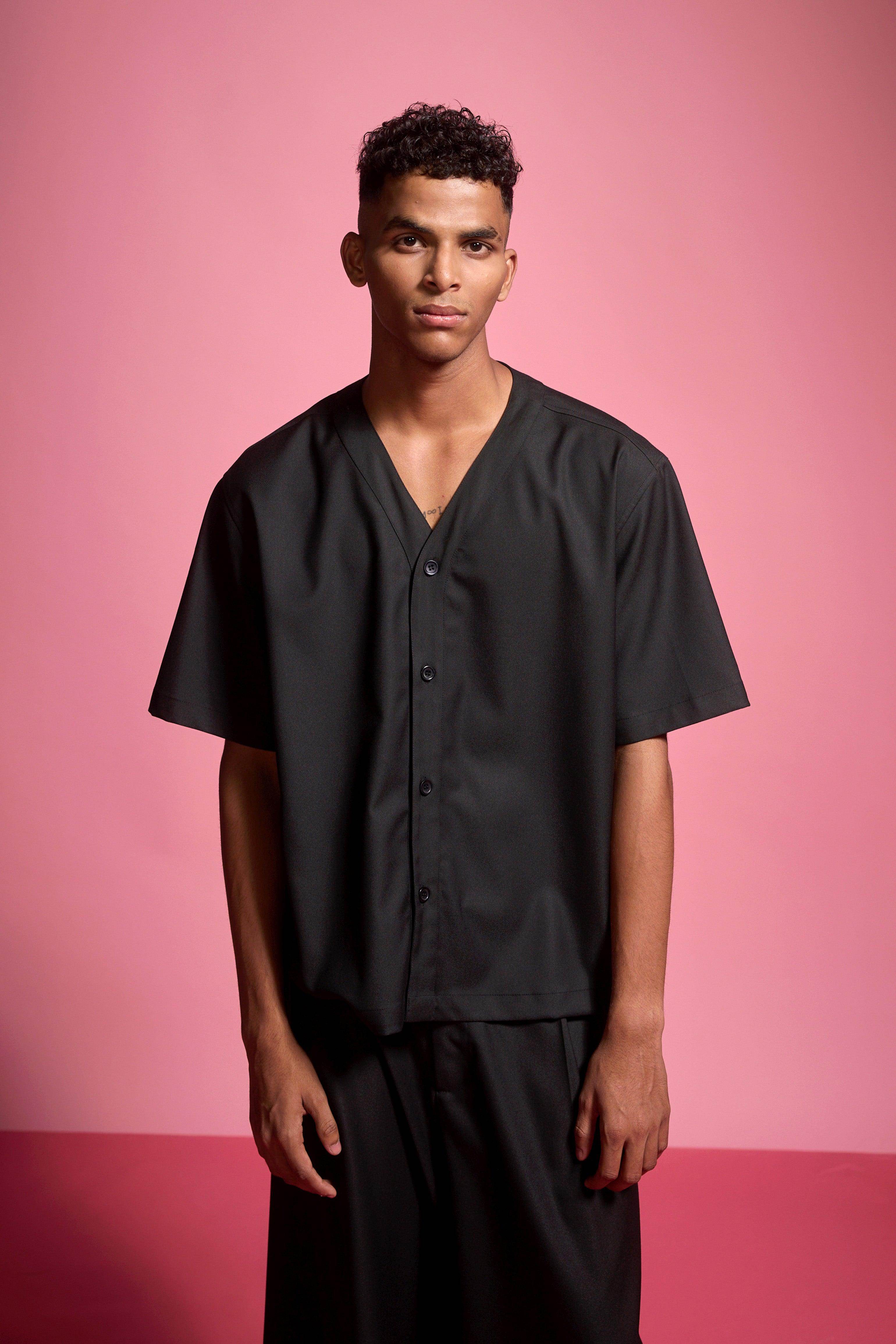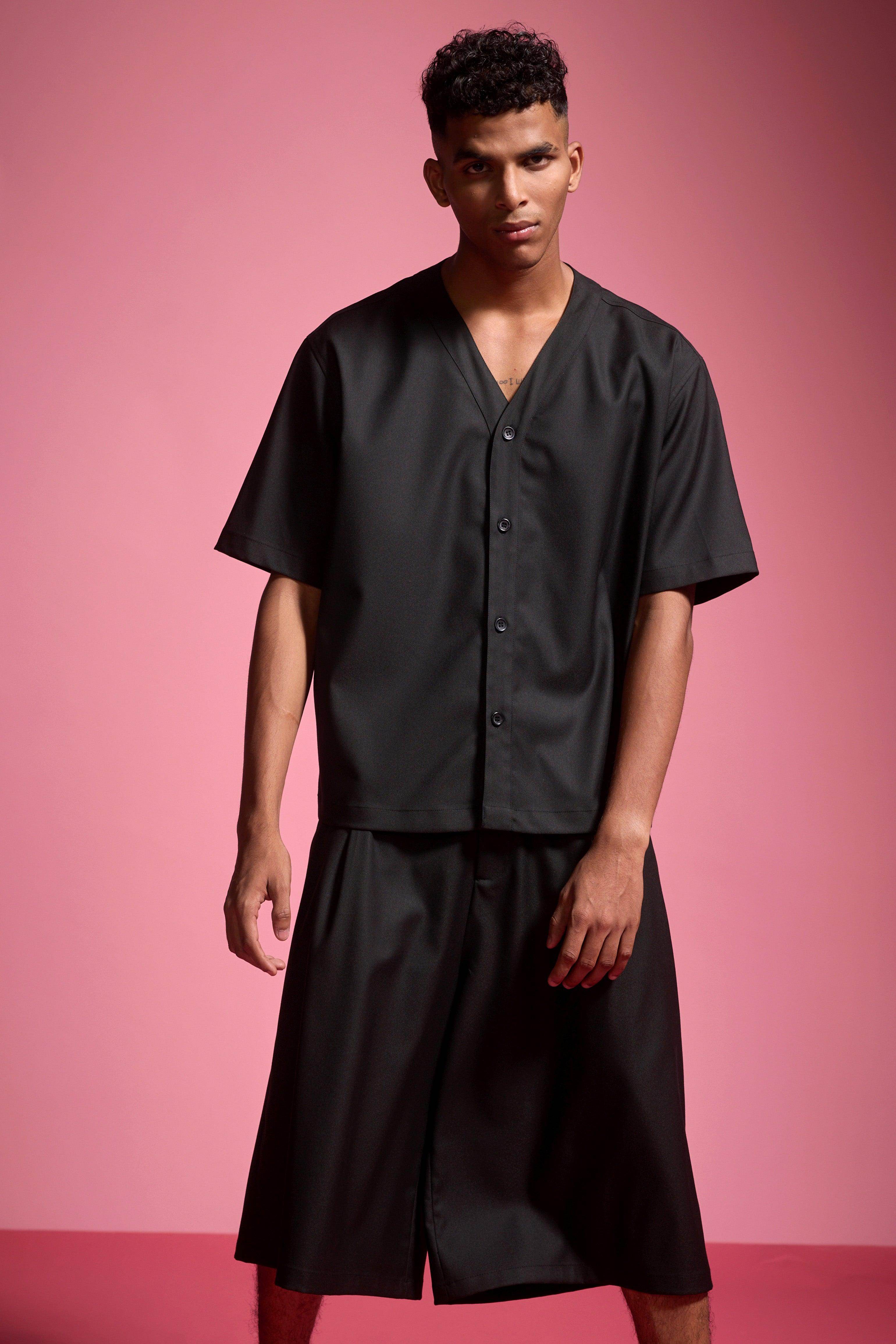 Y-neck half sleeve shirt in all-weather suiting material. Relaxed fit with a front button-down placket. Paired with Black wide-legged long shorts made from all-weather suiting material. Features flat pleats in the front, zip fly with hook-and-eye closure, and belt loops at the waist. Side and back pockets.
