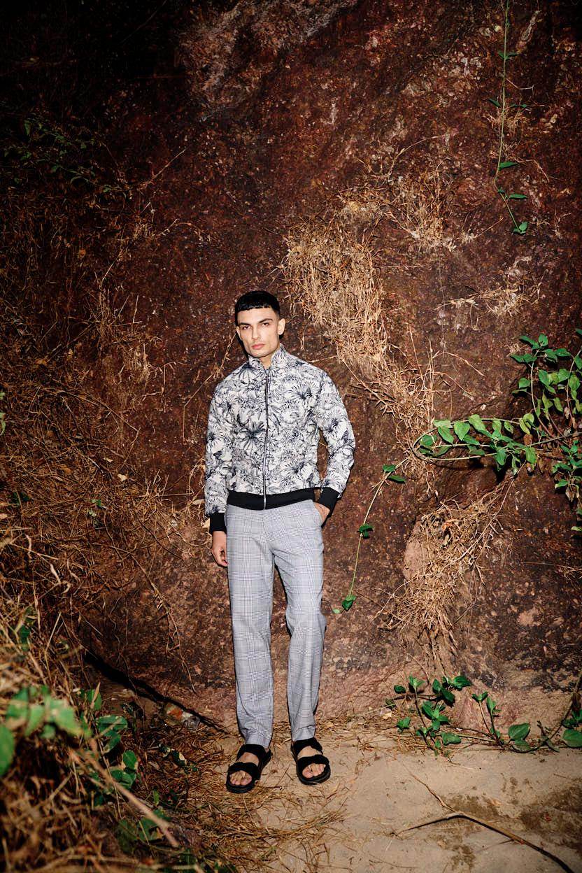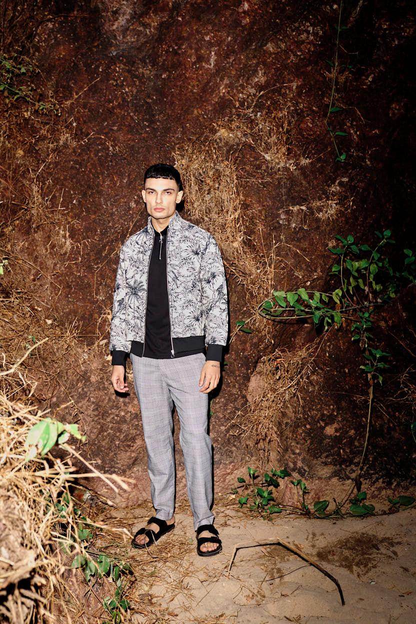 Bomber jacket in an ivory and black jungle themed jacquard. Zip closure and pockets in the front, knitted rib on the sleeve cuff and bottom hem.
