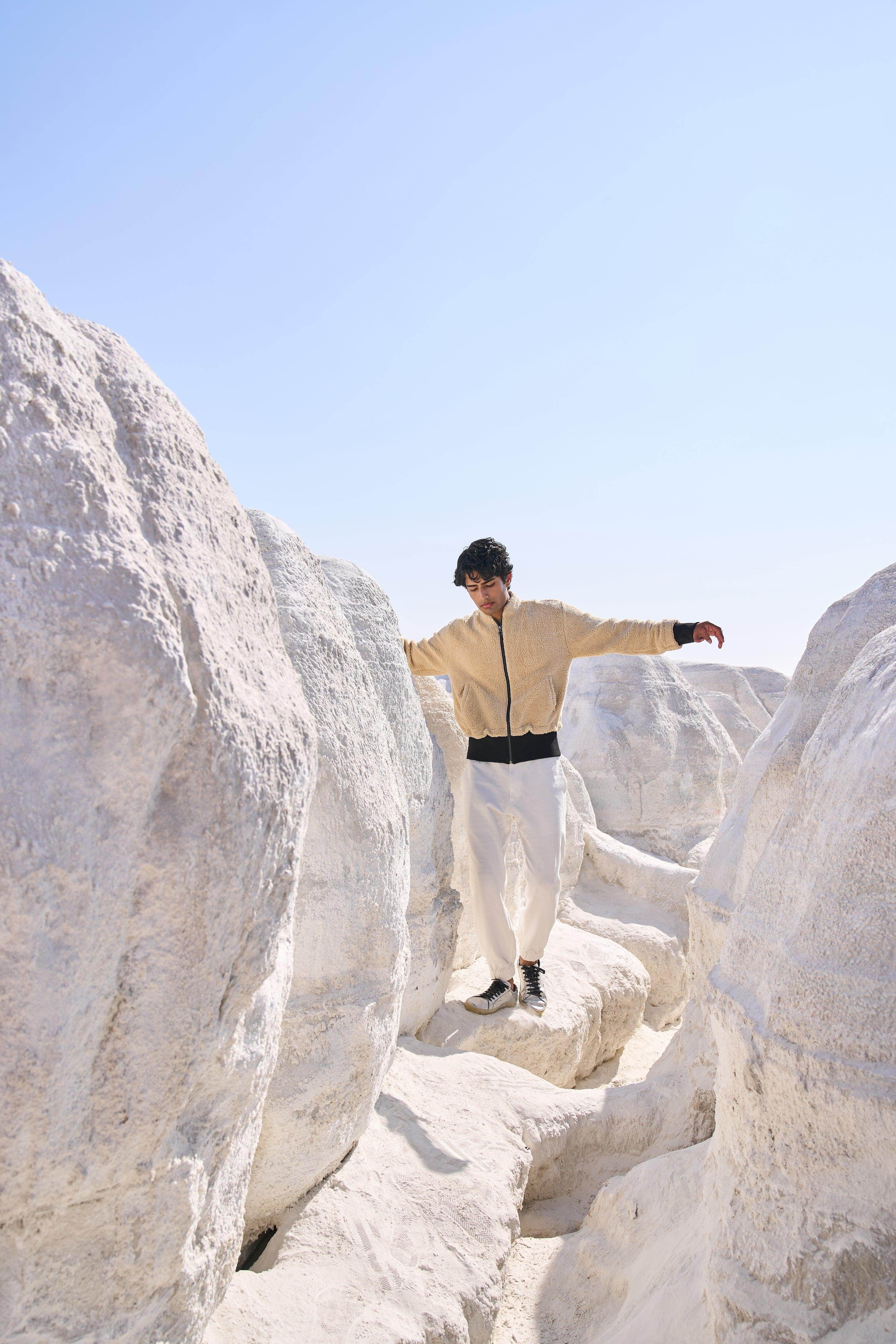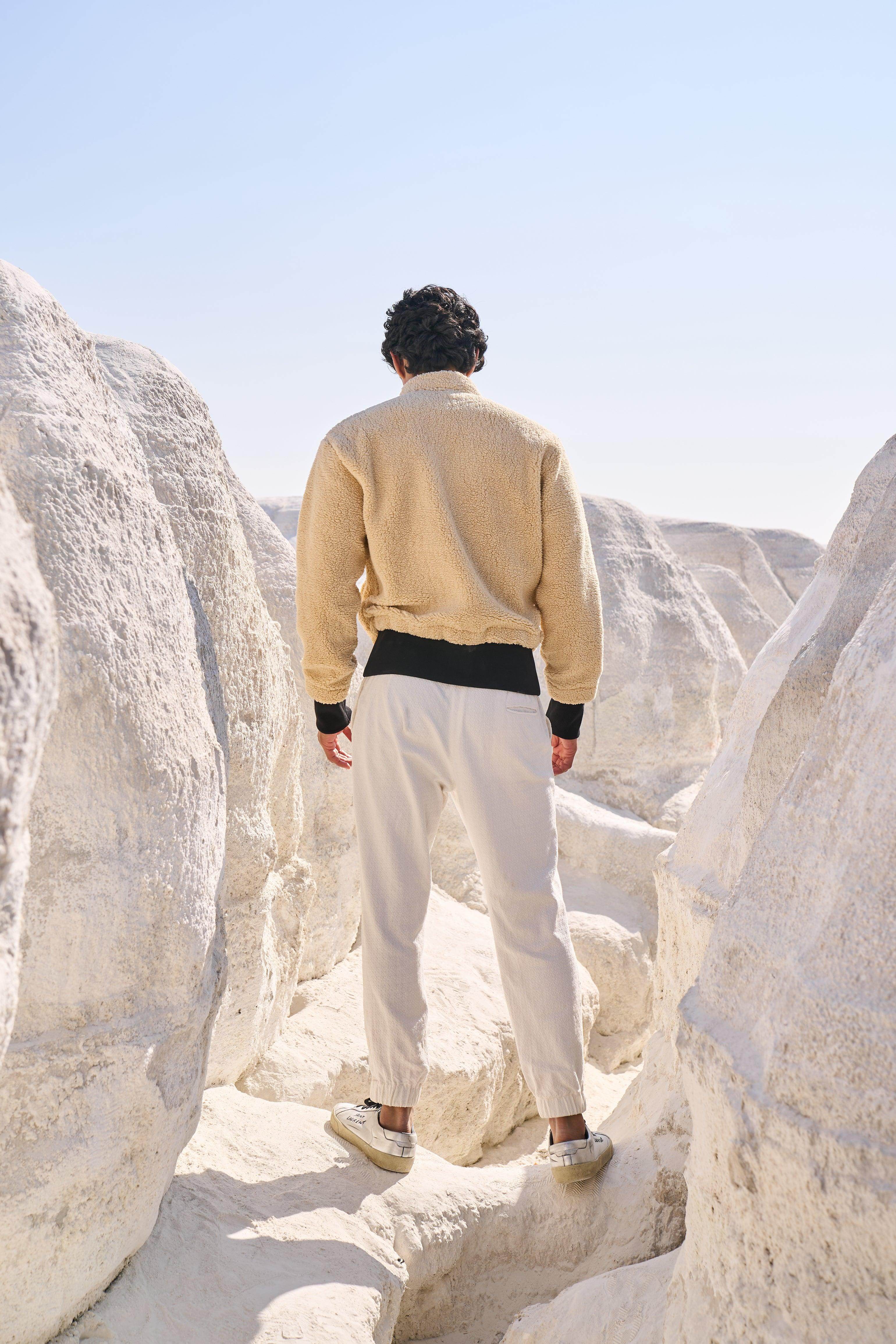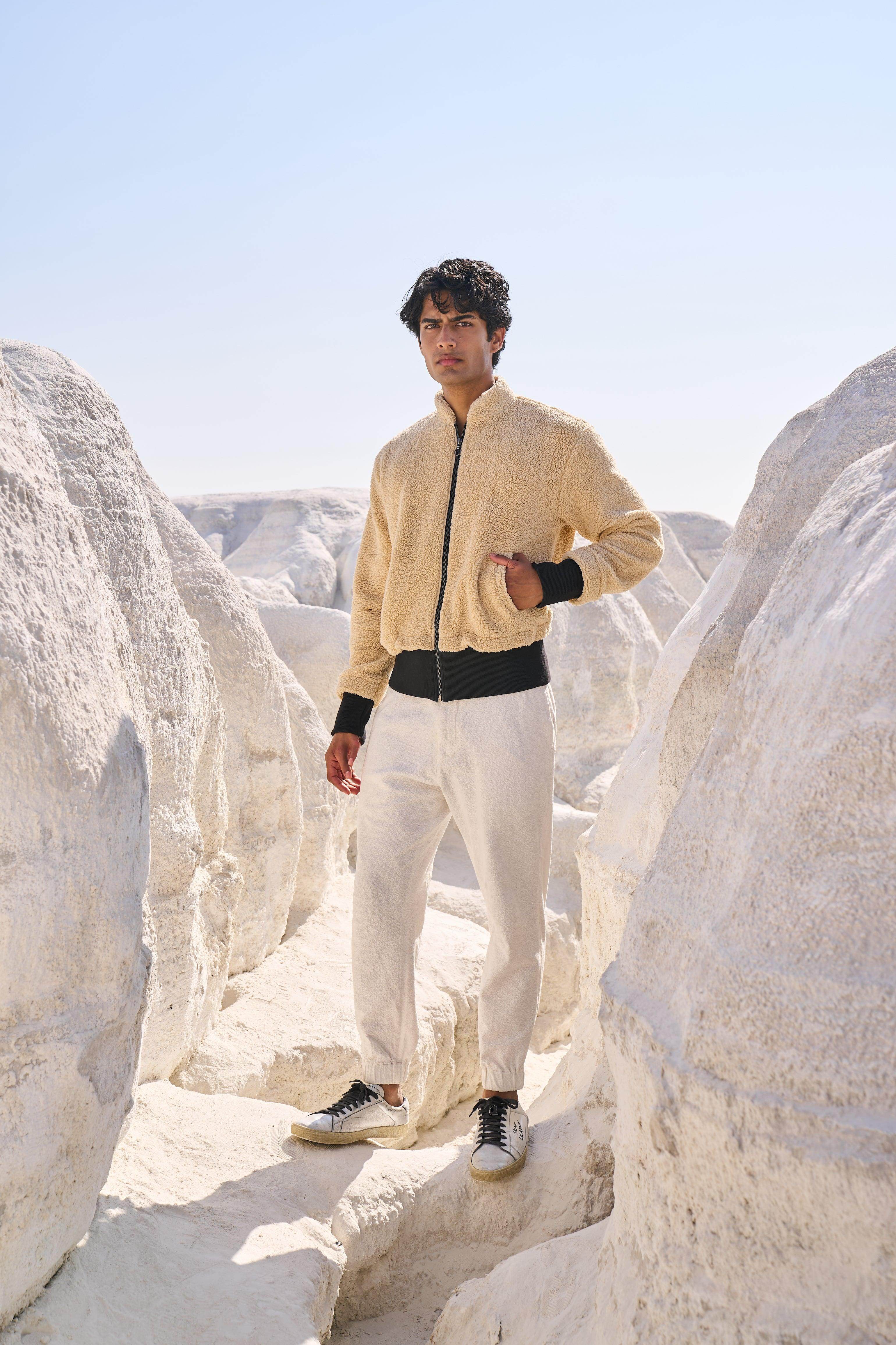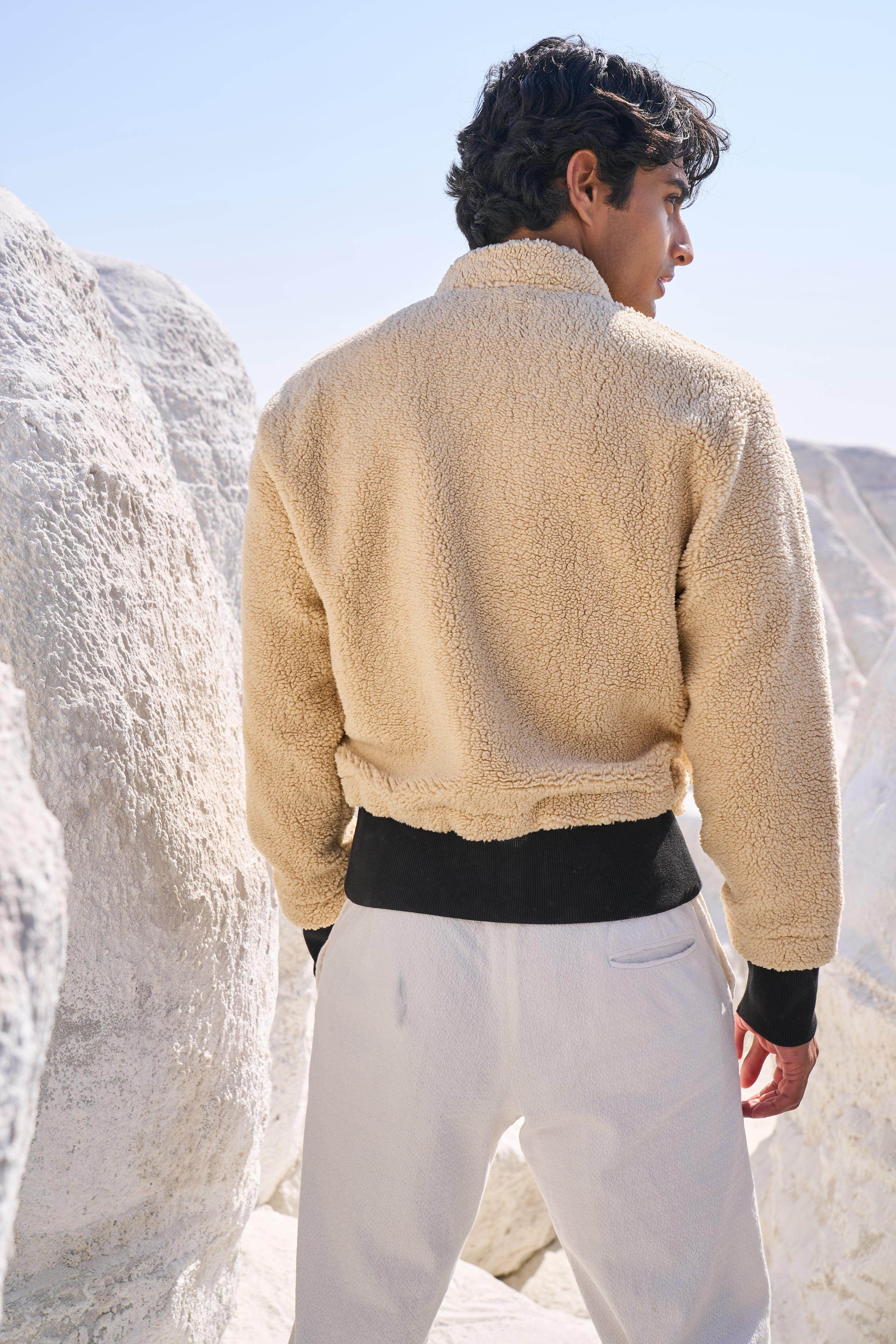 Sherpa fleece bomber men's jacket. Band collar. Contrast rib at hem and cuff. Zipper front open. Pockets at the front