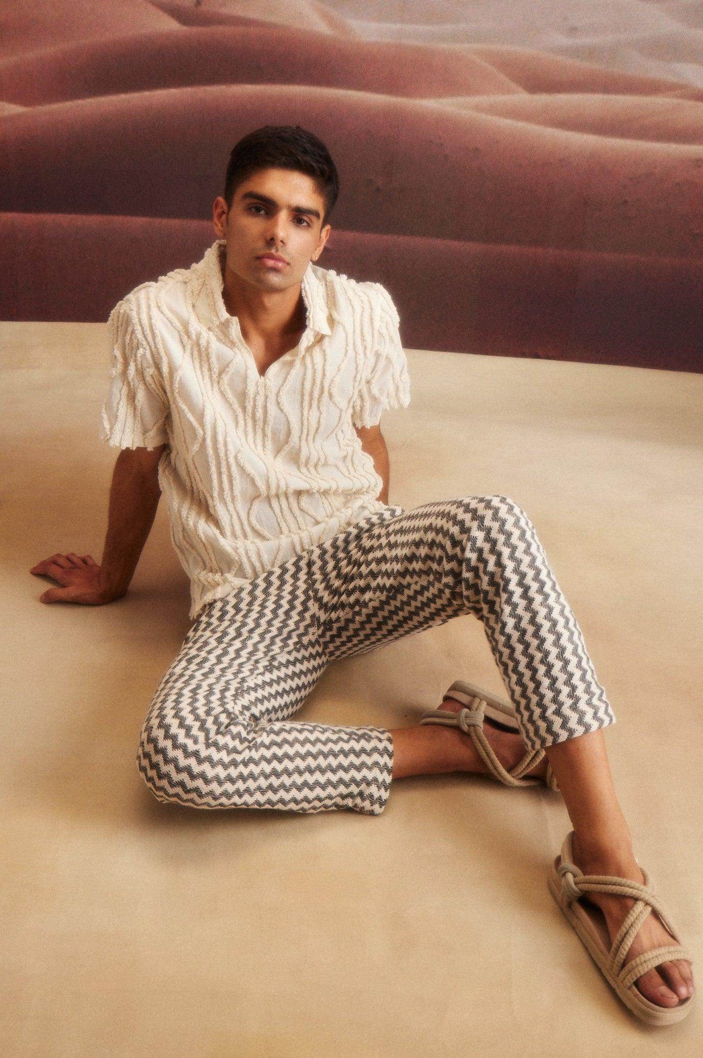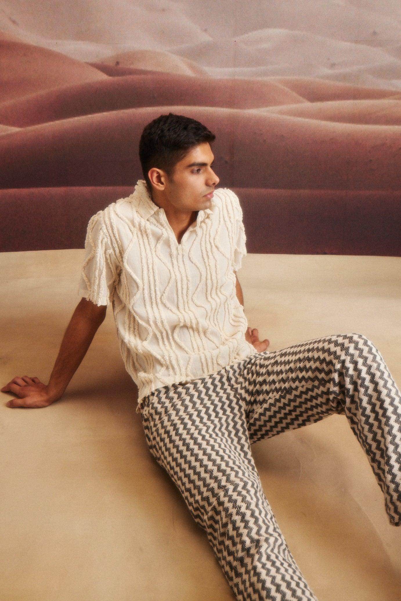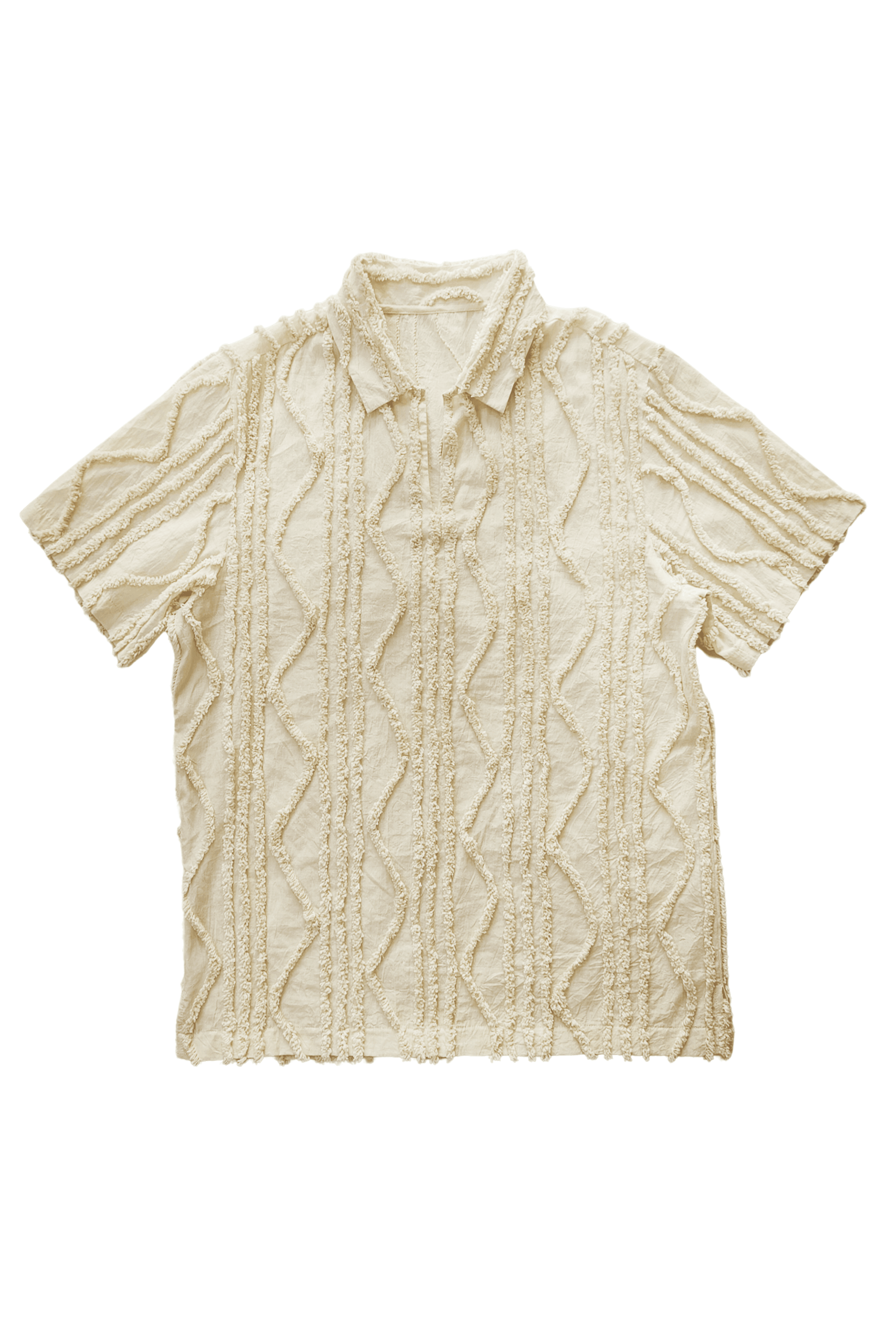 Popover polo in light cotton voile fabric. Allover geomentric- vertical pattern detail in towel like texture. Vent on the sides. Relaxed fit.