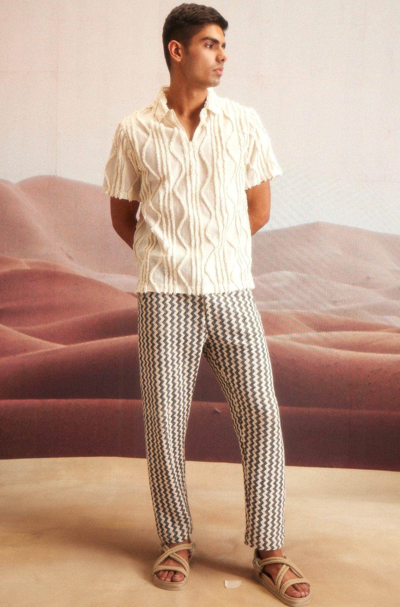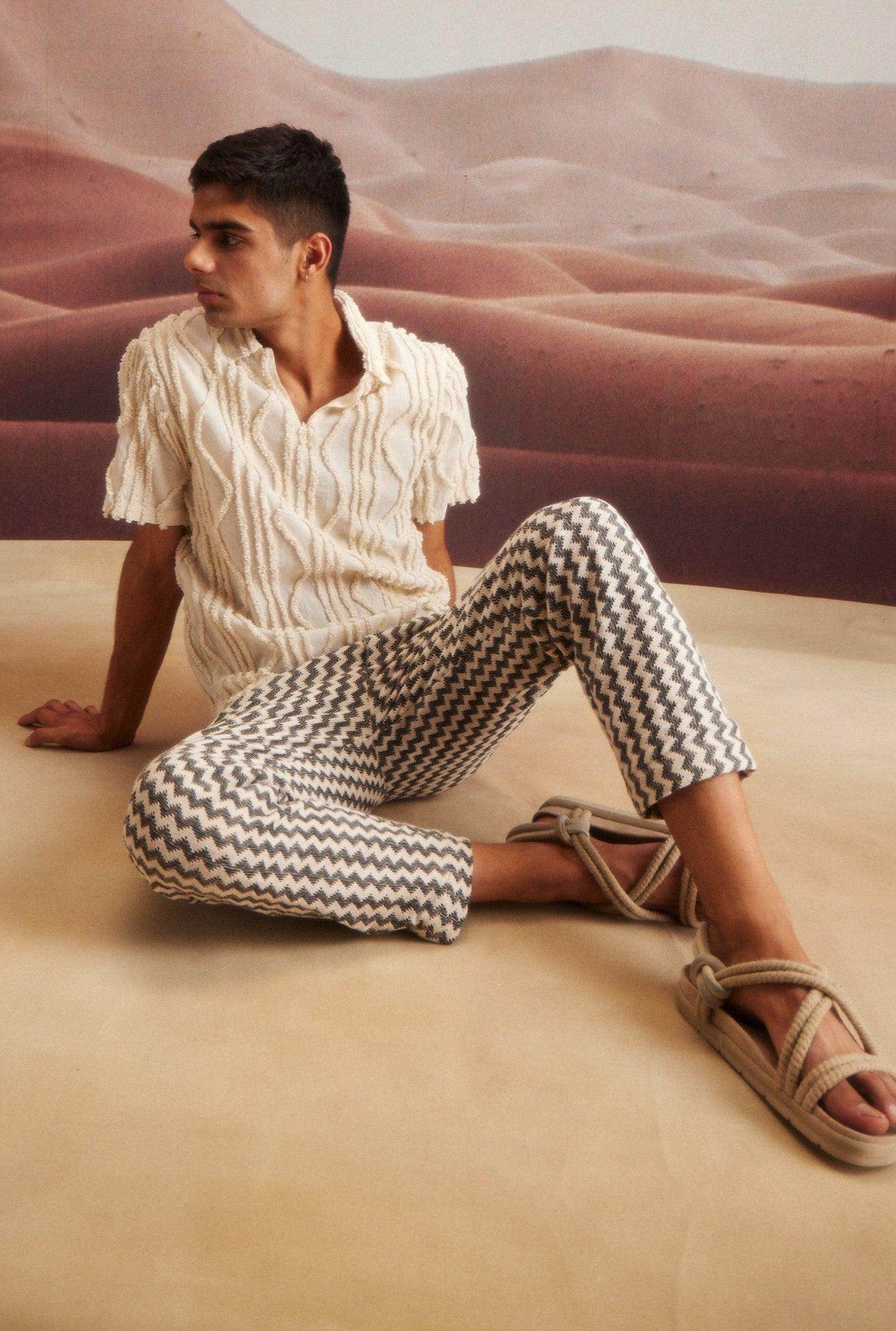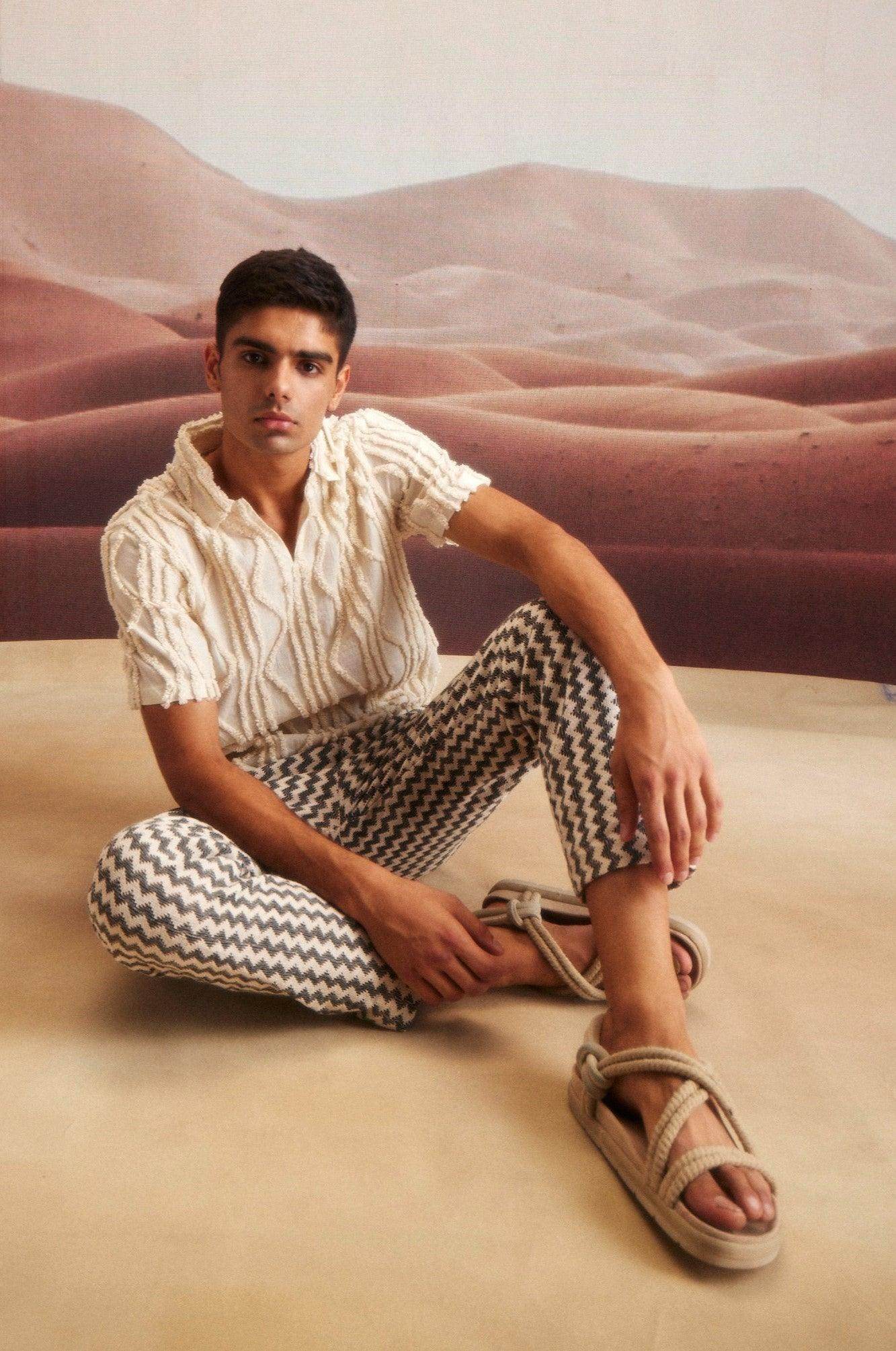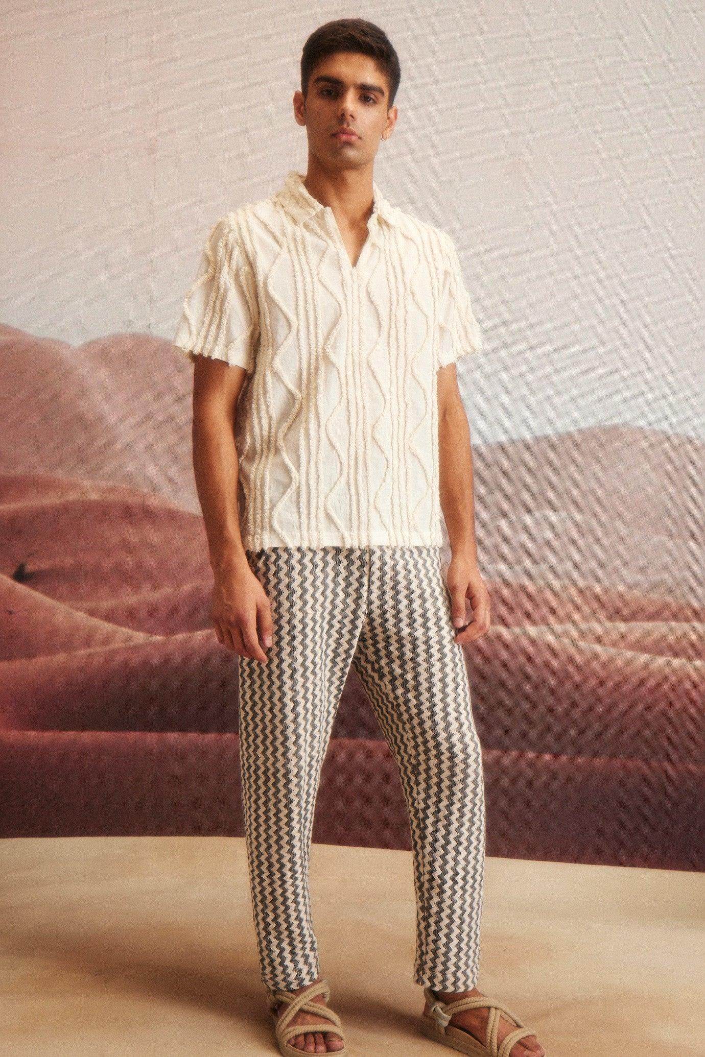 Popover polo in light cotton voile fabric. Allover geomentric- vertical pattern detail in towel like texture. Vent on the sides. Relaxed fit.
