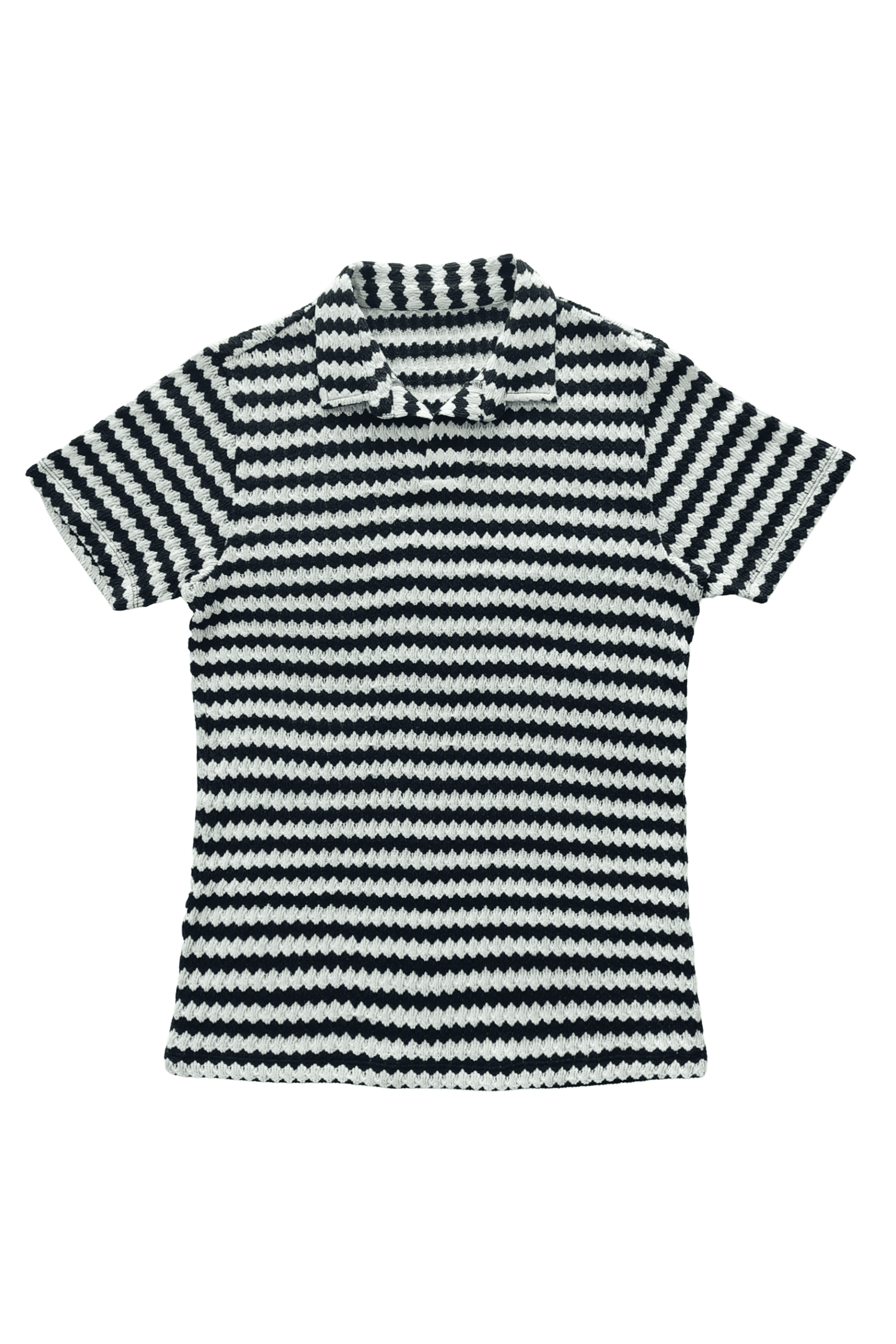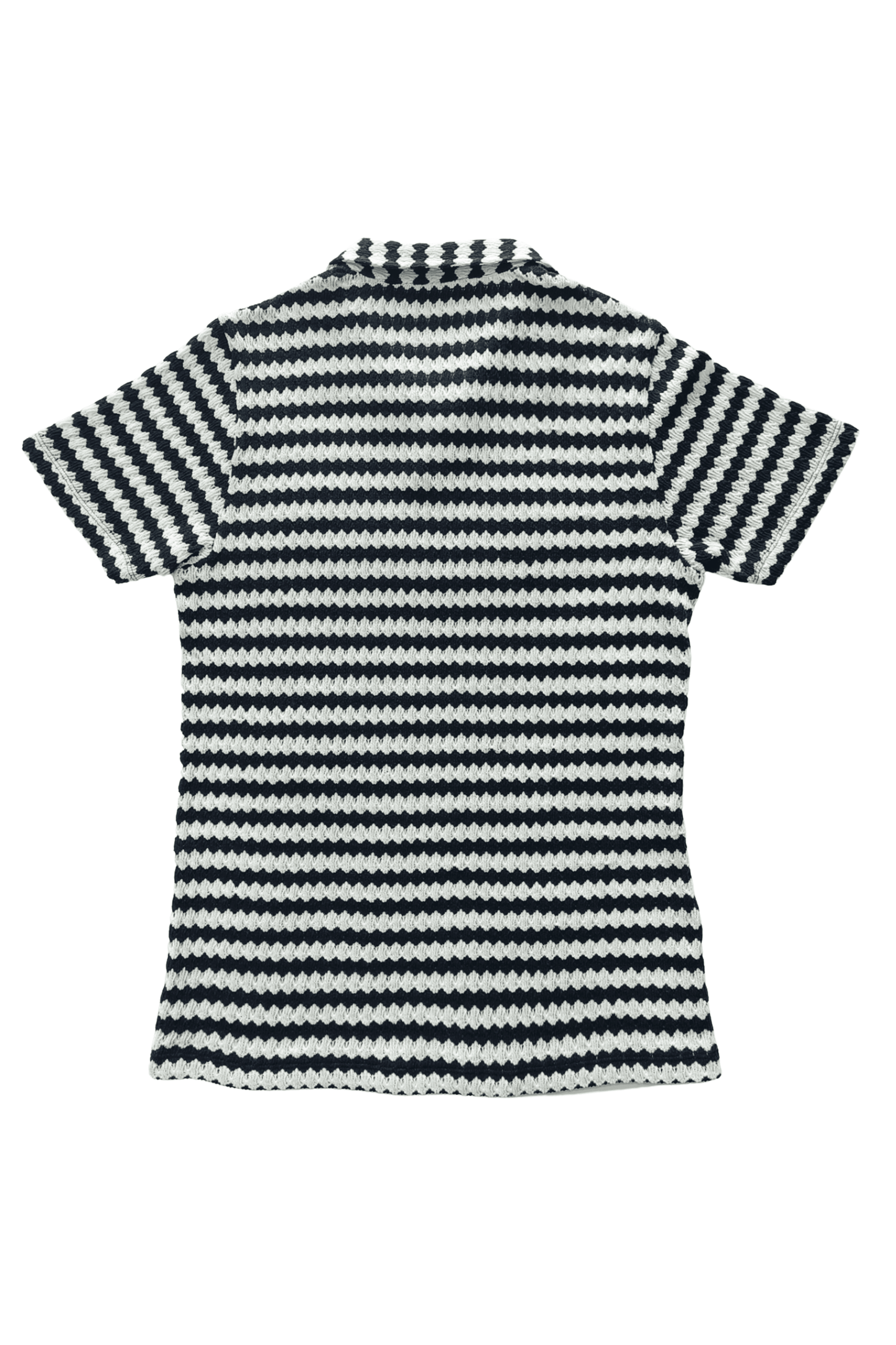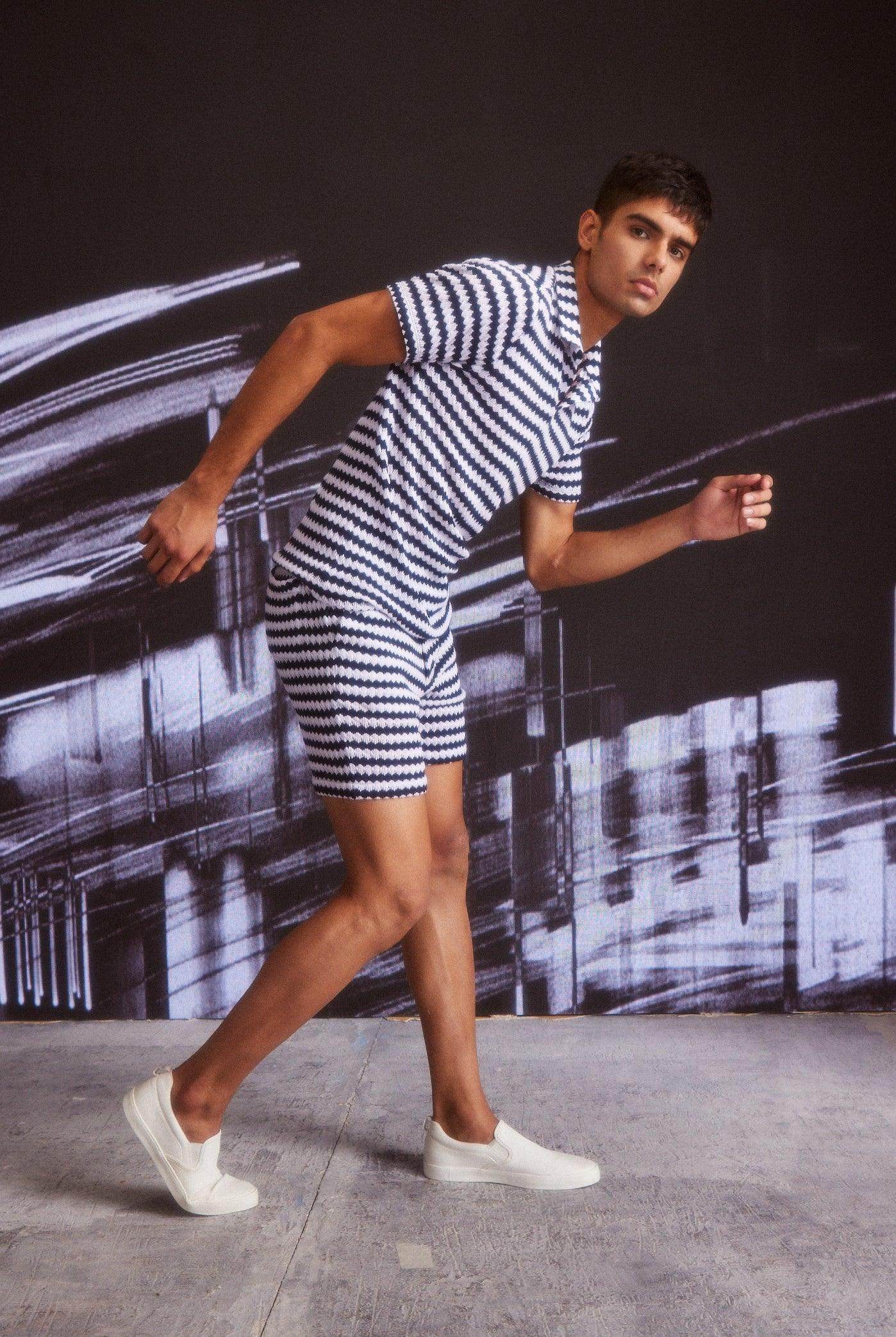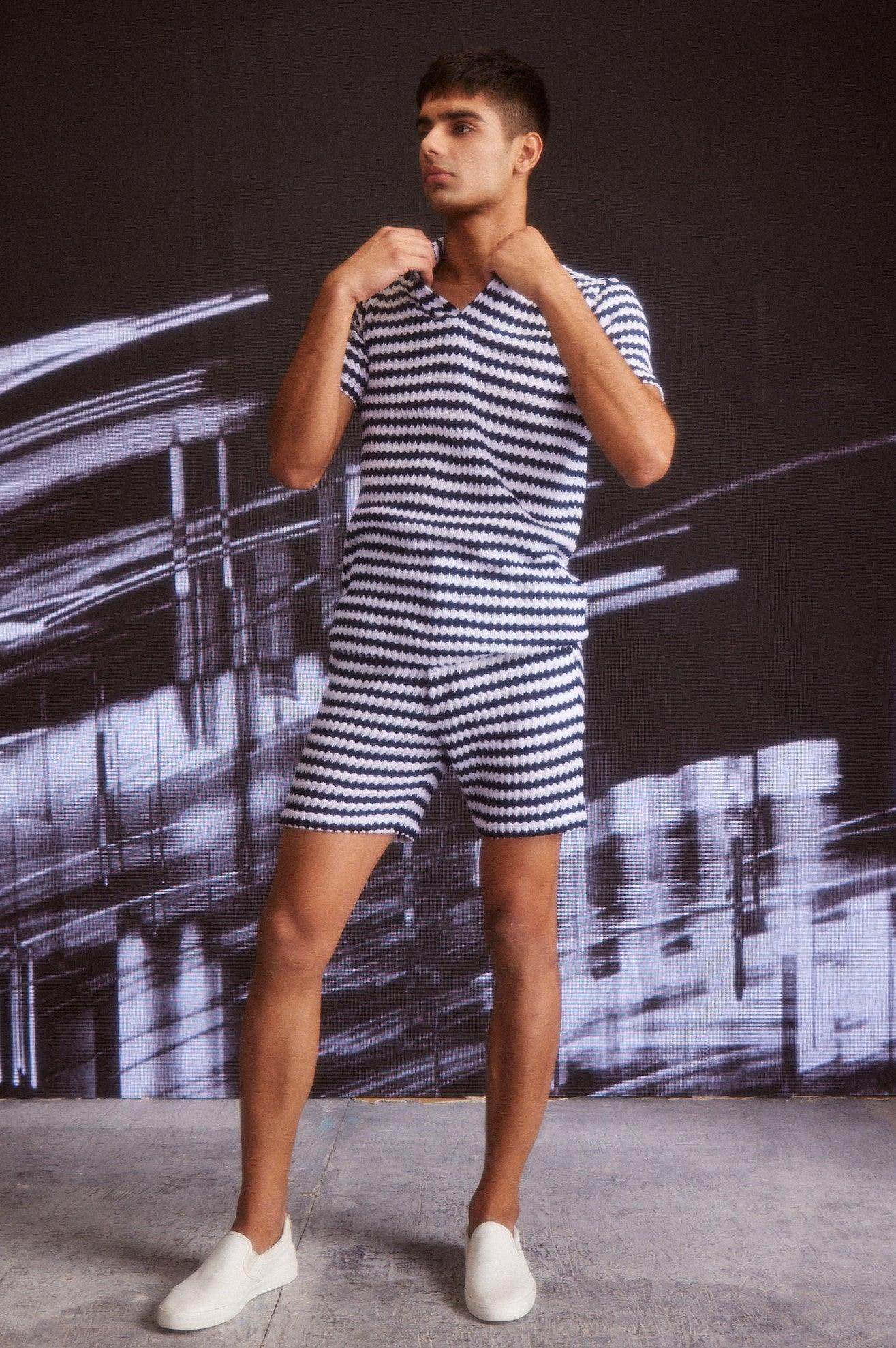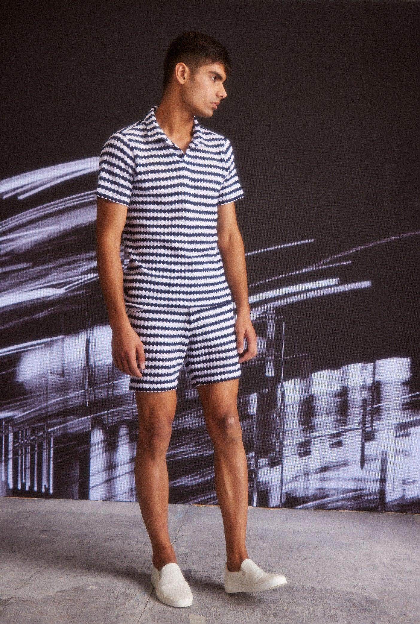 Organic cotton popover polo in textured knitted navy and white stripe fabric. Paired with matching shorts. Pockets on the side and back. Semi-elasticated at the waist. Hook and eye closure at the front. Zip fly.