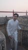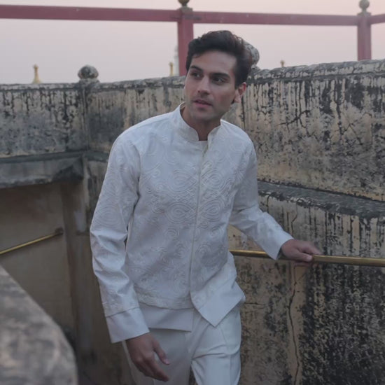Cord embroidered shirt in ivory all-weather suiting fabric. Oriental inspired motifs placed on the front, sleeve and back. Rib inspired plain fabric detailing at the full sleeve cuff and bottom hem. Band collar, with a concealed button front placket. Relaxed fit.