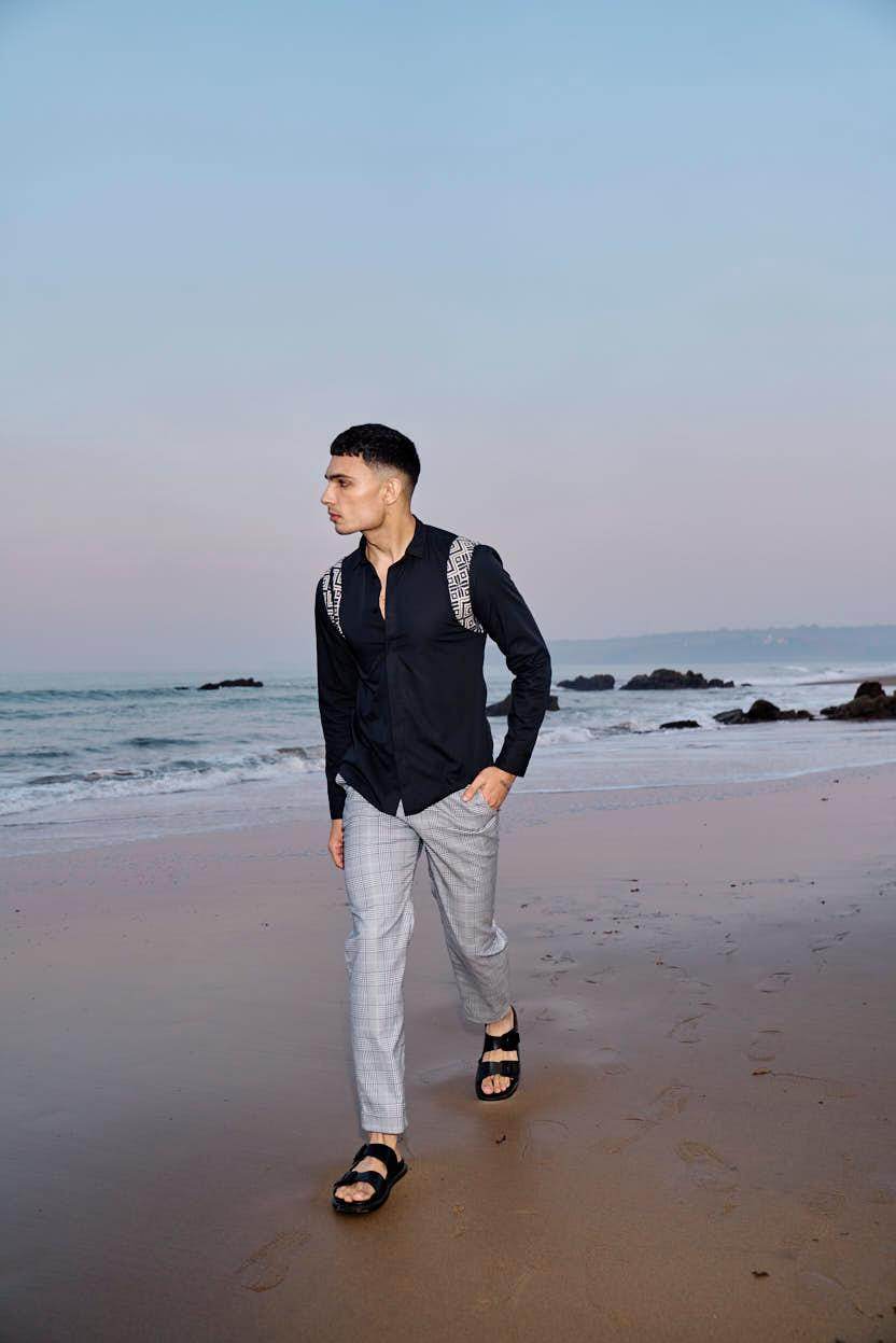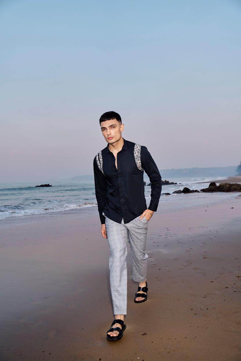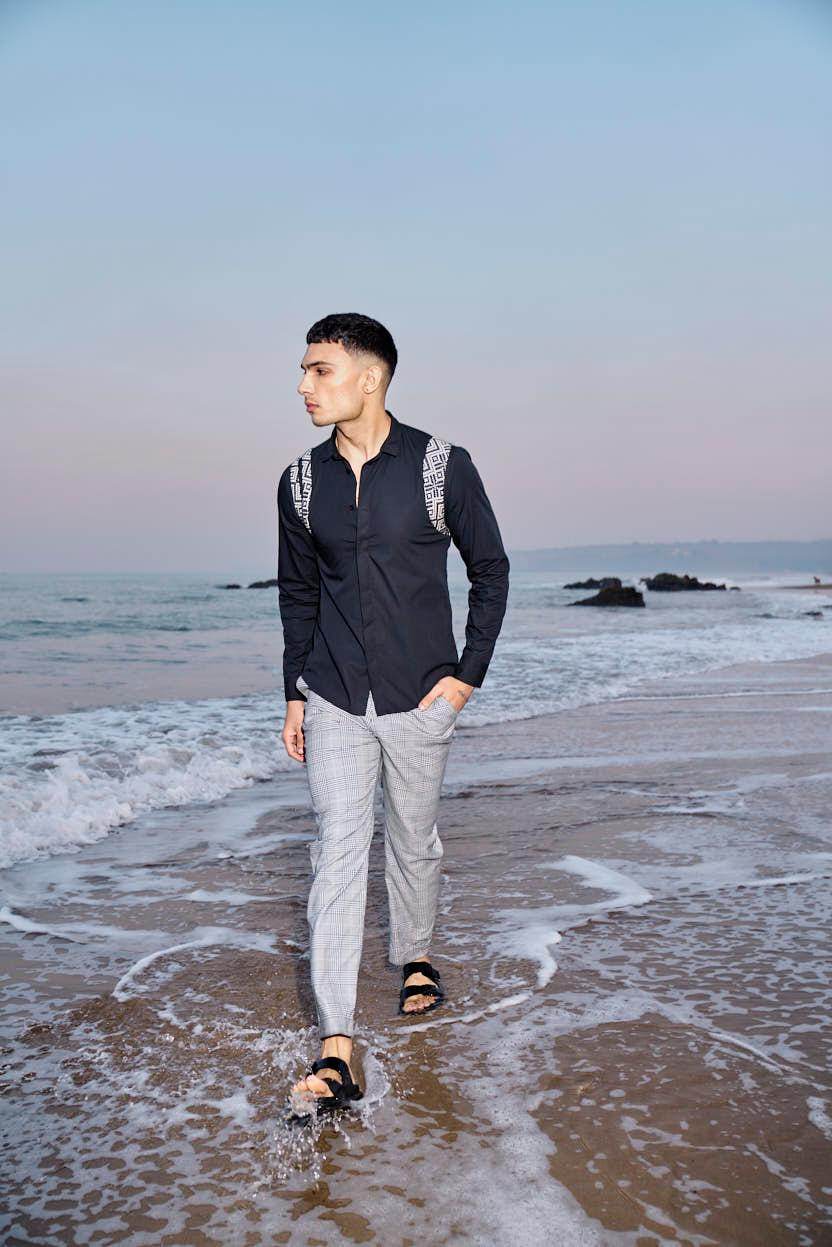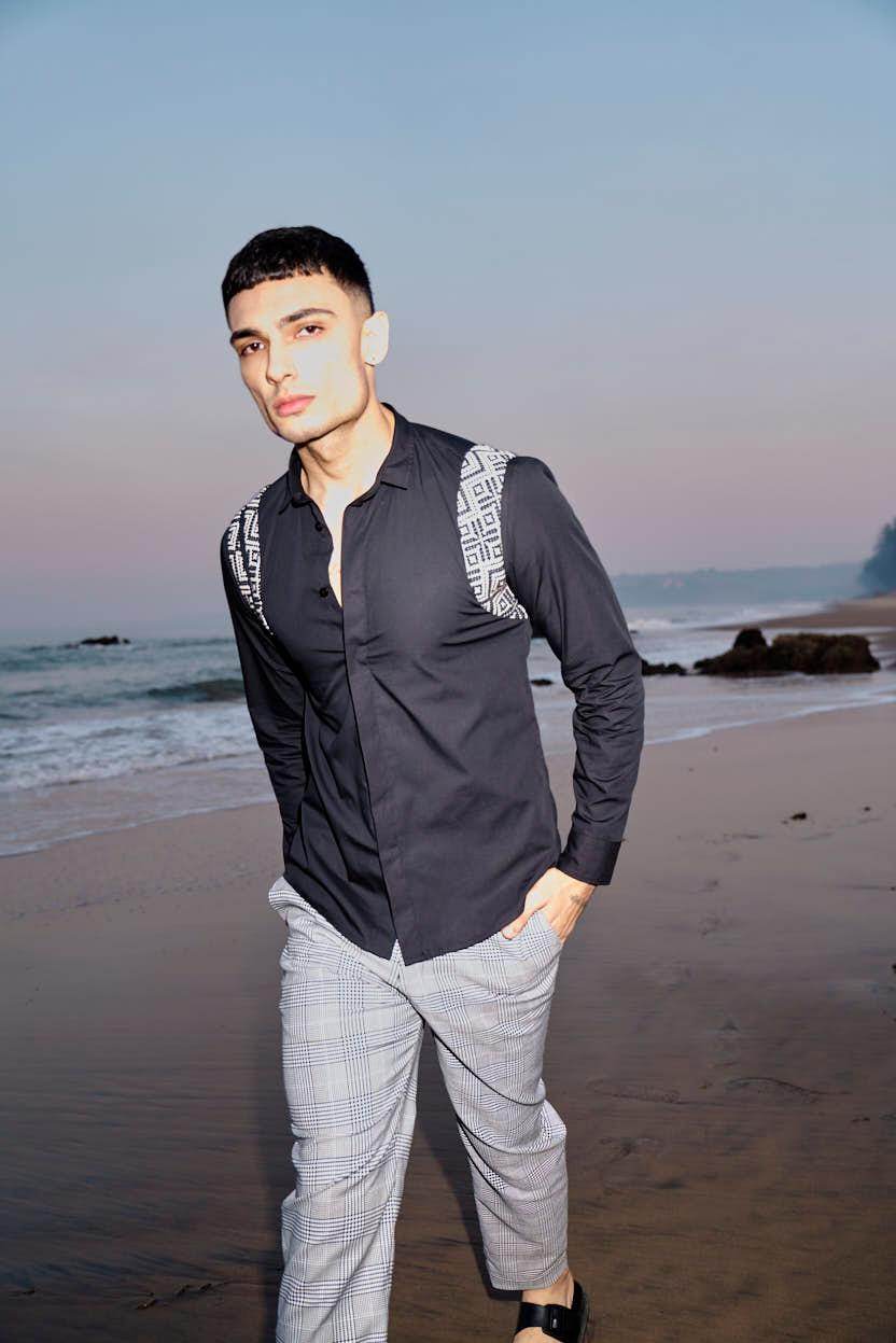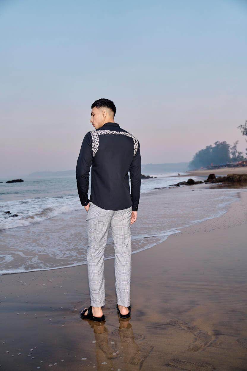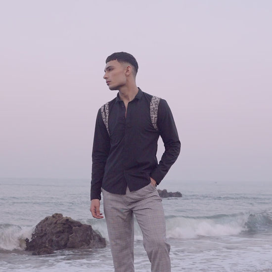 Black cotton poplin full sleeve shirt with contrast patterned jacquard harness detail on the shoulders and upper back. Concealed button down placket in the front.