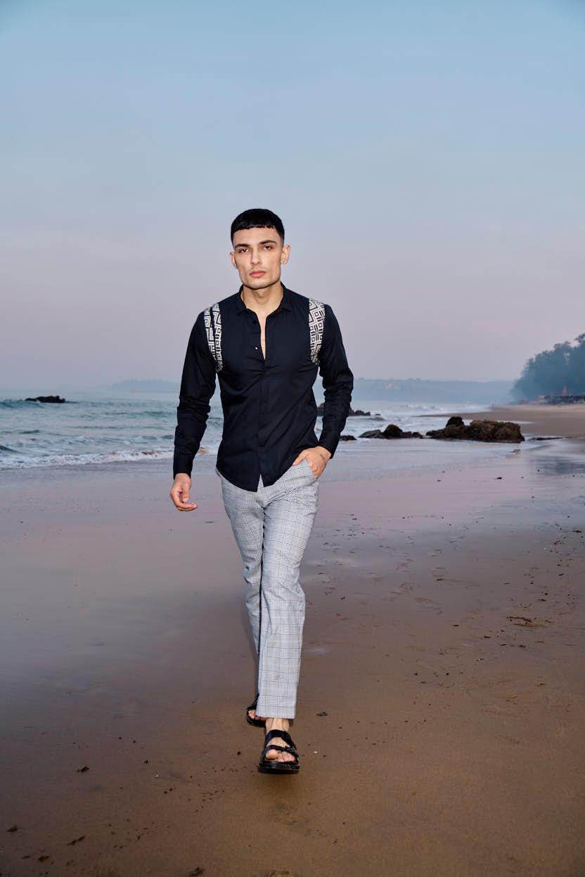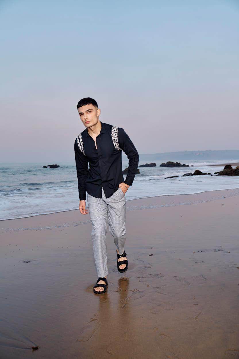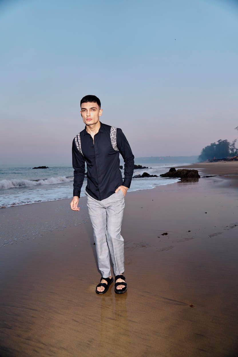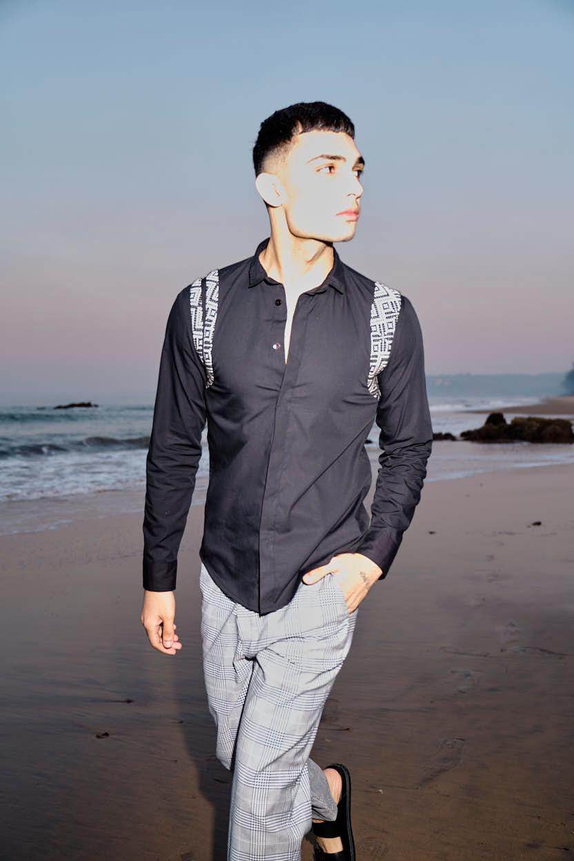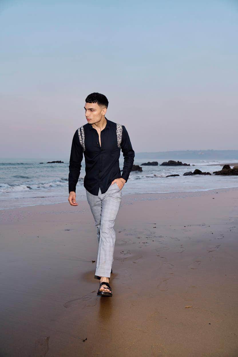 Black cotton poplin full sleeve shirt with contrast patterned jacquard harness detail on the shoulders and upper back. Concealed button down placket in the front.