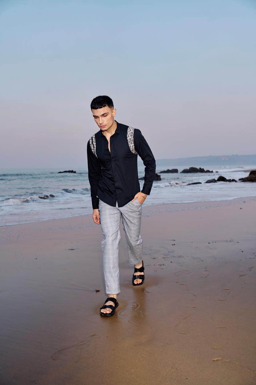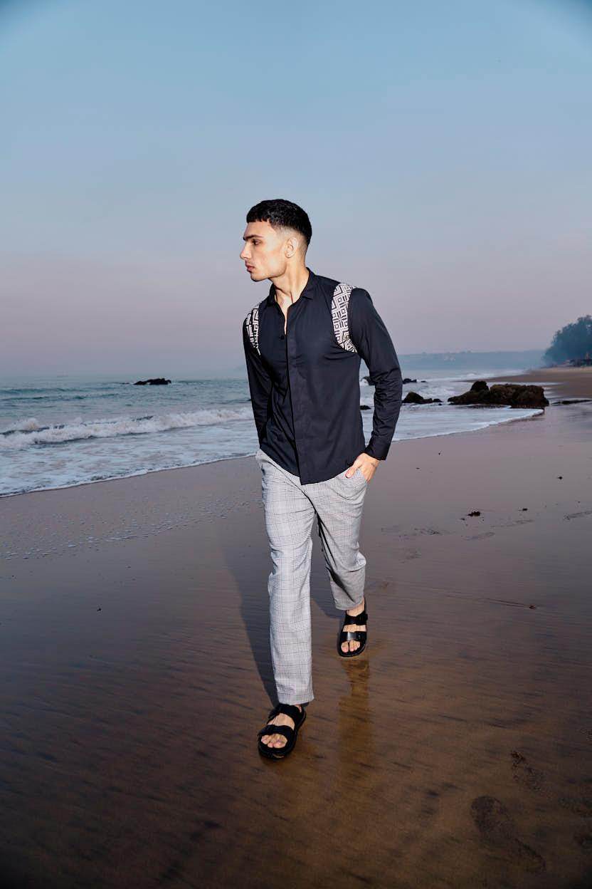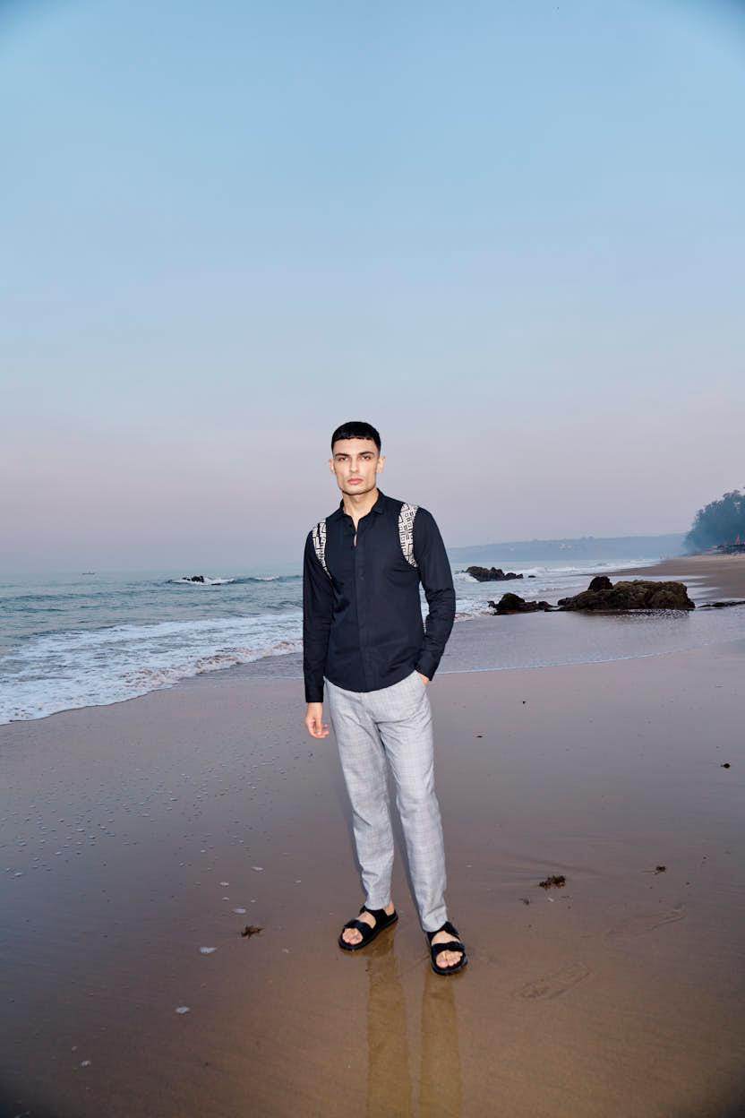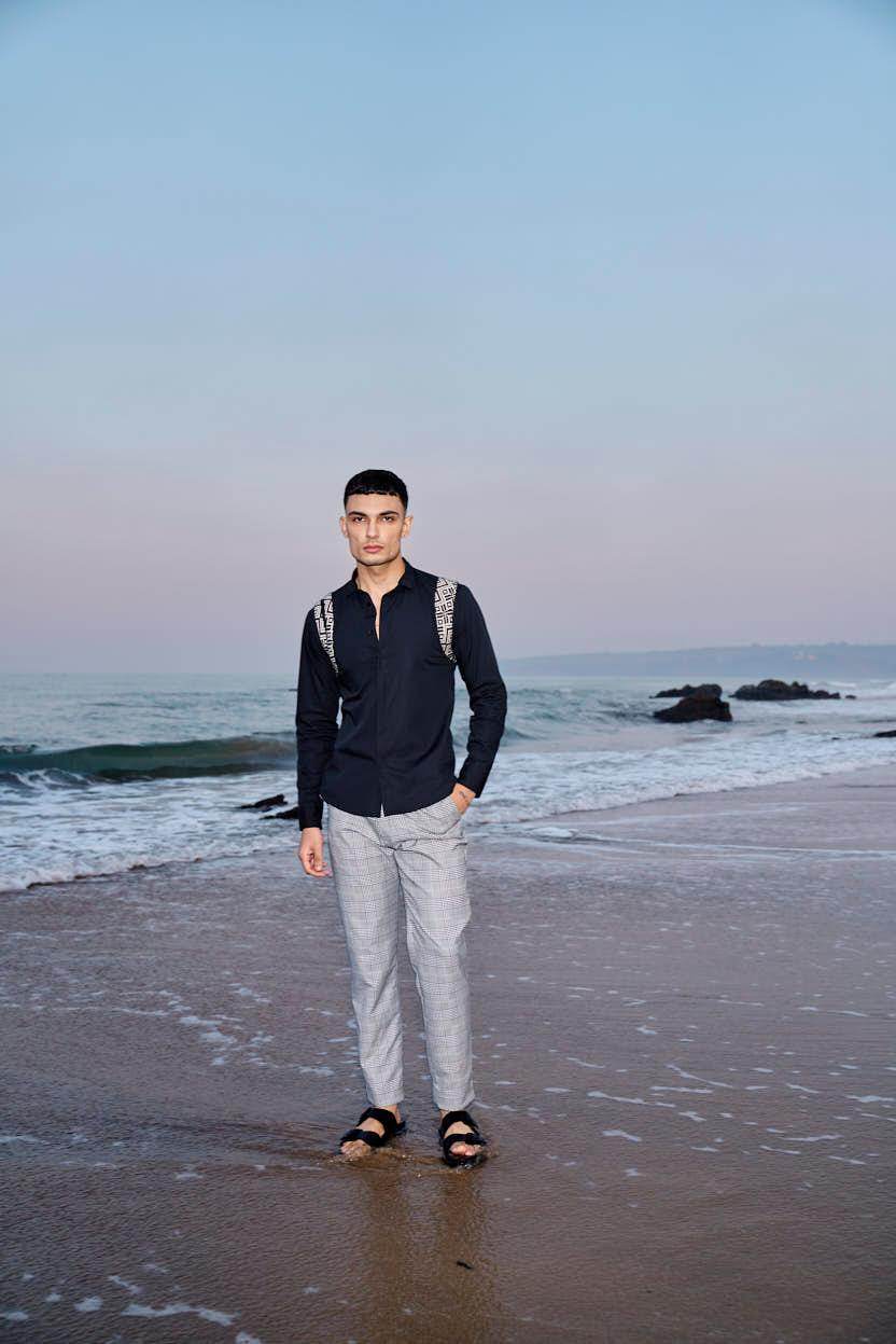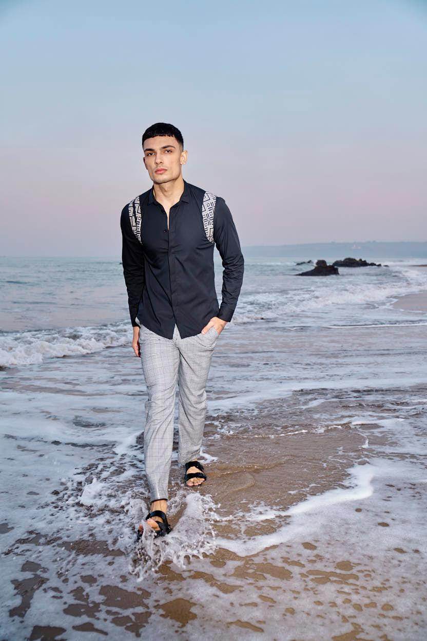 Black cotton poplin full sleeve shirt with contrast patterned jacquard harness detail on the shoulders and upper back. Concealed button down placket in the front.